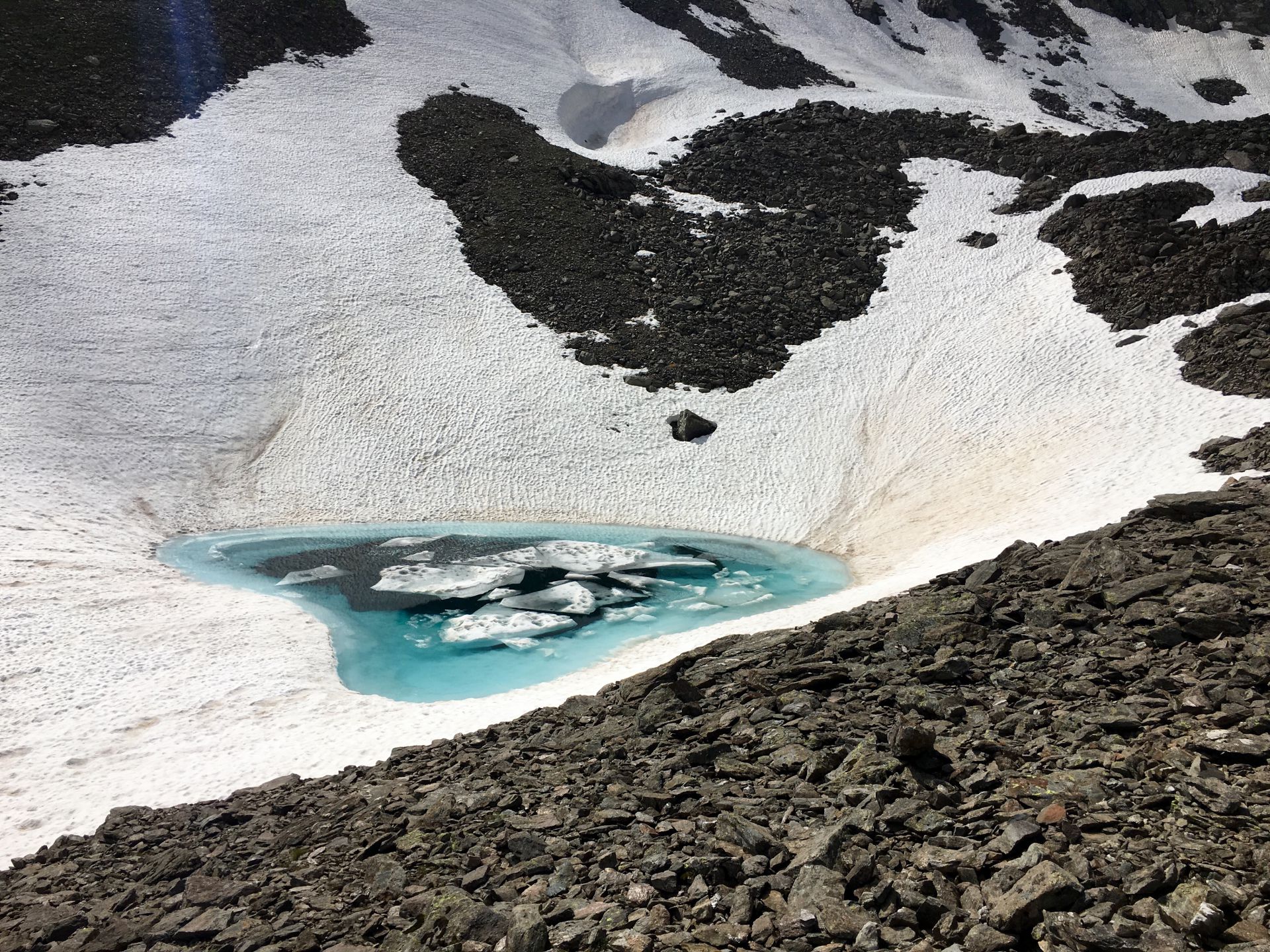 Die steilen Hangpassagen im Abstieg und die Gefahr, bei einem Ausrutschen in einem hellblau schimmernden Eissee zu landen, flössen Respekt ein. Die Schneehindernisse präsentieren sich aber weniger heikel als befürchtet. Viele Hundert Meter tiefer und mit etwas weichen Knien erreichen wir den Grünsee, wo wir eine lange Mittagpause einlegen.