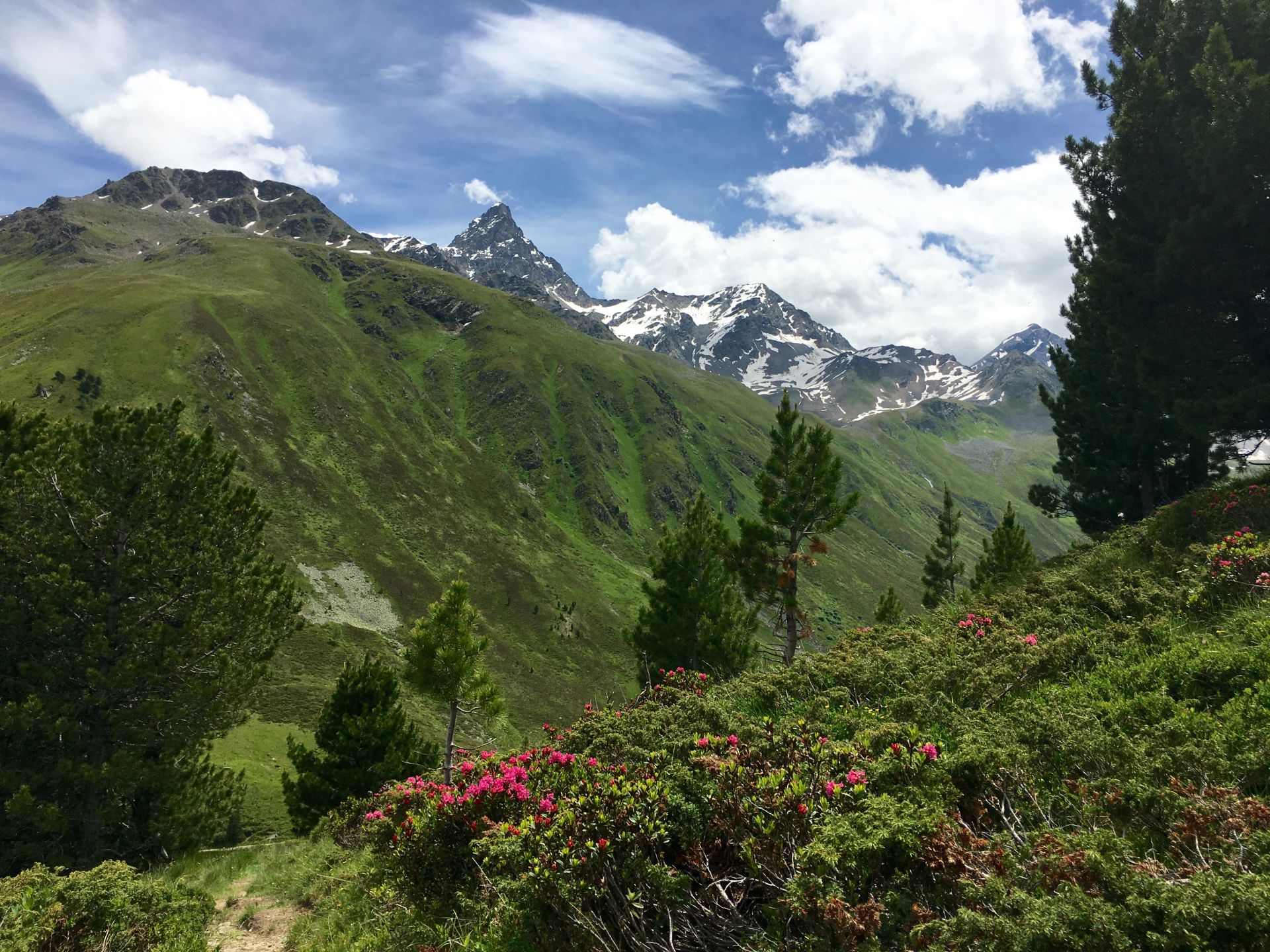 Jetzt geht es zuerst runter…mit Alpenrosen und Piz Kesch vor Augen
