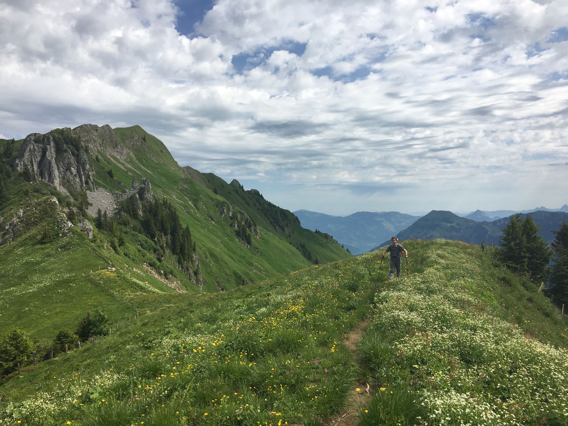 Meteoschweiz sagt einen schwülheissen Tag voraus, so starten wir die Tour auf dem höchstmöglichen Punkt, der Alp Gummen oberhalb von Wirzweli. Die Terrasse der schönen Beiz und die hausgemachte Schwarzwäldertorte laden zur Musse, doch dafür ist es zu früh. Wir ziehen los und folgen dem Fahrsträsschen zur Schellenfluehütte, wo der Bergweg zum Grat abzweigt. Der Pfad führt steil durch hochstehendes Gras zum Pass südlich des Arvigrats. Die Sonne lässt auf sich warten, es tröpfelt sogar – soviel zur Treffgenauigkeit von Bucheli & Co.