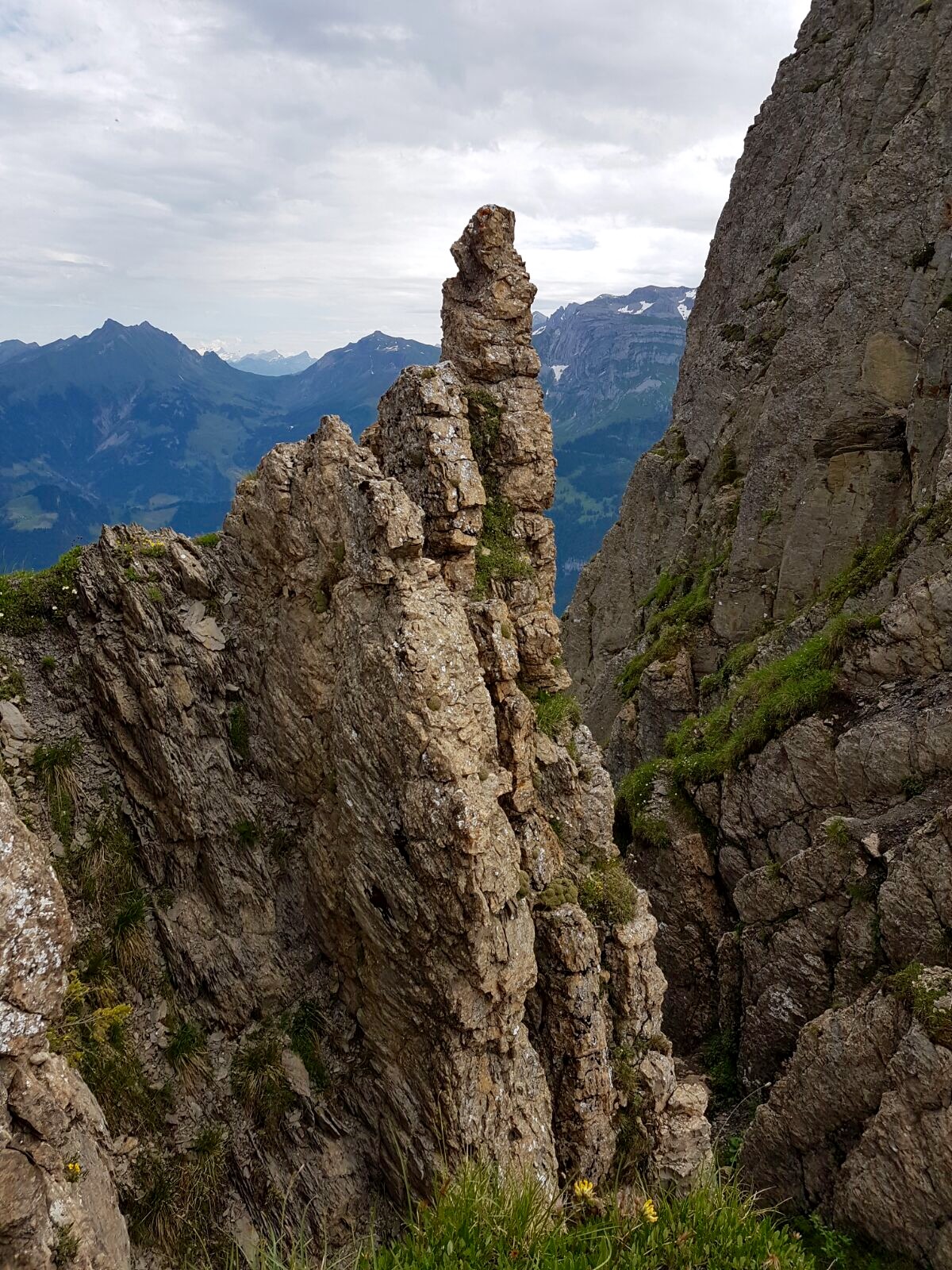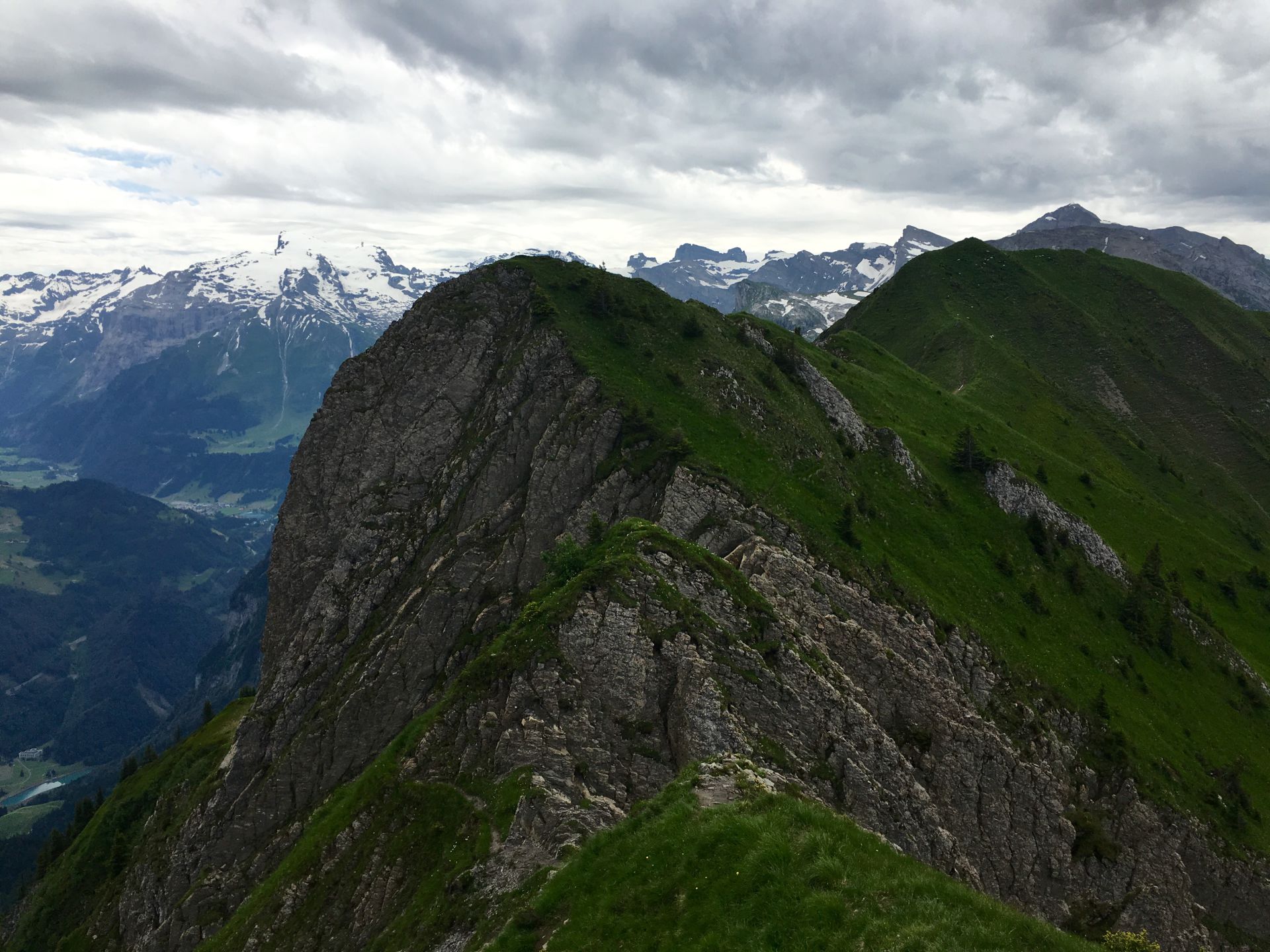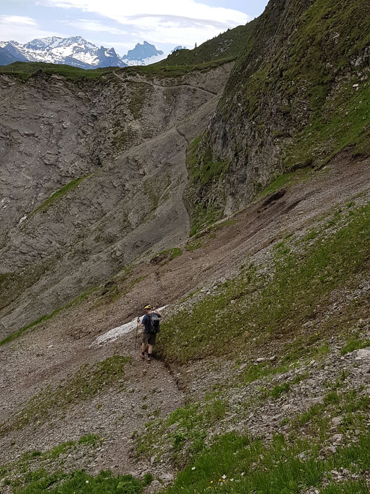 Nach den Felsscharten kommt wieder Grasland – wie als ob nichts gewesen wäre. Nur wenige Meter weiter weiden friedlich Schafe auf den steilen Gratflanken. Wir laufen beeindruckt weiter und sinnieren darüber, wen der Teufel hier wohl bestrafen wollte. Dann erreichen wir Chrüzibödmer, ein heideähnliches Gelände, das die perfekte Aussichtsplattform für unsere Lunchpause bietet. Grossartig, die Sicht auf den Grossen und den Kleinen Spannort, den Titlis und die Berner Alpen. Vor uns trohnt der Widderfeldstock, der bereits die nächste Touridee generiert, für heute liegt das aber nicht mehr drin.
