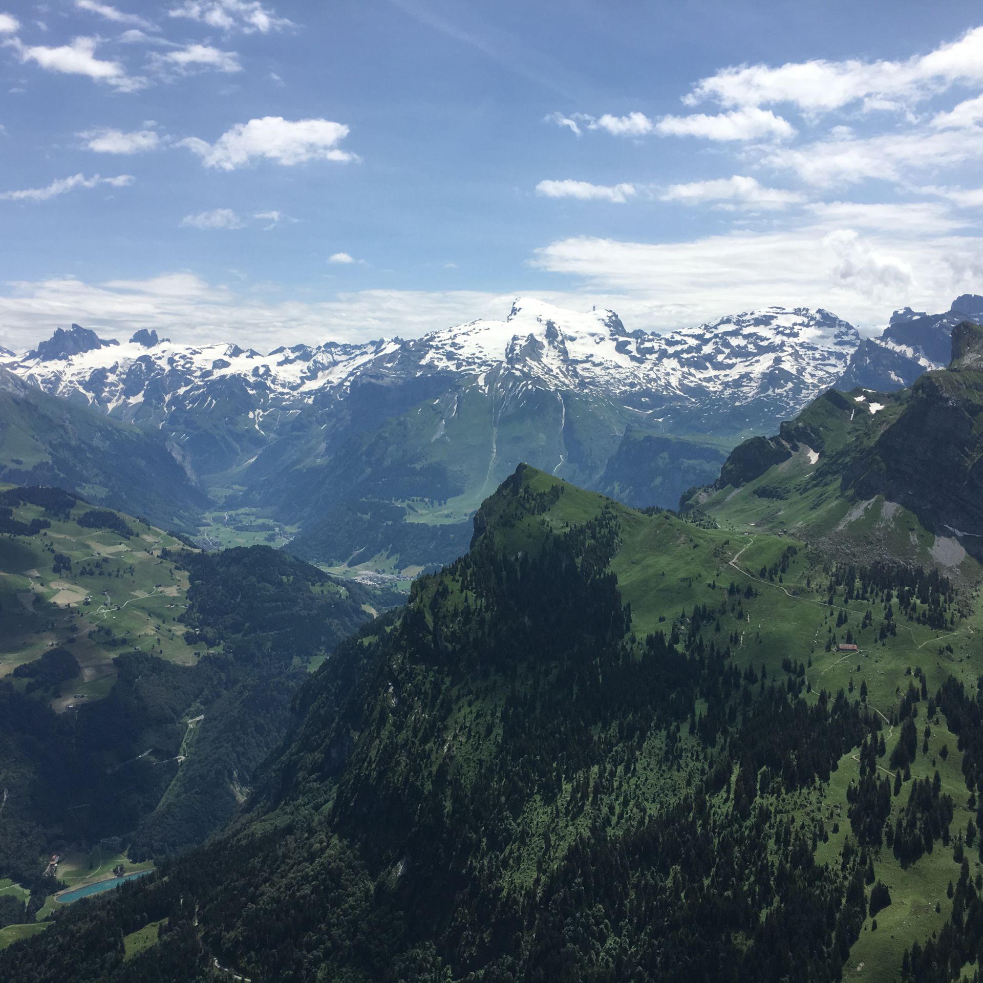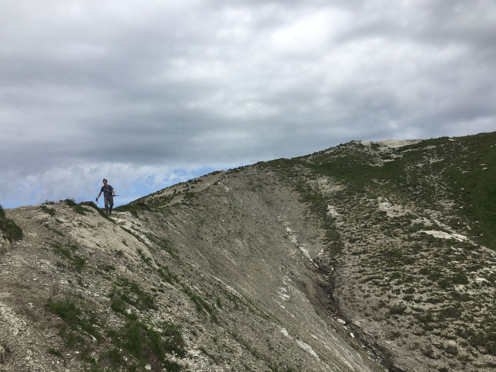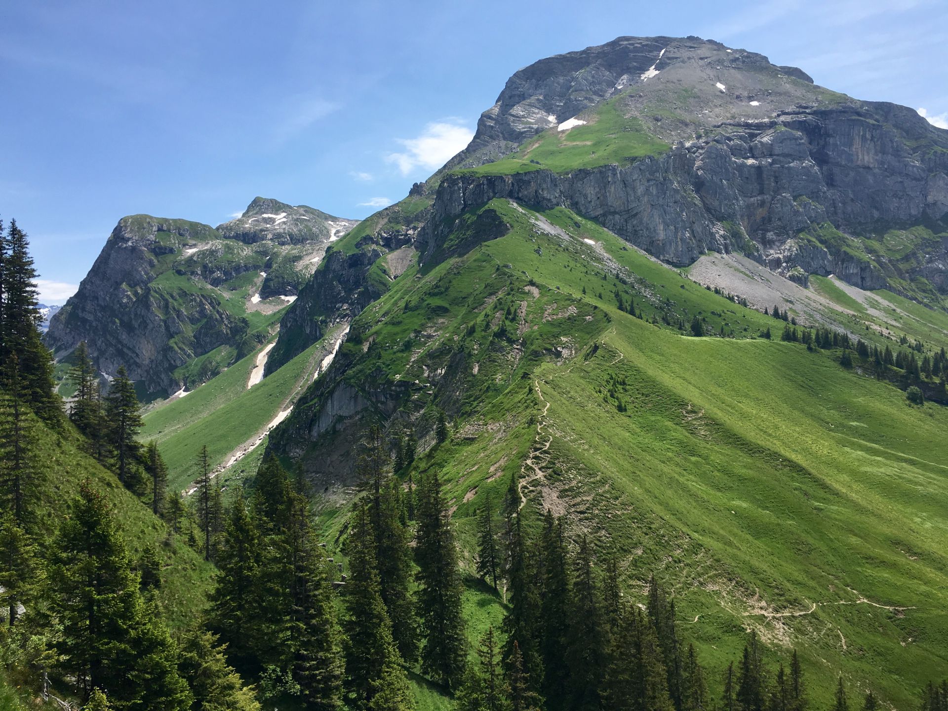 Nach den Felsscharten kommt wieder Grasland – wie als ob nichts gewesen wäre. Nur wenige Meter weiter weiden friedlich Schafe auf den steilen Gratflanken. Wir laufen beeindruckt weiter und sinnieren darüber, wen der Teufel hier wohl bestrafen wollte. Dann erreichen wir Chrüzibödmer, ein heideähnliches Gelände, das die perfekte Aussichtsplattform für unsere Lunchpause bietet. Grossartig, die Sicht auf den Grossen und den Kleinen Spannort, den Titlis und die Berner Alpen. Vor uns trohnt der Widderfeldstock, der bereits die nächste Touridee generiert, für heute liegt das aber nicht mehr drin.