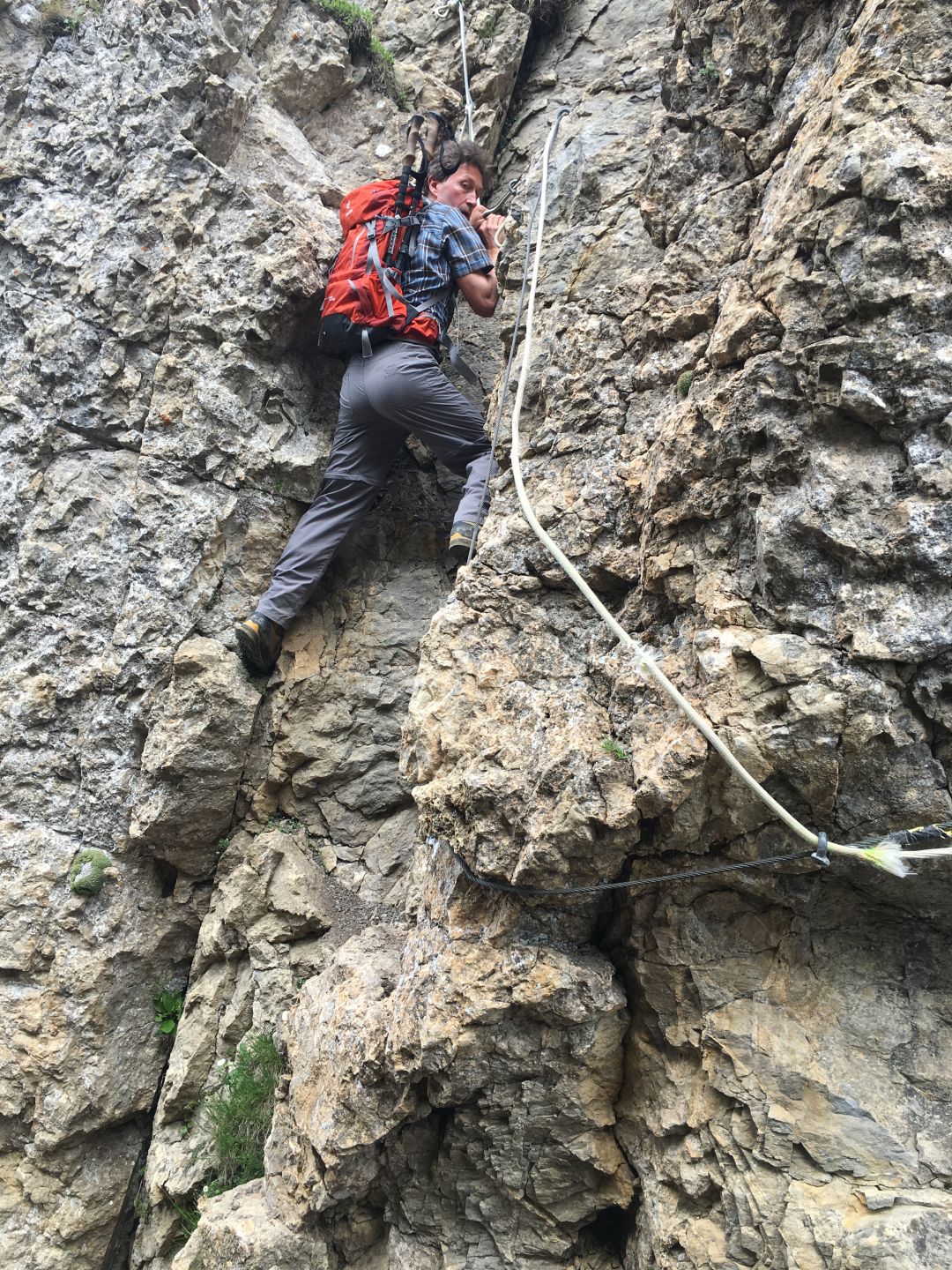 Der Abstieg in die Scharte verlangt etwas Geschick, trotz der Fixseile (Nachtrag 2023: Die Stelle gibt es wohl nicht mehr! Sonst wäre das keine rot-weiss markierte Wanderroute)