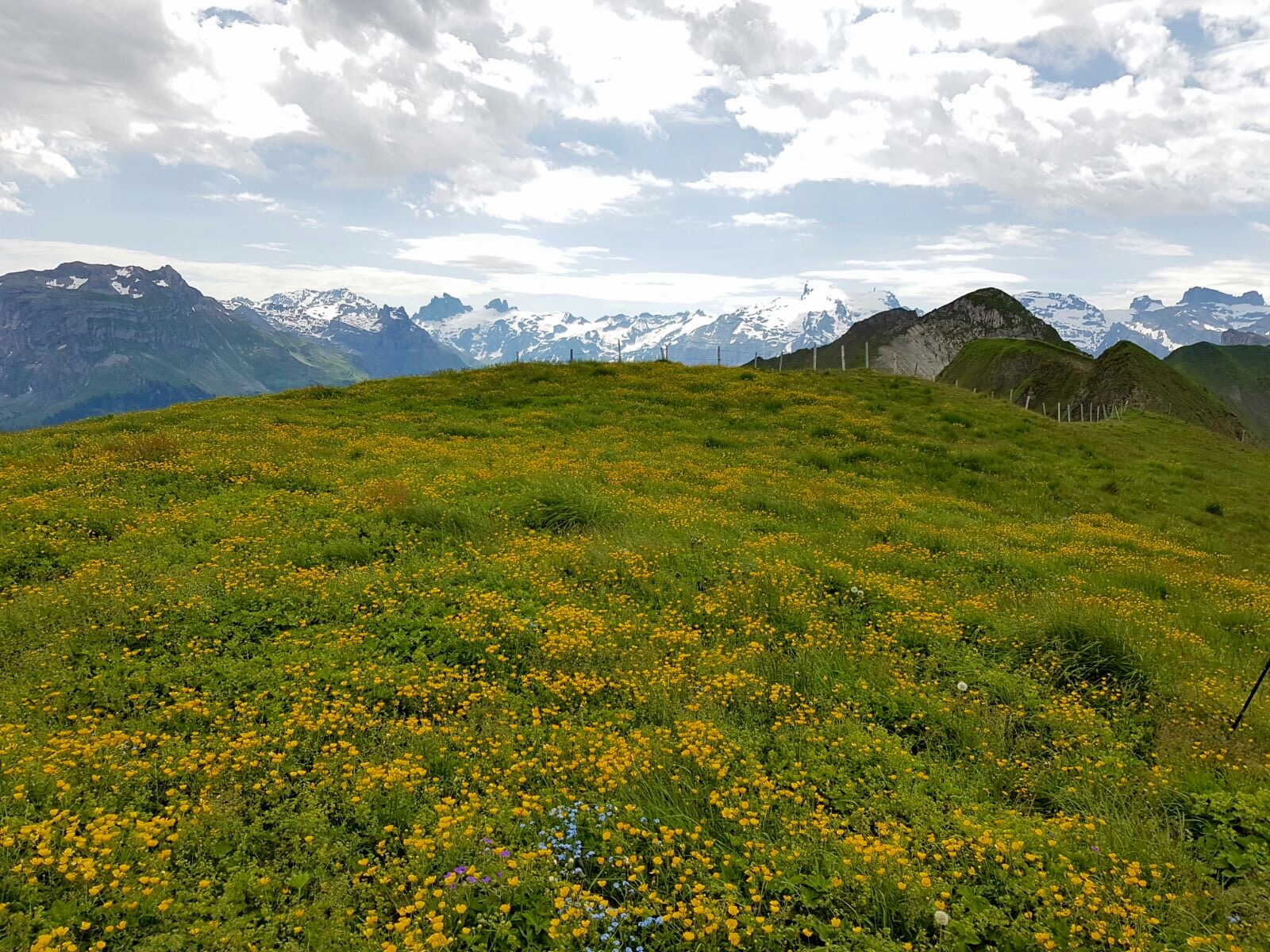 Oben angekommen beginnt gleich der Genussteil. Der Grat bietet eine einzigartige Sicht auf die bekannten Gipfel von Engelberg. Westlich schimmert der Sarnersee, hinter uns breitet sich der Vierwaldstättersee aus. Durch einen wahren Blumenwald führt der Pfad nun leicht steigend über den immer schmaler werdenden Gratrücken zum Gräfimattnollen. Dort wird der Gratrücken ganz breit, wir schweben über den Tälern und bekommen nun auch die Berner Oberländer Viertausender zu Gesicht. Auf dem gelbleuchtenden Plateau Gräfimattstand nehmen wir uns viel Zeit für eine Rundsichtpause.
