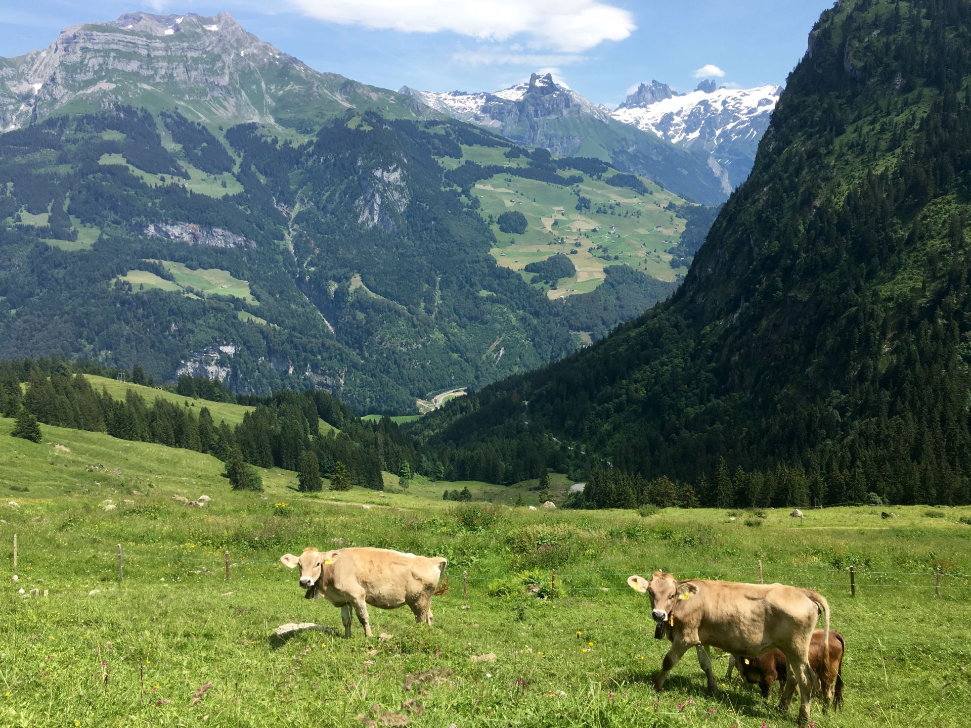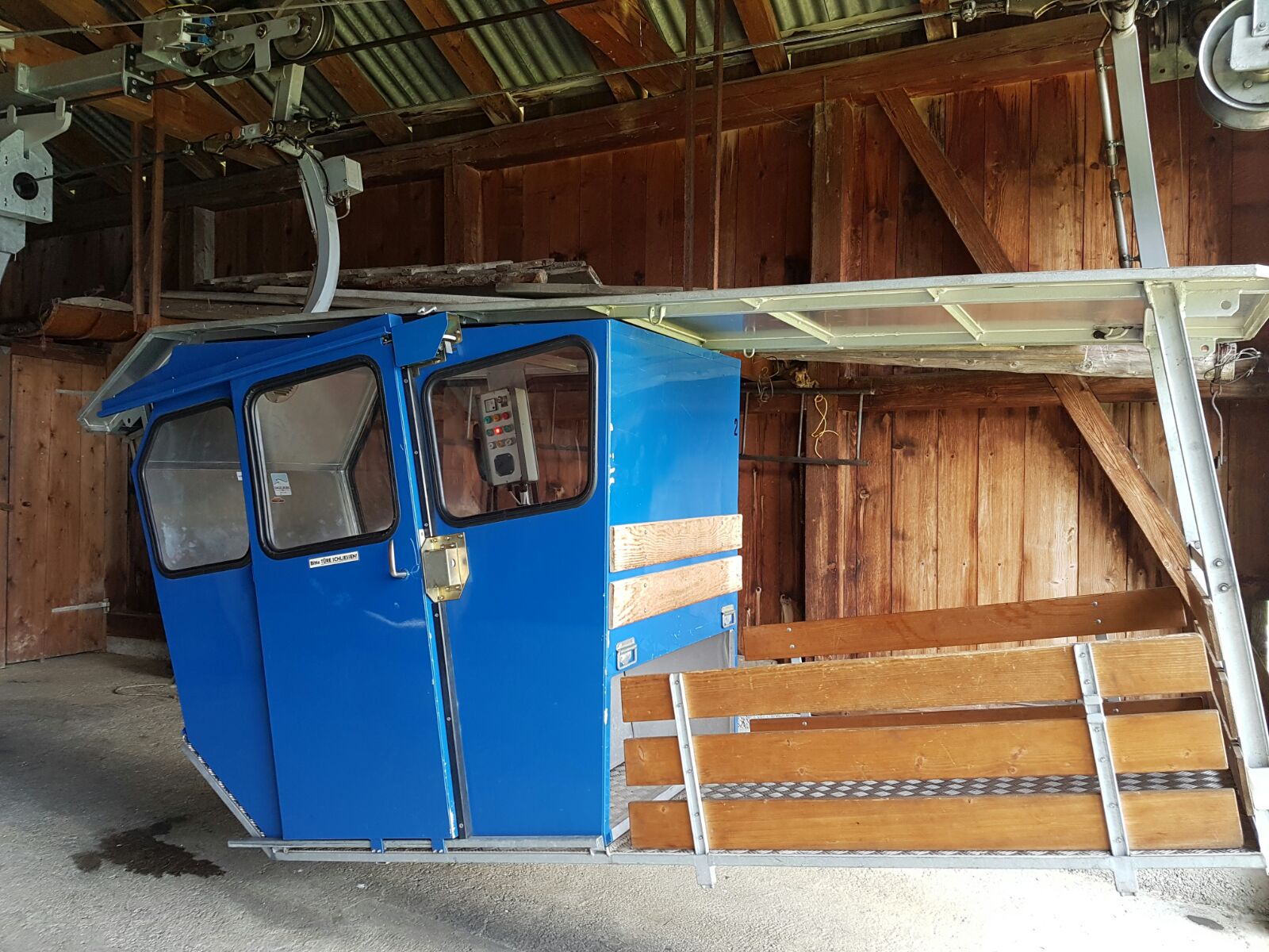 Auf dem Storeggpass erreichen wir wieder markierte Wege. Wir steigen nun ab zur Hüethütte, wo die Kühe den Pfad derart zertrampelt bzw. neue Wege geschaffen haben, dass wir den richtigen Weg nicht mehr finden (Tipp: bei der grünen Wasserstelle geht es direkt hinunter zur Hütte). Dann können wir noch etwas „auslaufen“ und peilen dabei Eggendössli an, wo uns eine blaue Seifenkiste erwartet. Die Bäuerin gibt uns telefonisch Anweisungen und dann lassen wir uns mitten auf ihren Bauernhof hinuntergondeln. Dort wird umgestiegen, eine zweite Kiste wird uns ganz hinunter ins Tal bringen. Ein toller Service. Nur acht Franken pro Person verlangt die Frau für beide Fahrten, wir runden gerne etwas auf.