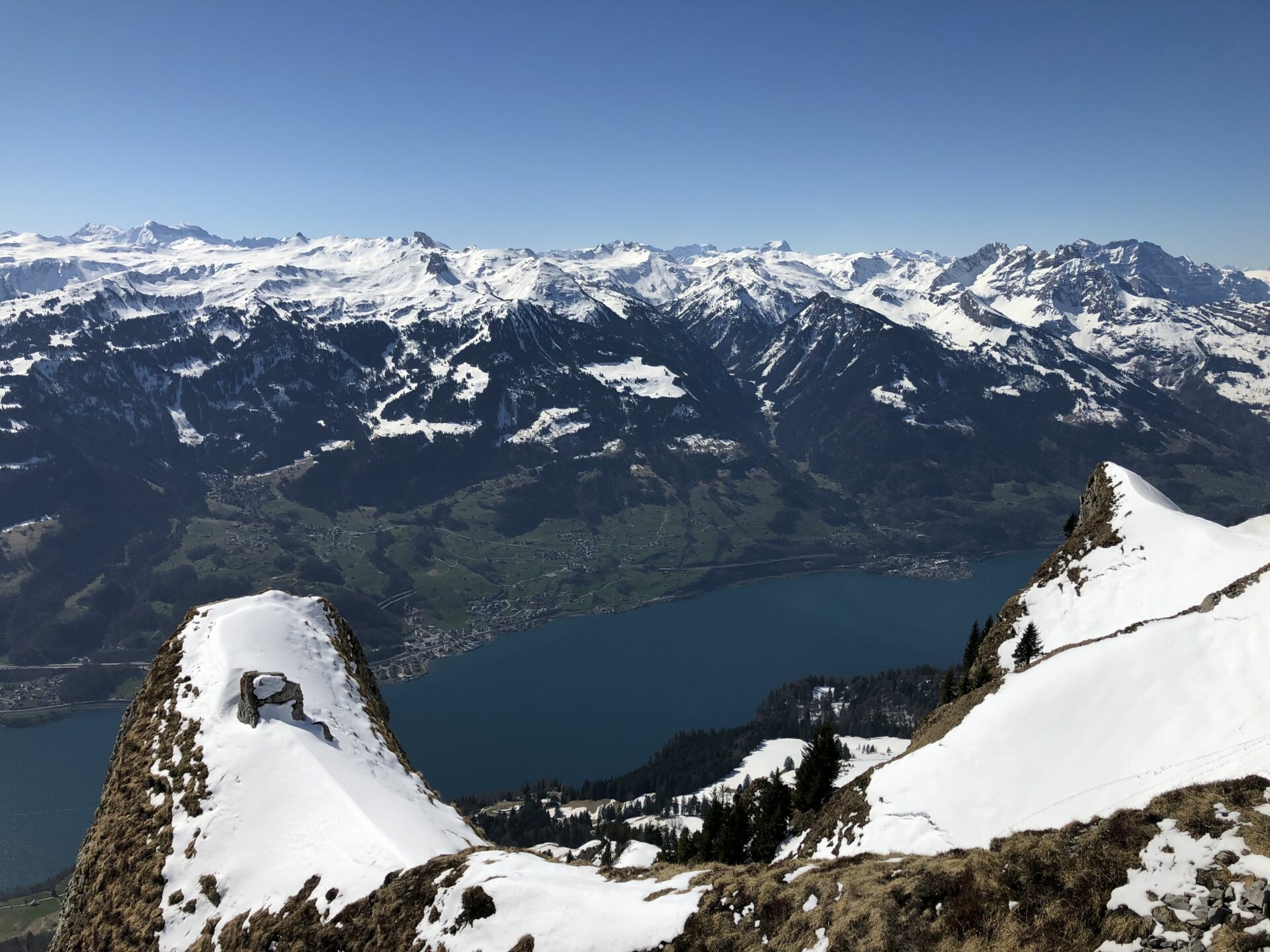 Im oberen Frümseltal wird es etwas steiler, aber nie wirklich anspruchsvoll. Die fast senkrechten Seitenwände von Brisi und Frümsel sind eindrücklich und aufgrund der Breite des Tals weit genug weg um nicht bedrohlich zu sein (Steinschlag, Wächtenabbrüche). Bald erkennen wir den „Punkt 2044“ an einer runden rotweissen Markierung. Der „Woweffekt“ ist damit nur noch Sekunden entfernt… So stehen wir gut zwei Stunden nach Abmarsch von der Alp Sellamatt auf dem Joch, wo grosses Kino auf uns wartet. Einerseits der Walensee gut 1500 Meter unter uns, aber auch der ganze Alpenkamm, der sich an diesem Kaiserwettertag besonders imposant zeigt. Die halbe Schweiz liegt uns hier zu Füssen. Letztere befreie ich dann rasch von den Schneeschuhen. Eine kleine Fläche mit trockenem Gras lädt zum Sonnenbad, ich strecke mich genüsslich für ein längere Pause aus. Es ist warm, die Jacke bleibt im Rucksacke, das Windstopper-Gilet genügt.