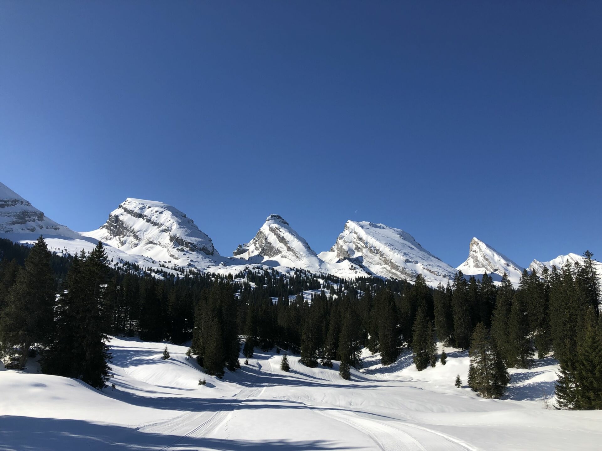 Schon bald zeigen sich uns Schibenstoll, Zuestoll, Brisi und Frümsel wie auf dem Präsentierteller. Die formschönen Kegel recken ihre Hälse selbstbewusst aus der lieblichen Alp Sellamatt in den Himmel, erstarrt und glänzend im durchgefrorenen Schneekleid. Was für ein Anblick! Zum Anbeissen.
