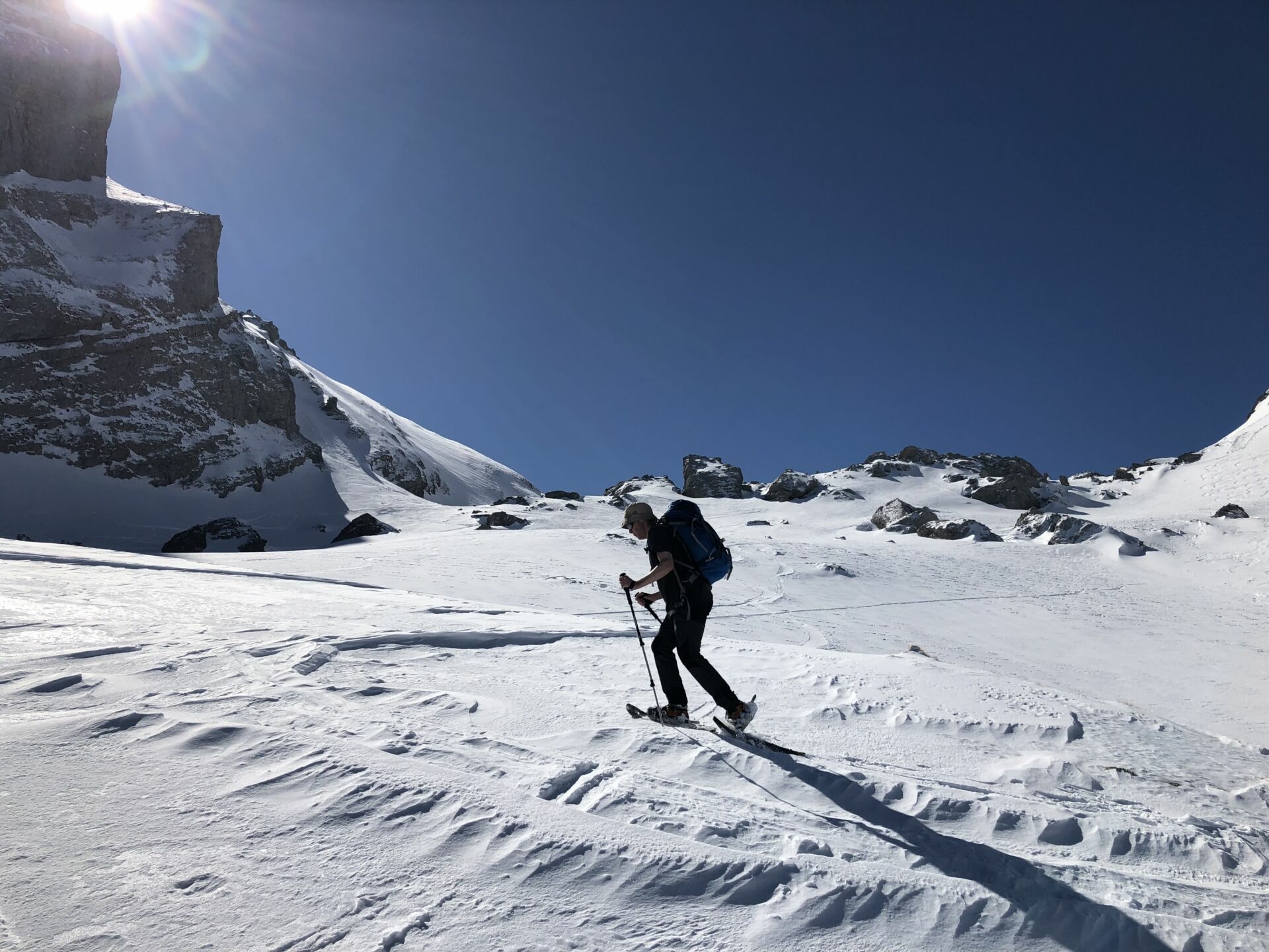 In einer ziemlich direkten Linie zielen wir nun auf das Frümseltal zu. Die harte Schneeunterlage ist mit einer dünnen Schicht Neuschnee überzogen. Das Spuren braucht nicht viel Kraft, so laufen wir zeitweise sogar nebeneinander. Wir kommentieren mal die mächtigen Wächten am Selun, mal die glänzende Flanke des Brisi, die ziemlich windgeprägt aussieht. Das gilt auch für die windbearbeitete Schneedecke um uns herum, die stellenweise an eine fein ziselierte Miniatur-Dünenlandschaft erinnert.
