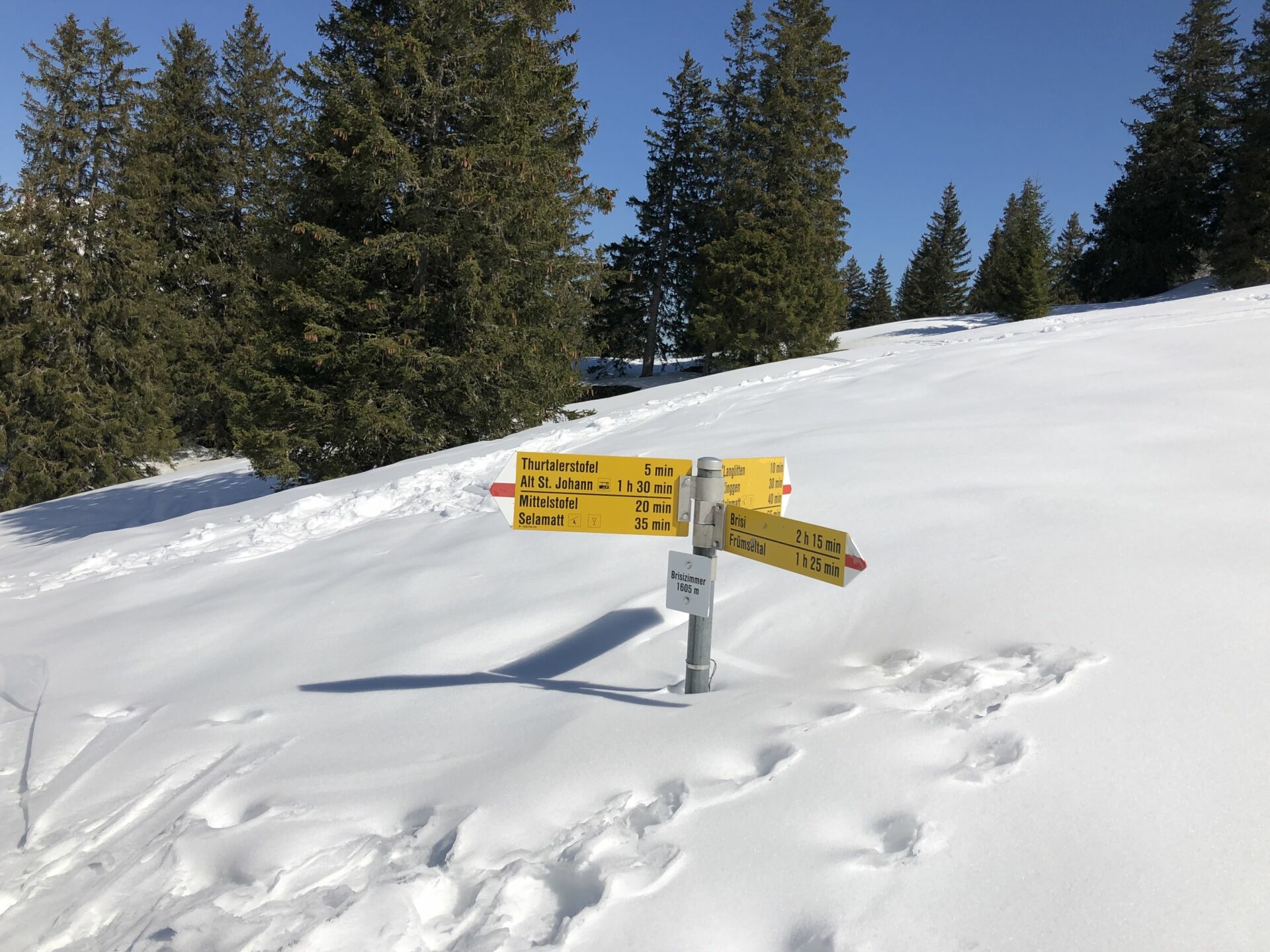 ,Nur eine Handvoll Autos belegt den Parkplatz an der Talstation der Sellamattbahn in Alt. St. Johann. Mountainbiker und Wanderer bereiten ihre Touren vor, die wenigen Skifahrer mit ihren Anzügen und Helmen wirken wie Ausserirdische. Wir lassen uns bequem hochgondeln, bald wird aus grün weiss, und an der Bergstation erwarten uns perfekt präparierte Skipisten. Der Himmel ist knallblau, die Luft noch kalt, und der Schnee knirscht unter unseren Füssen. Wir lassen die Schneeschuhe im Rucksack und folgen dem schön gespurten Winterwanderweg.