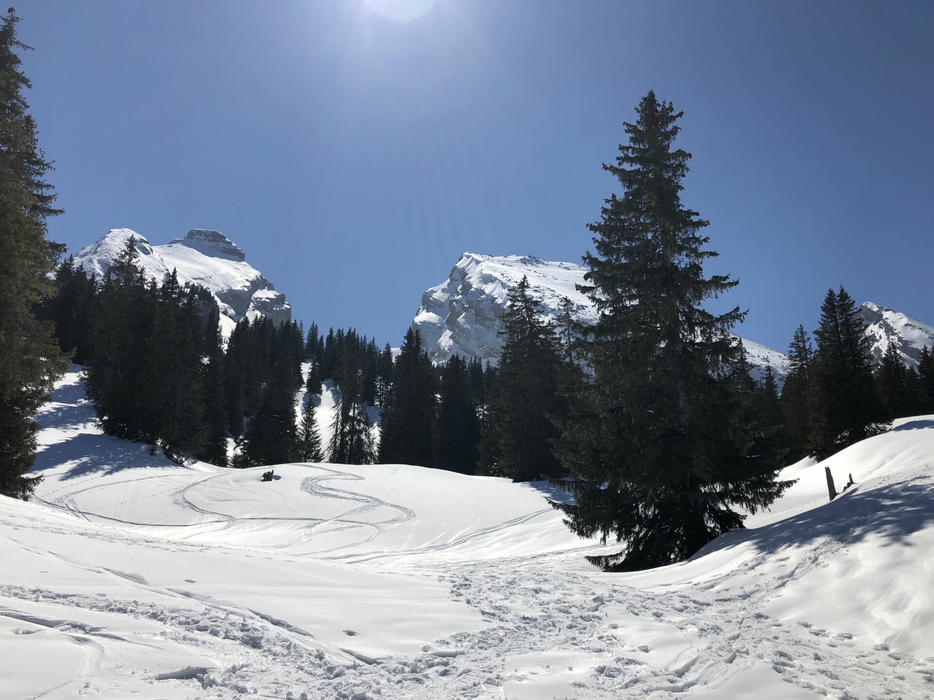 Für den Abstieg wählen wir am unteren Ende des Frümseltals die „Diretttissima“ durch den offenen Wald des „Brisizimmers“, wo der Schnee noch fast 2 Meter hoch liegt, wie ein tief vergrabenes Wanderschild erkennen lässt. Etwas weiter unten stossen wir wieder auf den Winterwanderweg und gwaggeln dann gemütlich zurück zur Alp Sellamatt, wo die fast leere Terrasse zur bewirteten Fortsetzung des intensiven Sonnenbades einlädt.