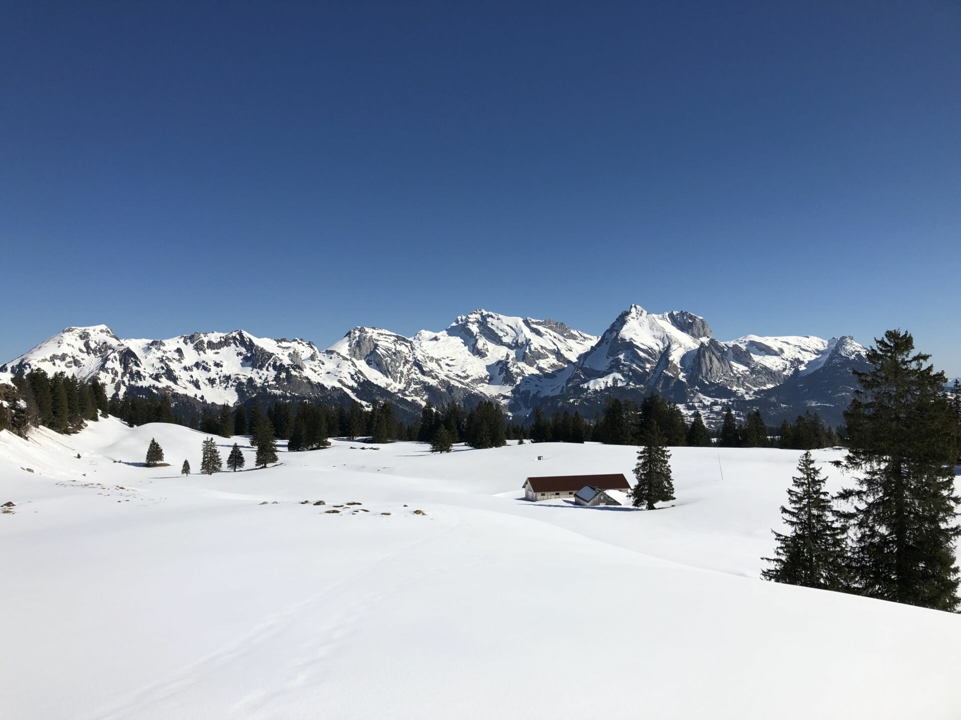 Der Weg steigt nur sanft an, also bleibt viel Zeit für Gespräche und die mantramässige gegenseitige Beteuerung, dass es wohl heute nichts Schöneres gibt als gerade hier zu sein. Diese Churfirsten sind so einzigartig – jeder für sich alleine und als Gesamtkomposition. Höchst vergnügt erreichen wir nach einer knappen Stunde die Breitenalp, wo der Winterwanderweg zur Sellamatt zurückdreht und wir die Schneeschuhe montieren.