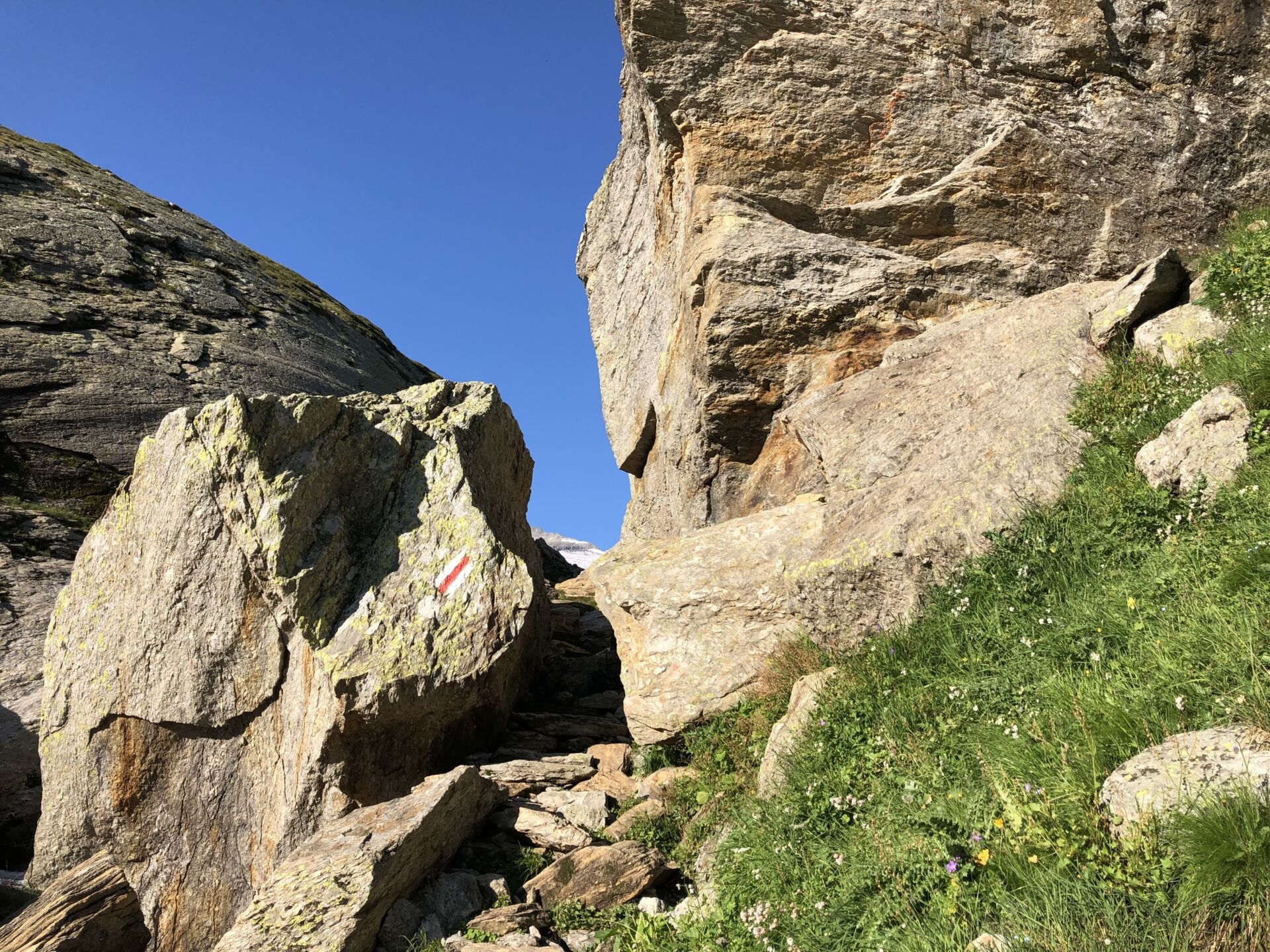 Etwas oberhalb der Ebene treffe ich wieder auf den rotweiss markierten Wanderweg vom frühen Morgen, der mich zur Bocchetta di Val Maggia führen soll, dem Übergang nach Italien. Der Pfad führt stellenweise über Blöcke, die das Marschtempo drastisch verlangsamen. Das friedliche Gurgeln des Bachs sorgt danebst für angenehme Ablenkung.