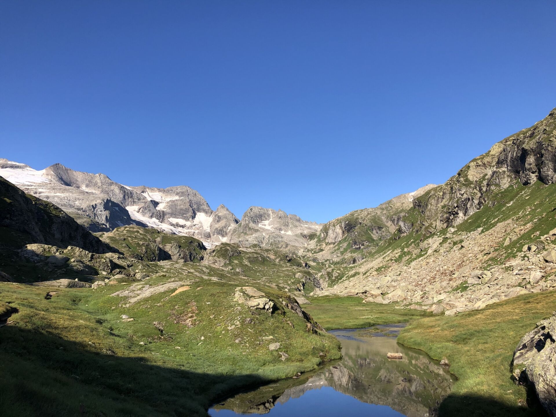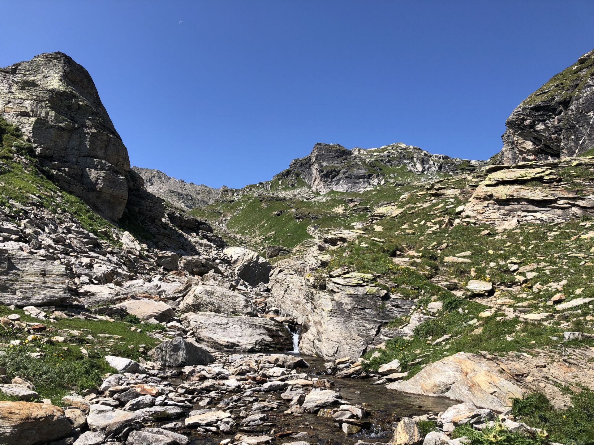 Ich verlasse das technisierte Robiei (Bahnen, Stromleitungen, Staumauer, Gebäude…) und steige entlang eines Bachs in Richtung Wildnis. Nach einer kurzen Steigung verengt sich das Tälchen, ich schmunzle über einen Felsen, der sich wie eine Fasnachtsmaske präsentiert. Dahinter ist es flacher und schön wie im Bilderbuch: das klare Wasser, die grünen Alpwiesen, die grauen Felsen und das leuchtende Weiss des Basòdino-Gletschers.