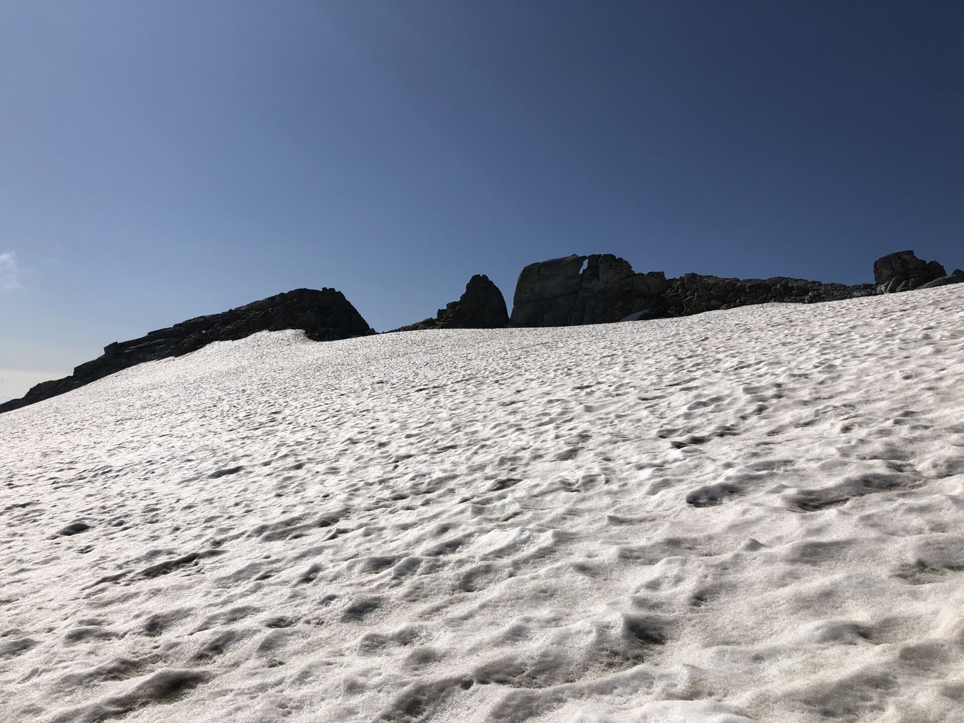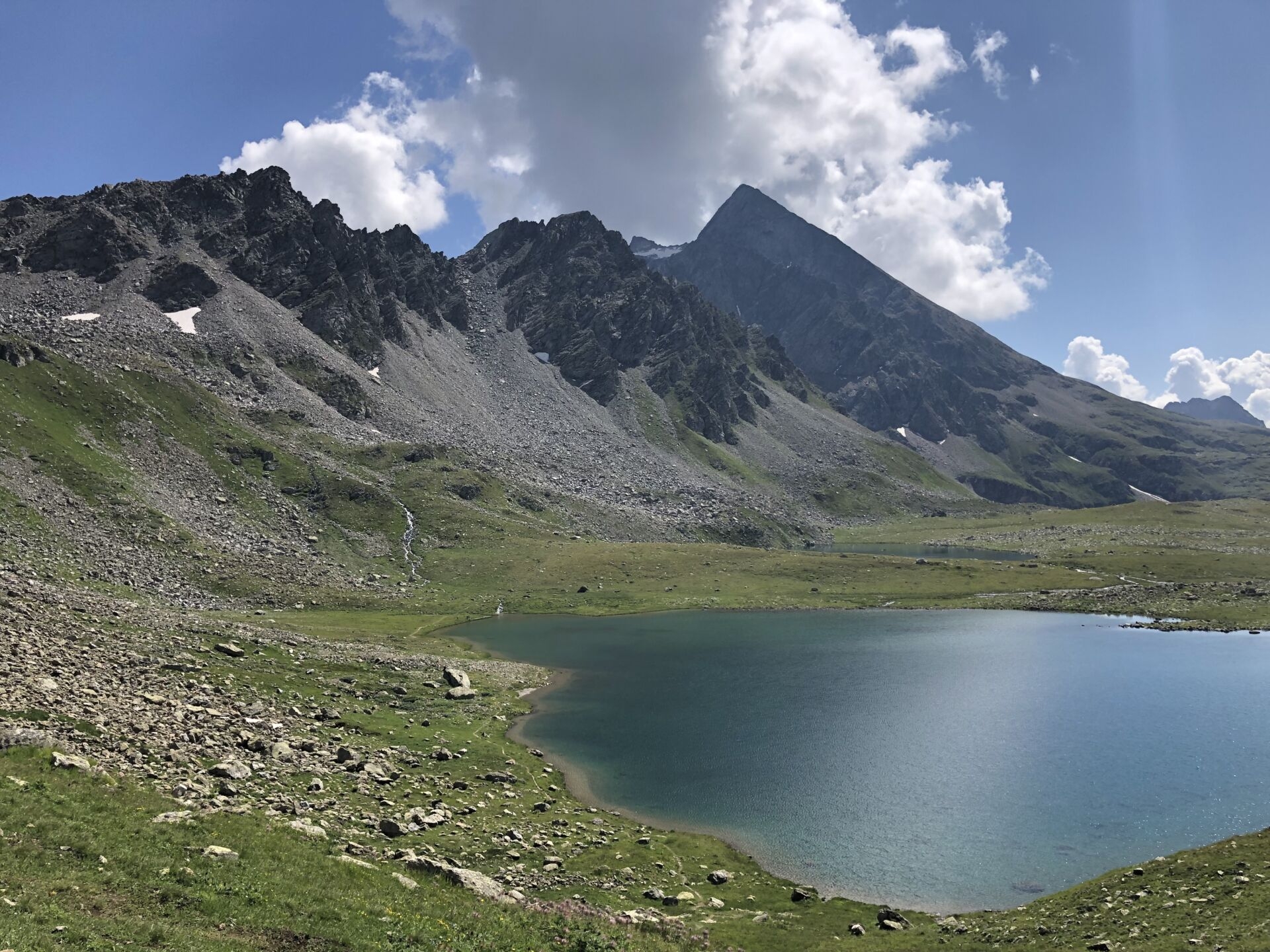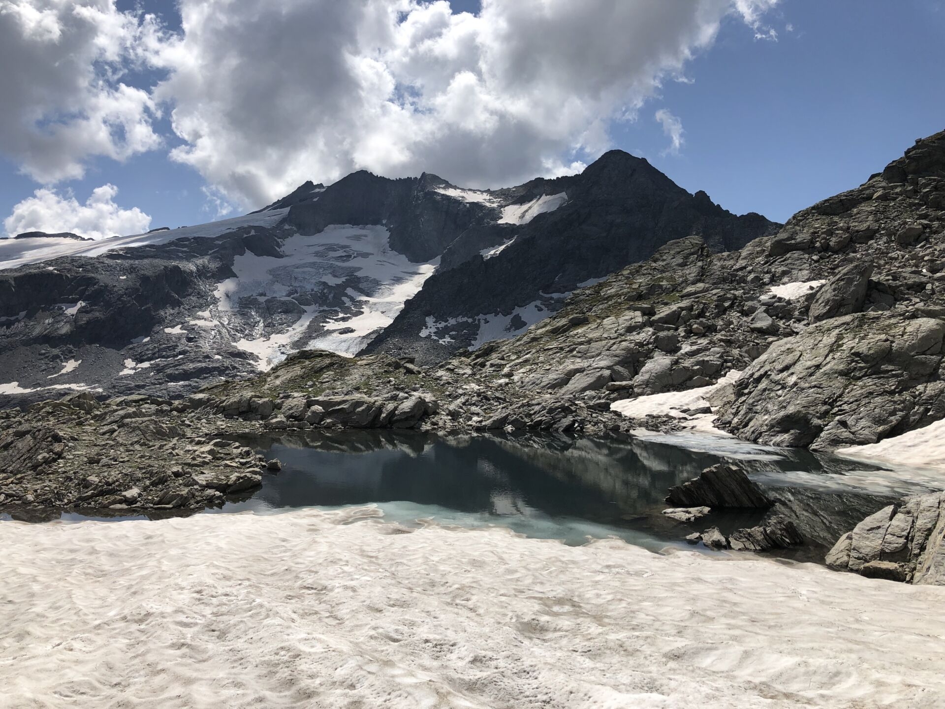 Nach den Blöcken folgt eine letzte, giftige Steigung über die östliche Talflanke zum Pass, der mich ziemlich ins Schnaufen bringt. Ich halte ein paar Mal an, um die Puls- und Atemfrequenz zu senken. Ein kleiner Schmelzwassersee wird gerne als Ausrede für eine Fotosession mit einem Blick zurück zum Basòdino genutzt.