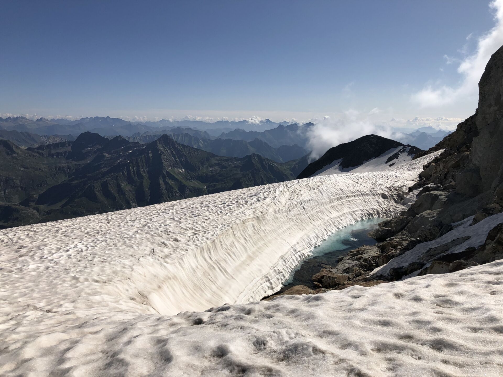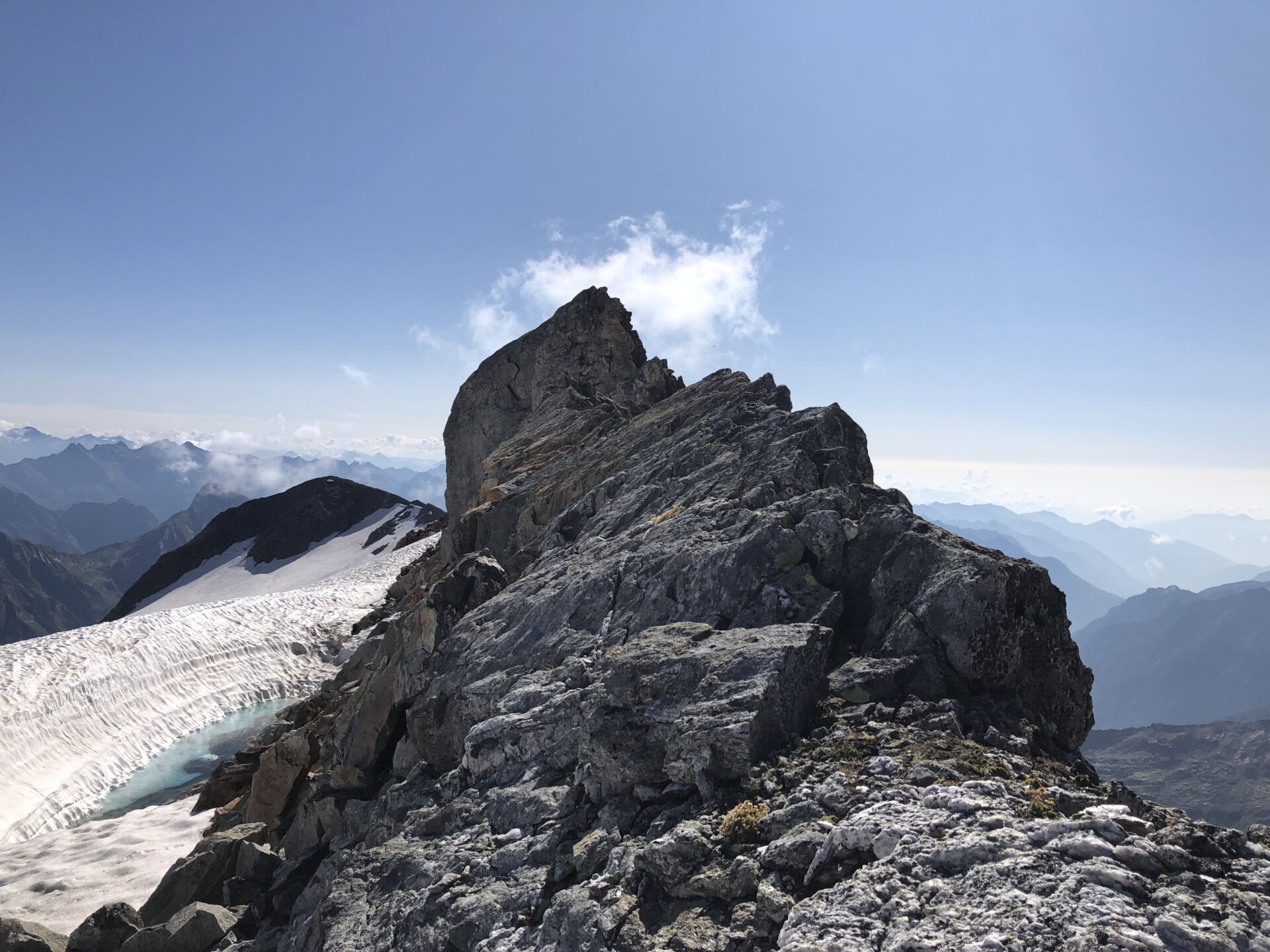 Kurz vor Elf blicke ich über die Gratkante nach Süden in die Lombardei und zur Monte Rosa-Gruppe. Nun würden noch rund 180Hm Block- und Schuttgrat zum Gipfel folgen, auf die ich aber aufgrund der fortgeschrittenen Zeit verzichte. Zudem will ich in diesem Gelände auf keinen Fall einen Fuss verstauchen, denn ich bin – trotz des prächtigen August-Sonntags – mutterseelenalleine am Berg unterwegs.