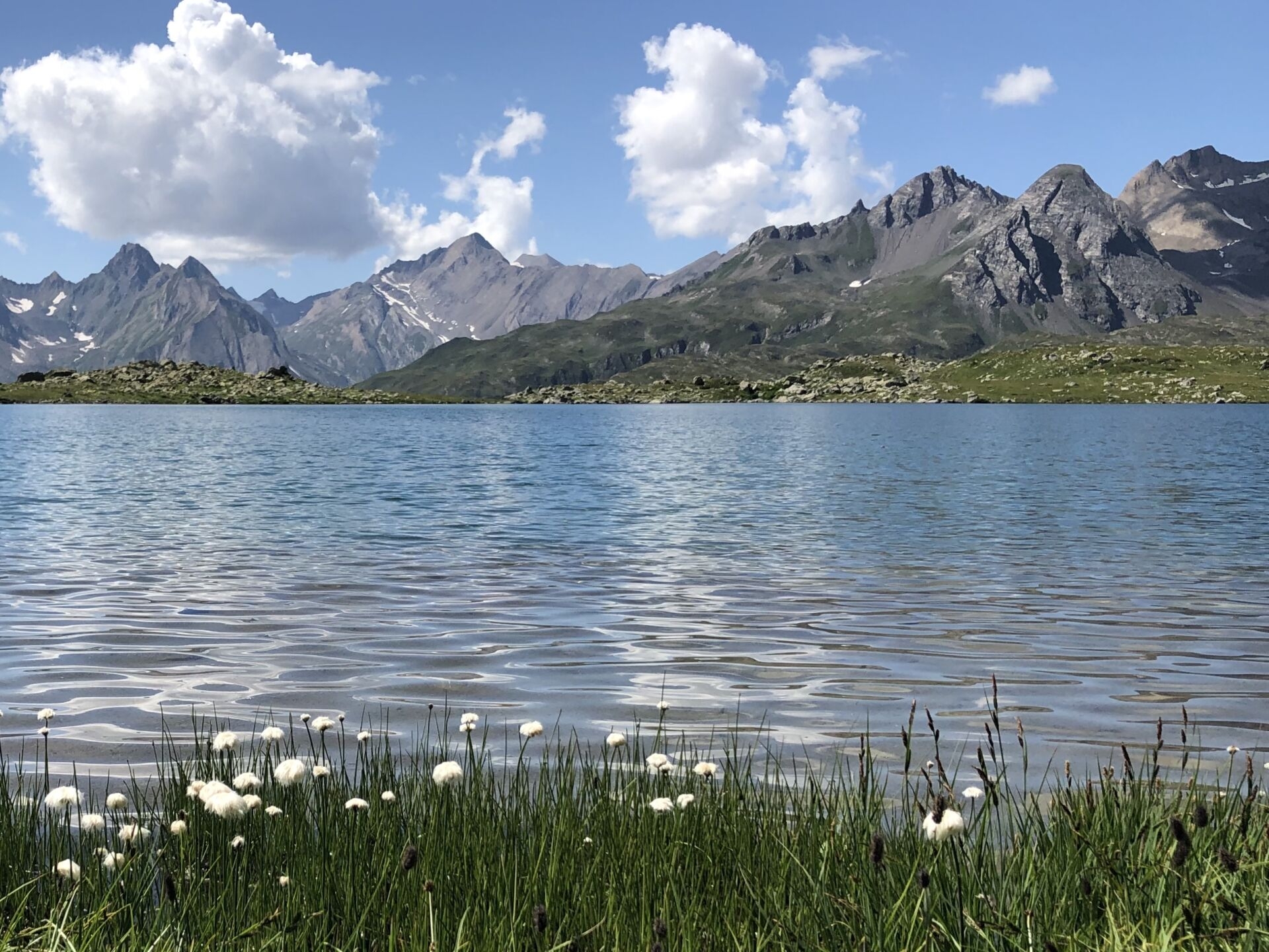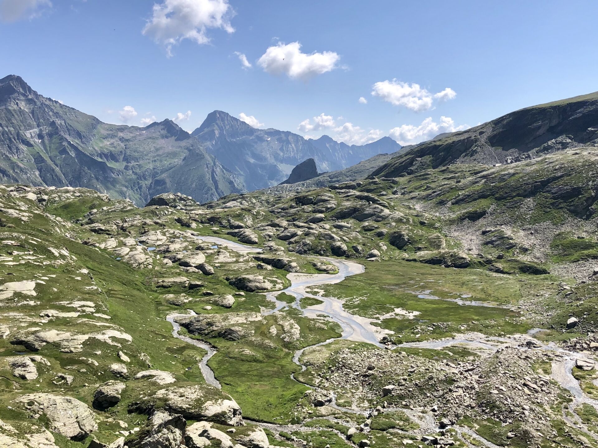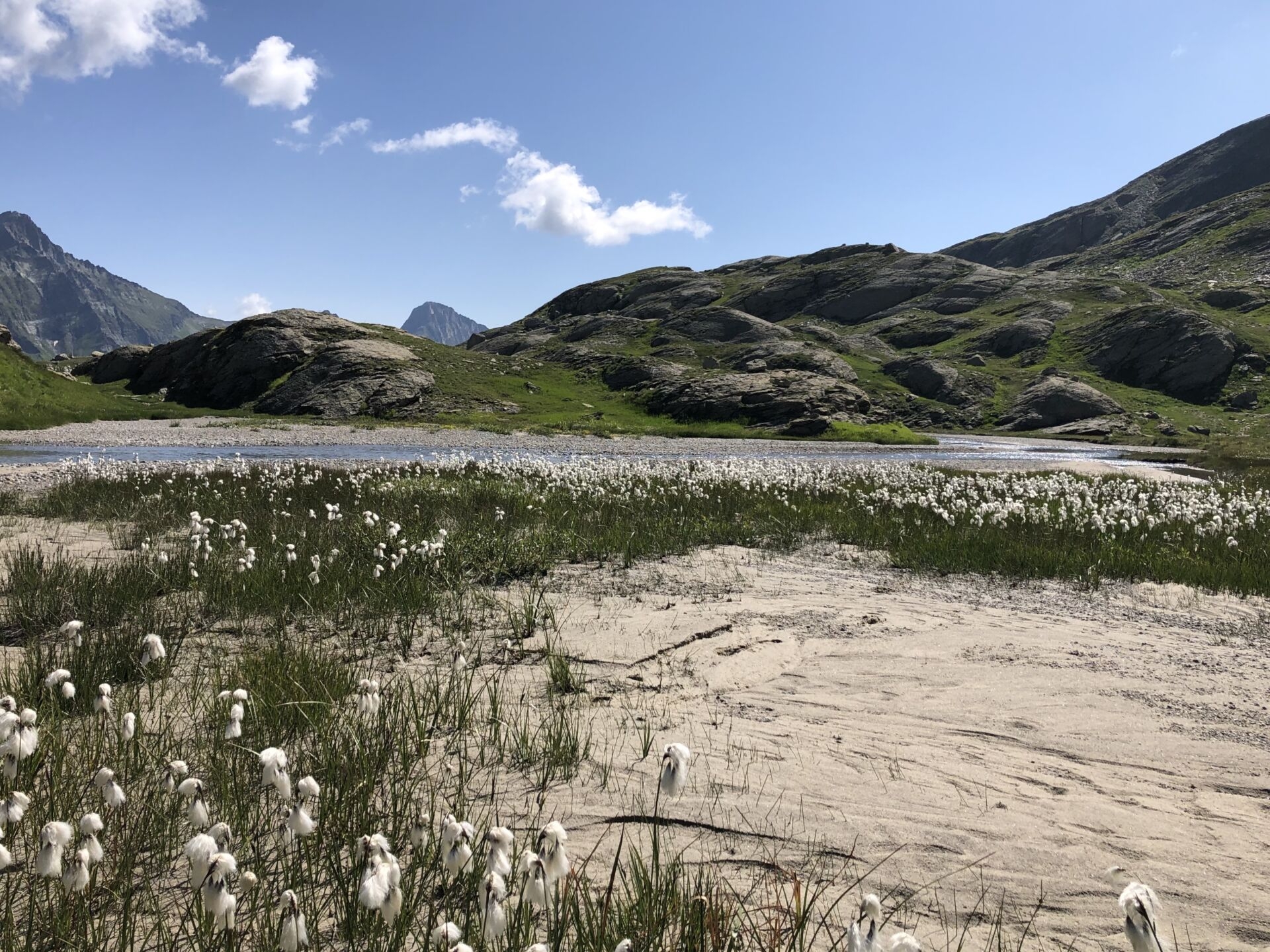 So verlasse ich den Pfad der Aufstiegsroute an der Spitzkehre auf ca. 2350m und suche mir einen Weg durch die Felsen und über die Bachläufe zum Piano del Ghiacciaio im Valletta di Fiorina. Damit spare ich nicht nur Höhenmeter, sondern komme auch in den Genuss einer grossartigen, von Wasser, Sumpf und Sand durchgezogenen und mit Blumen (Wollgras) geschmückten Szenerie. Der perfekte Picknickplatz! Und nicht nur das – auch ein guter Refillplatz für die bereits leeren Wasserflaschen, denn der Wind und die pralle Sonne fordern heute ihren Tribut.