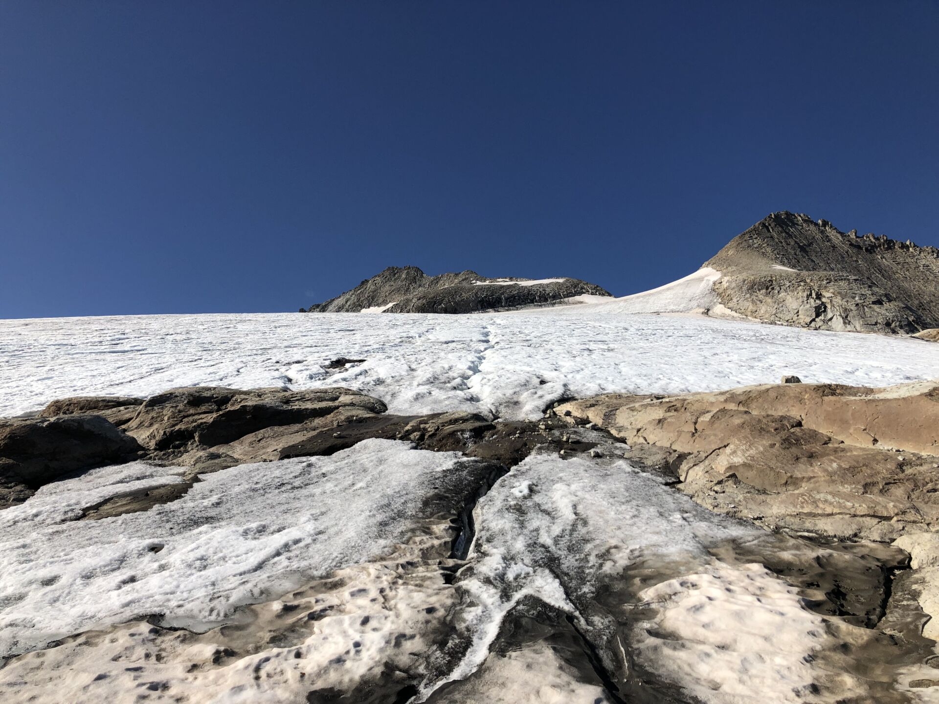 Etwa auf der 2850m-Höhenkurve schnalle ich meine Steigeisen an und betrete den aperen Gletscher. Gletscher sollte man eigentlich nicht alleine begehen, aber dieser komplett spaltenfreie Eispanzer bildet wirklich eine Ausnahme. Weiter oben ist er noch schneebedeckt, ich stapfe zielstrebig auf den Ostgrat mit seinen markanten Felsformationen zu.