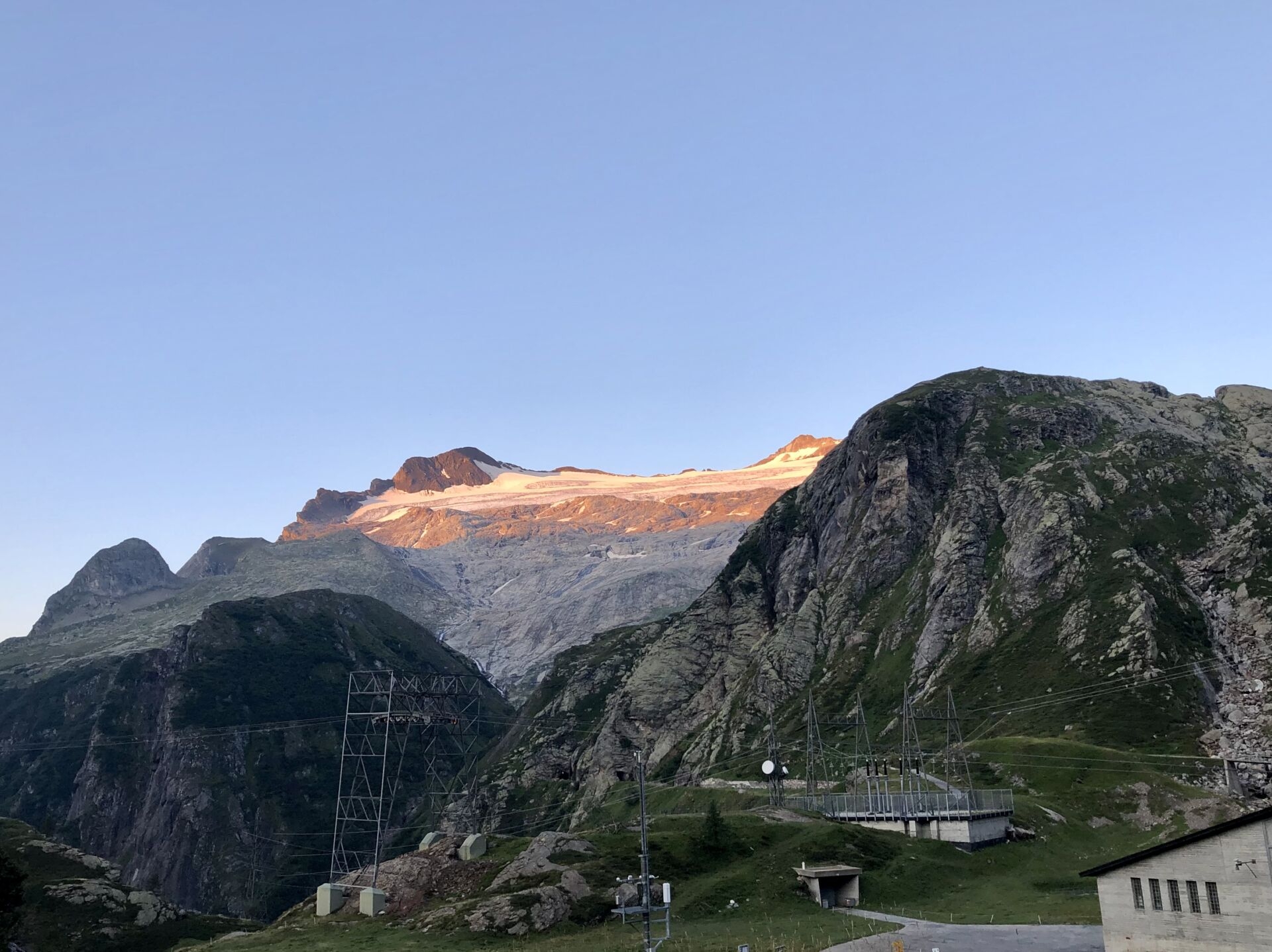 Ich schlafe gut im ehemaligen Arbeiterheim in Robiei. Das zum Albergo umfunktionierte Türmchen ist zwar in die Jahre gekommen, aber die Zimmer sind ganz ok. Eine Dusche gibt es auch, im Unterschied zur nahegelegenen SAC-Hütte. Nur Frühstück wird strikt erst um 7.30 Uhr serviert, das hatte ich nicht einberechnet. Ich blicke schon um 6.00 Uhr sehnsüchtig zum rotbeleuchteten Basòdino-Gletscher, entscheide mich aber, auf den feinen Cappuccino, die Kaloriendosis und das bestellte Lunchpaket zu warten. So laufe ich um 7.45 Uhr eher spät los für die lange Tour.