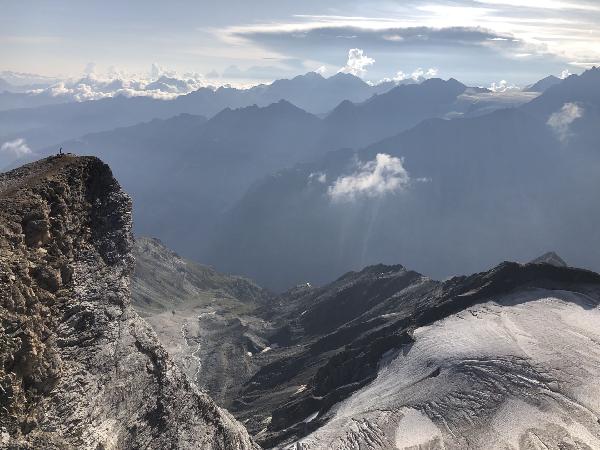 Blick ins Mattertal, in der Bildmitte glänzt das Dach der Topalihütte (auf dem Distelgrat)