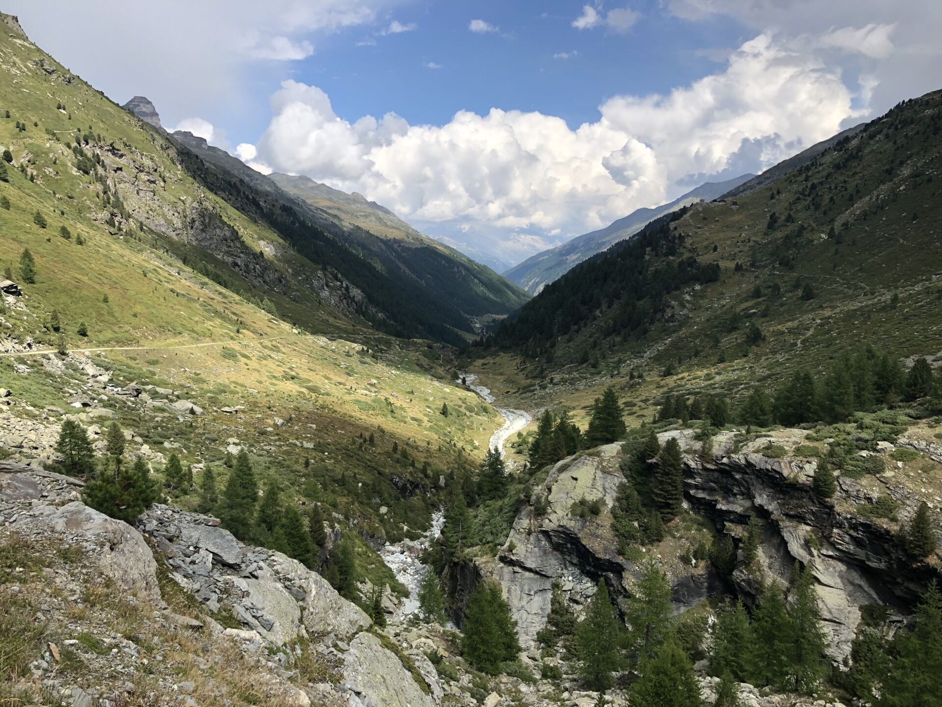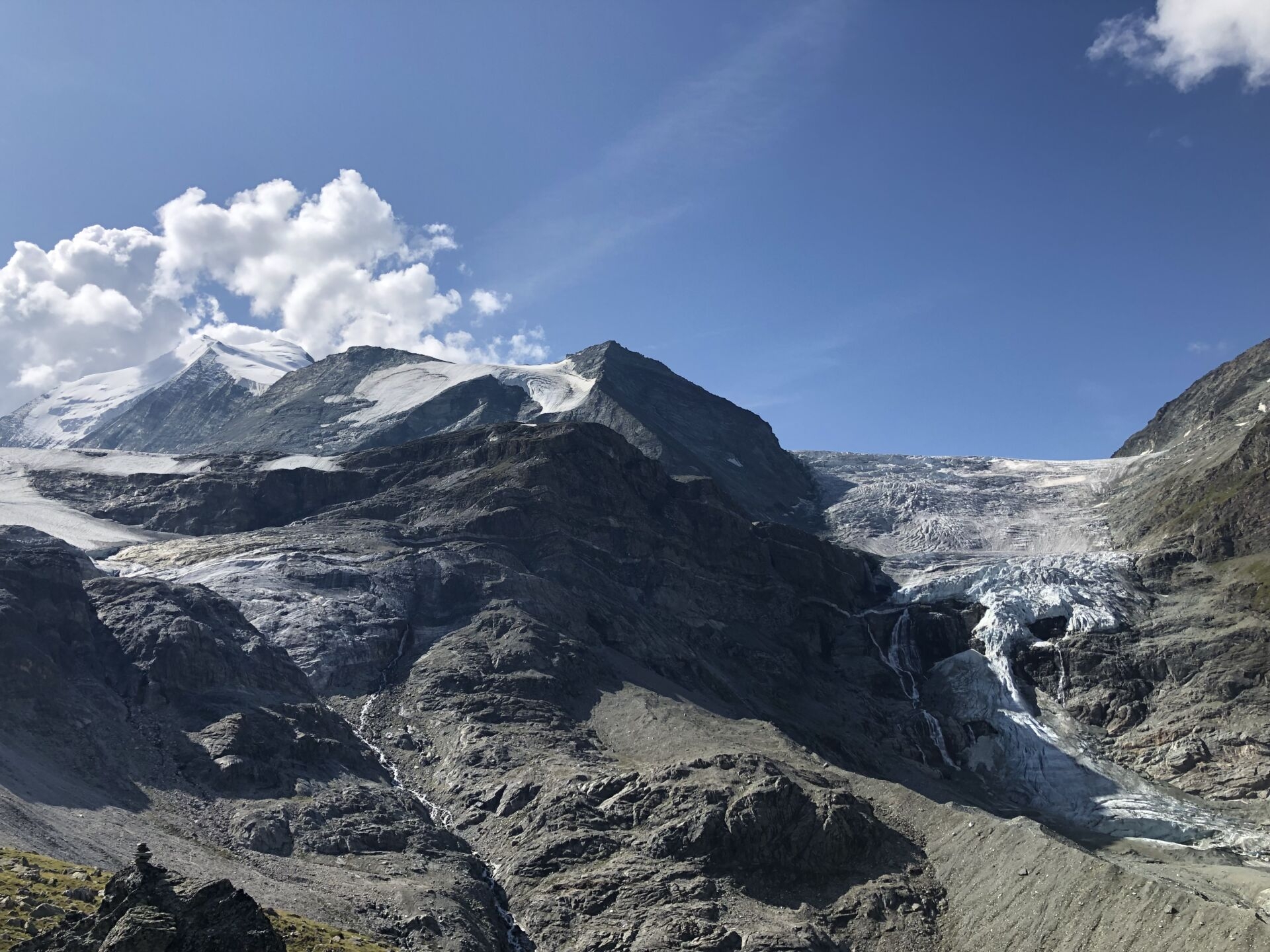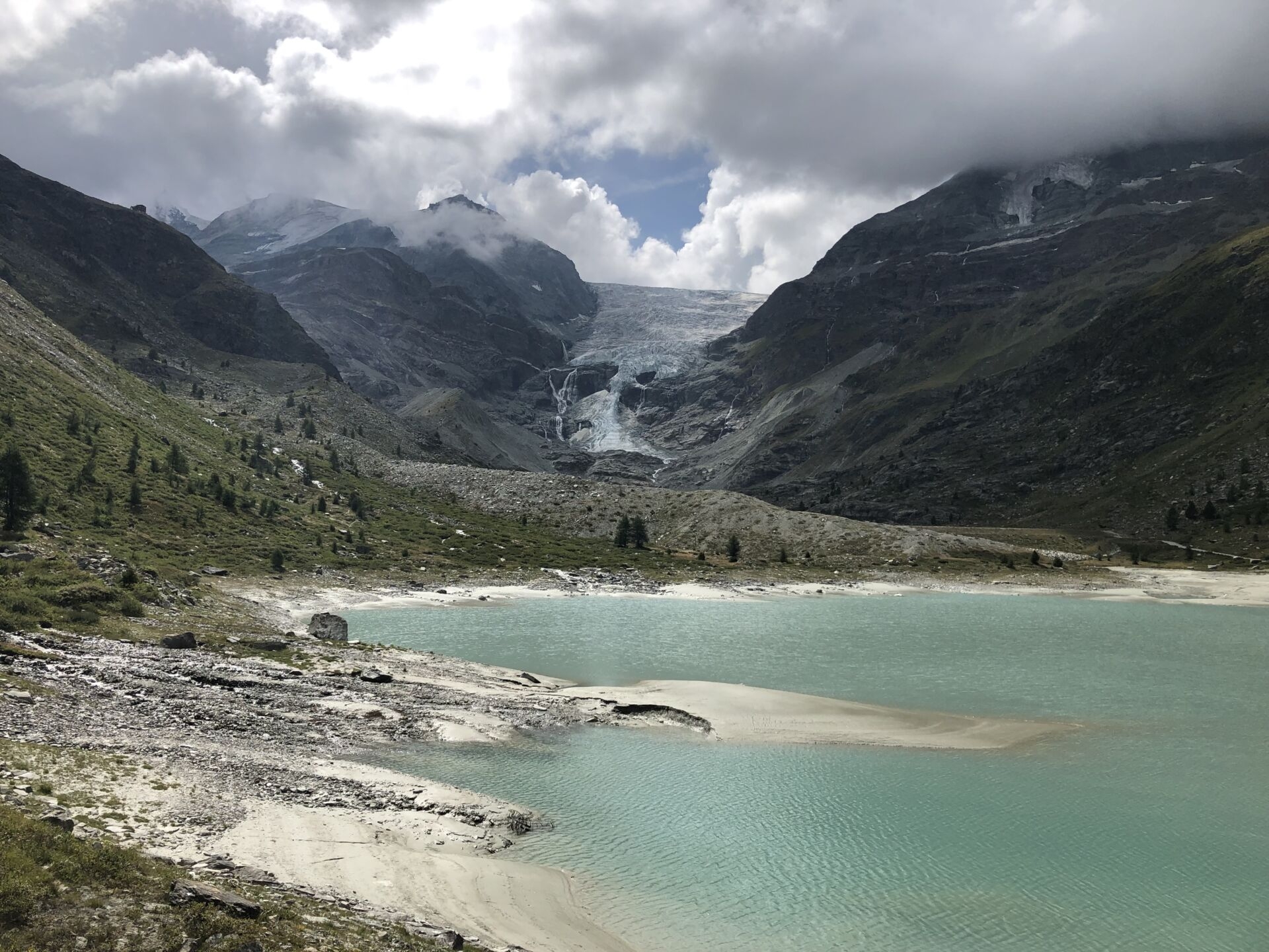 Wenig später treffen Claudia und Ueli ein, die auch in der Topalihütte übernachtet haben. Wir plaudern und teilen unsere Wanderfreude. Schliesslich steigen wir zusammen ins immer grüner werdende Turtmanntal ab. Die vielen Edelweiss gehen dabei vor lauter Gletscherspotting fast ein bisschen unter. Und es zieht rasch zu. „Wie schnell aus blau doch grau wird“, denke ich! Aus der Ferne höre ich ein erstes Donnern.