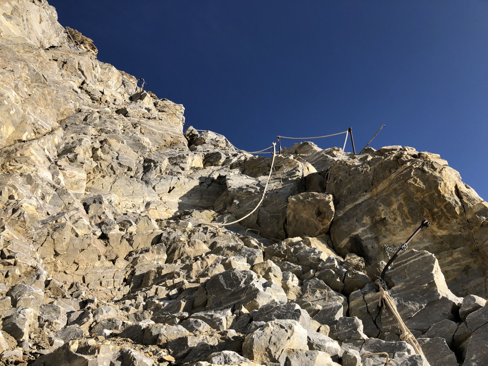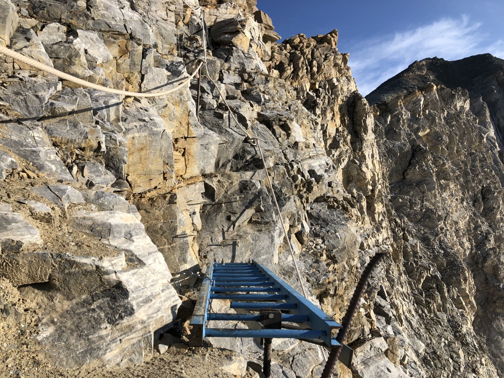 Ein Fixseil hilft über die letzten, rutschigen Meter Schutt. Schon stehe ich am Fuss der langen Leiter, mit der das erste, senkrechte Stück der rund 40-50 Meter hohen Felsmauer überklettert wird. Dann legt sich die Wand leicht zurück, es folgen Stahlbügel und Fixseile. Hoher Komfort, keinerlei Schwierigkeiten, nur schwindelfrei muss man sein. Bald stehe ich auf dem Joch und damit im Turtmanntal.