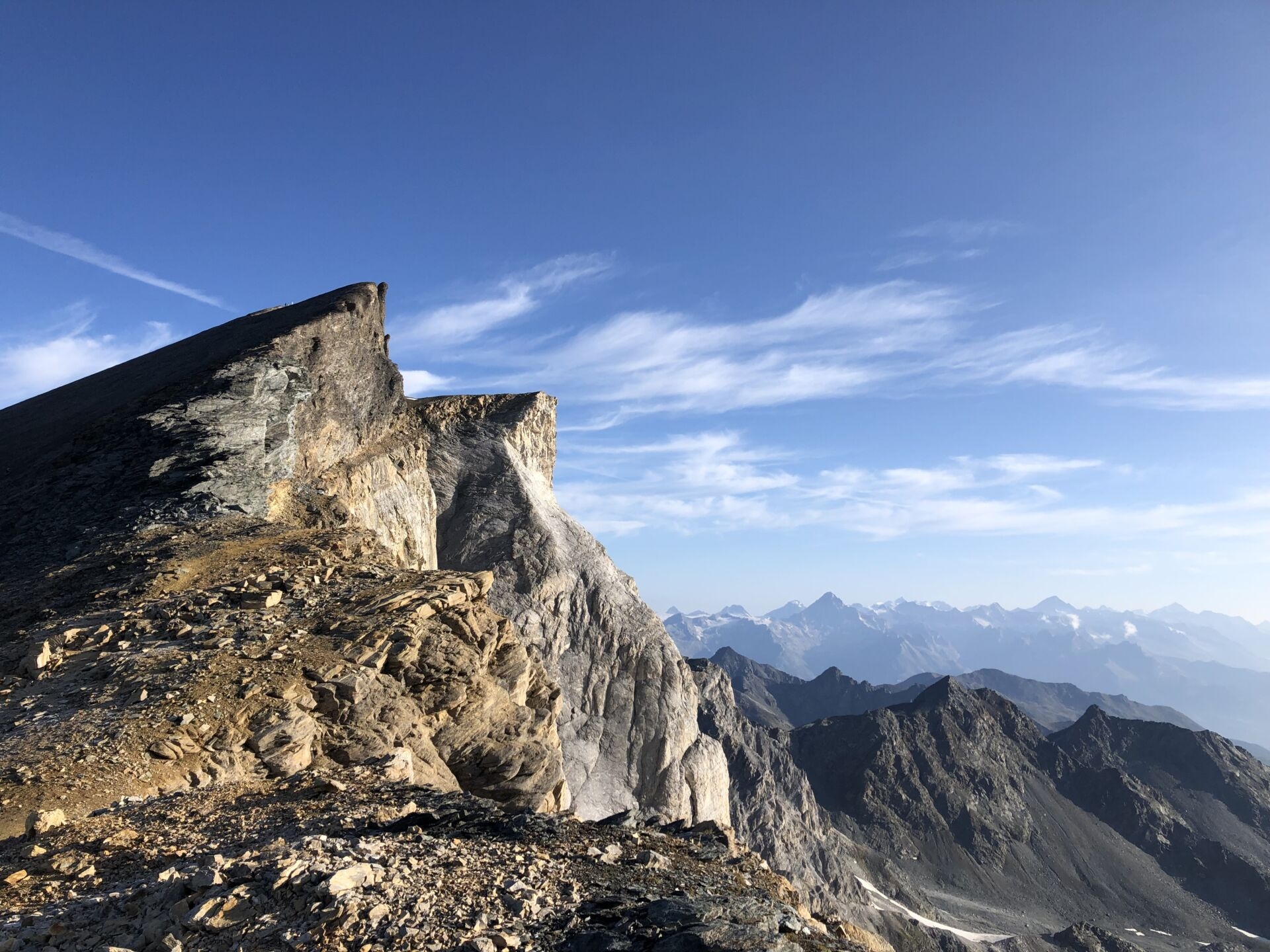 Ich bin nicht alleine, bereits haben ein halbes Dutzend junge Berggänger den Gipfel über die Turtmannroute erreicht. Meine Geographie- und Gipfelkenntnisse sind gefragt, andere wollen mehr über die Schöllijochroute wissen. Bald suche ich etwas Ruhe auf dem etwas tieferen, schön vorgelagerten Vorgipfel, um mein feines Pastrami-Sandwich zu essen und die grandiose Aussicht in Stille zu geniessen. Die Berner Alpen, die vielen Walliser Riesen bis hin zum Montblanc mit seiner Aiguilles-Entourage…