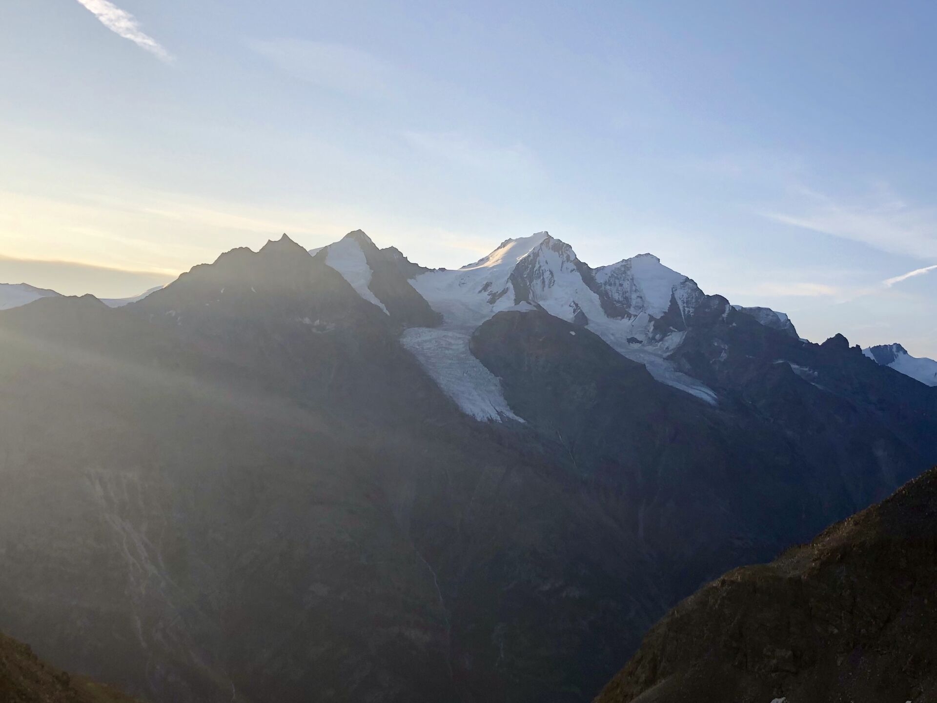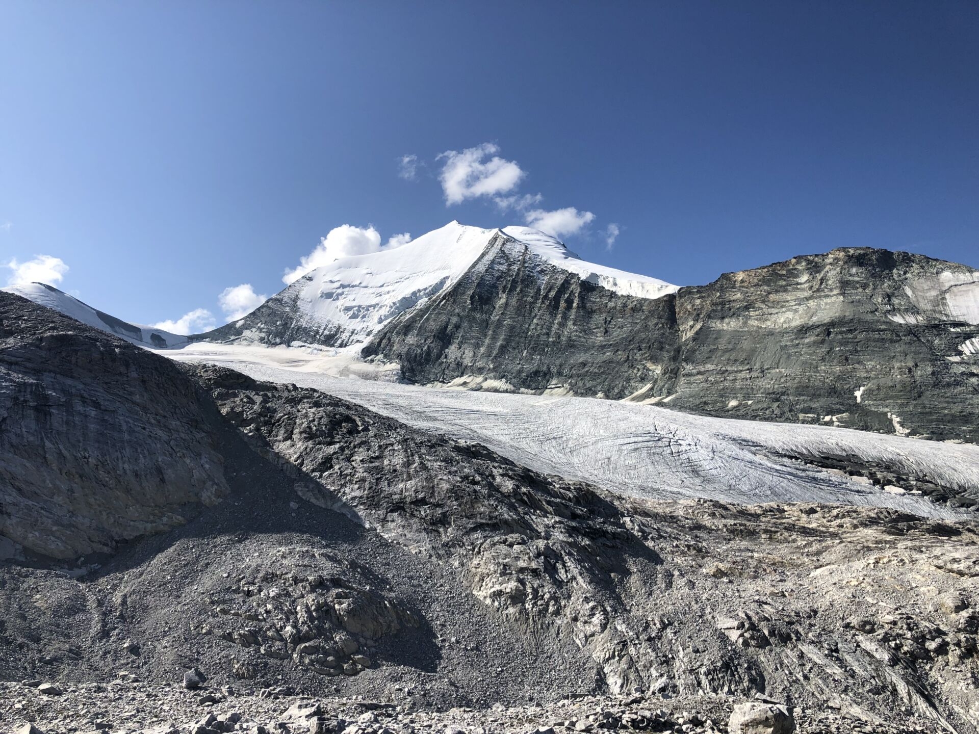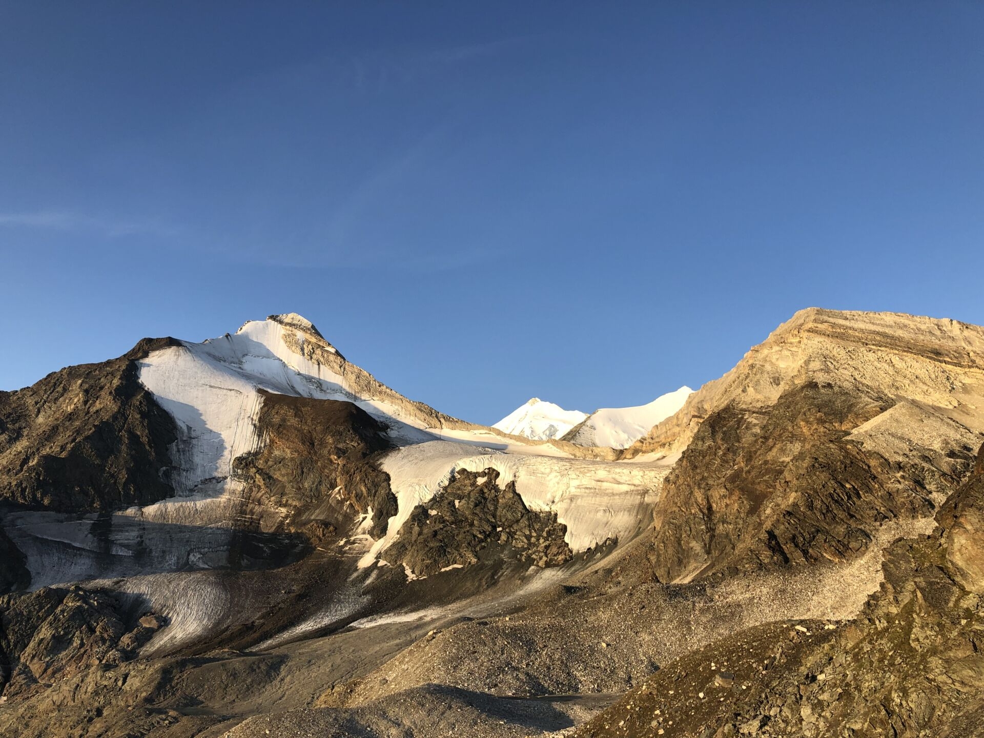 Die Route zum Schöllijoch ist gut markiert (blau-weiss) und führt durch mehrere Geländekammern und über viel Geröll zu den Moränen des Schölligletschers. Die Sicht auf die Mischabelgruppe auf der anderen Talseite ist formidabel, wie gerne denke ich an die letztjährige Nadelgratüberschreitung zurück! Vor mir beleuchtet das frühe Sonnenlicht sanft das Brunegghorn, den Vorgipfel des Bishorns und das majestätische Weisshorn. Einfach wunderbar, die Höhenmeter schmelzen nur so dahin, und bald stehe ich auf dem Schölligletscher.