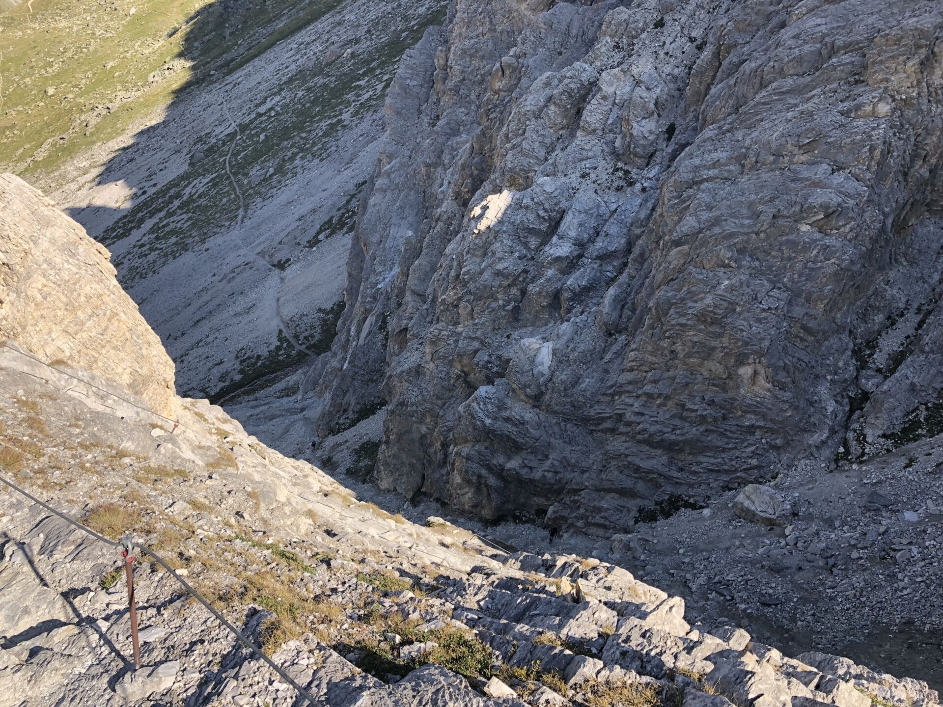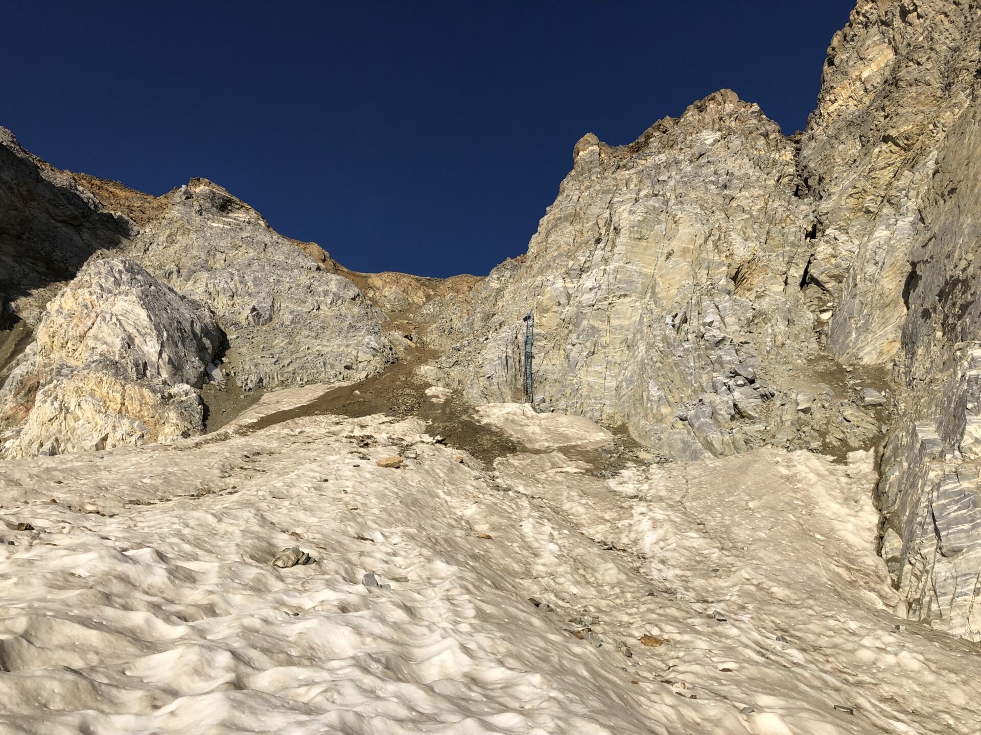 Achtung Steinschlag aus dem Couloir – rechts davon die erste Leiter