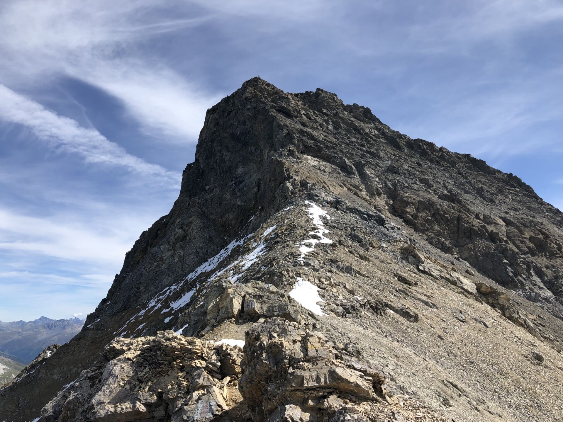 Nach diesem ersten Kick dürfen sich die Nerven und Hände etwas erholen beim Erklimmen eines steilen Feinschuttfelds, das jedoch den Achillessehnen ziemlich zusetzt. Die Schlange wird wieder länger, aber noch sind alle guten Mutes, als wir auf rund 2800m den Vorgipfel erreichen.
