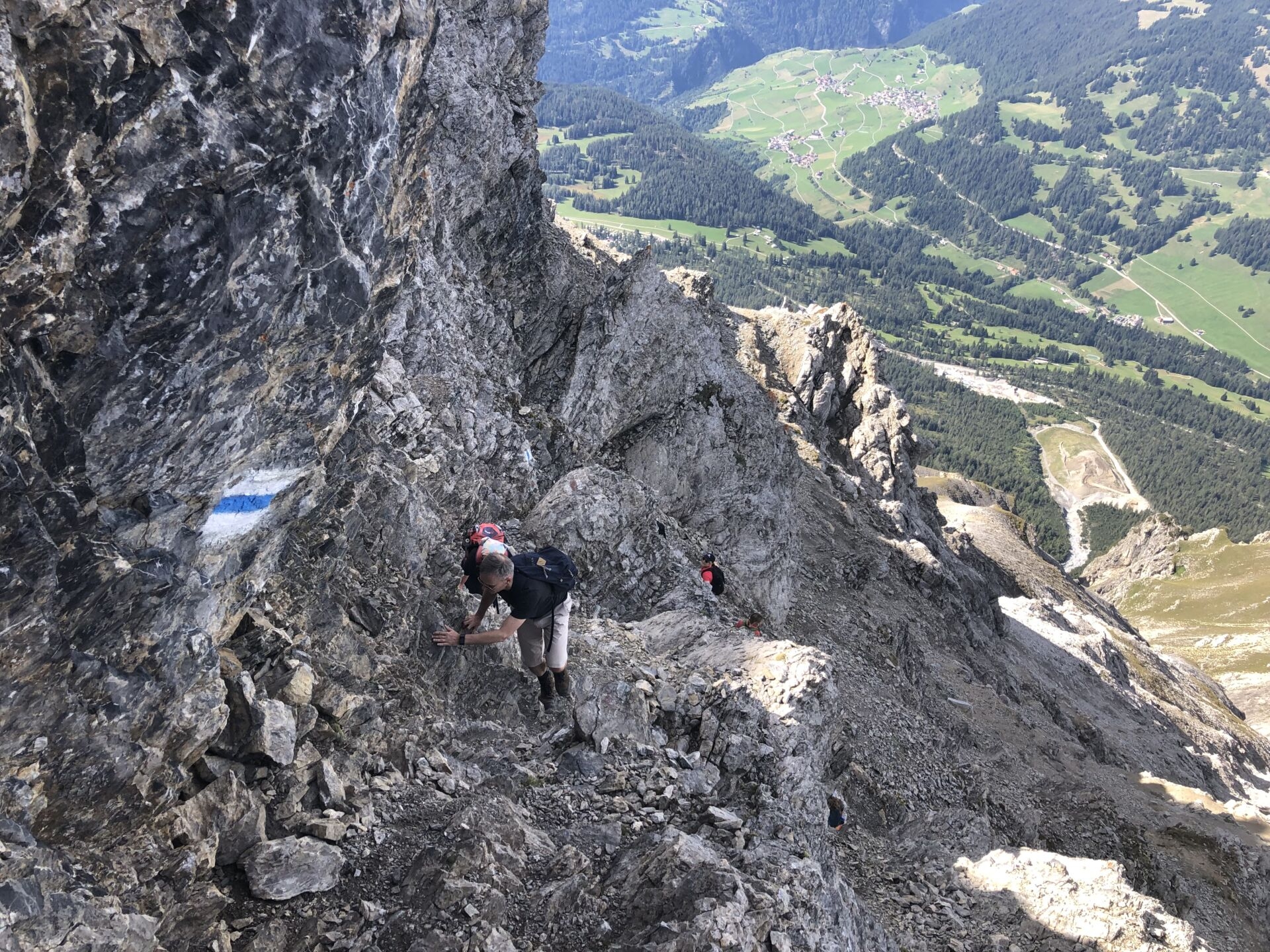 Die letzten 100 Höhenmeter sind Kraxelgelände. Der felsige Aufschwung des Lenzerhorn steilt stark auf und ist brüchig. Die Steine sind aber so geschichtet, dass wir überall perfekte Tritte und Griffe finden. Nur das Geröll ist ein Spielverderber, der etwas Vorsicht verlangt. Die Idealroute ist gut markiert, allerdings lässt dieser gutmütige Gipfelkopf durchaus ein Versteigen zu. Richtig ausgesetzt ist es nie.