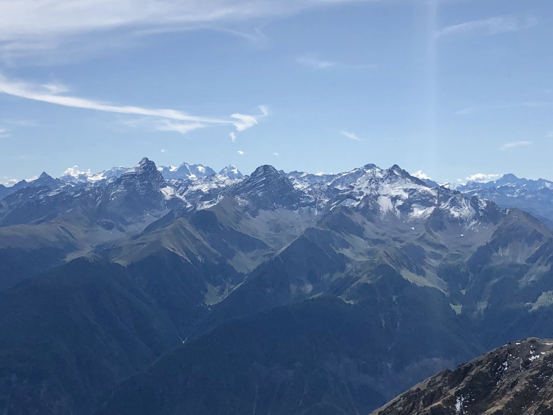 Die Anstrengungen werden belohnt: Der erste „Wow“-Moment kommt, als wir durch einen schmalen Felsspalt den Grat erreichen, der unseren Horizont auf einen Schlag um 100Km erweitert. Tödi, Rheinwaldhorn, Piz Tambo… you name it! Und zur freudigen Erleichterung folgt nun eine kurze Flachpassage entlang der hier noch begrasten Südflanke, der dem Genuss der Weitsicht die Krone aufsetzt.