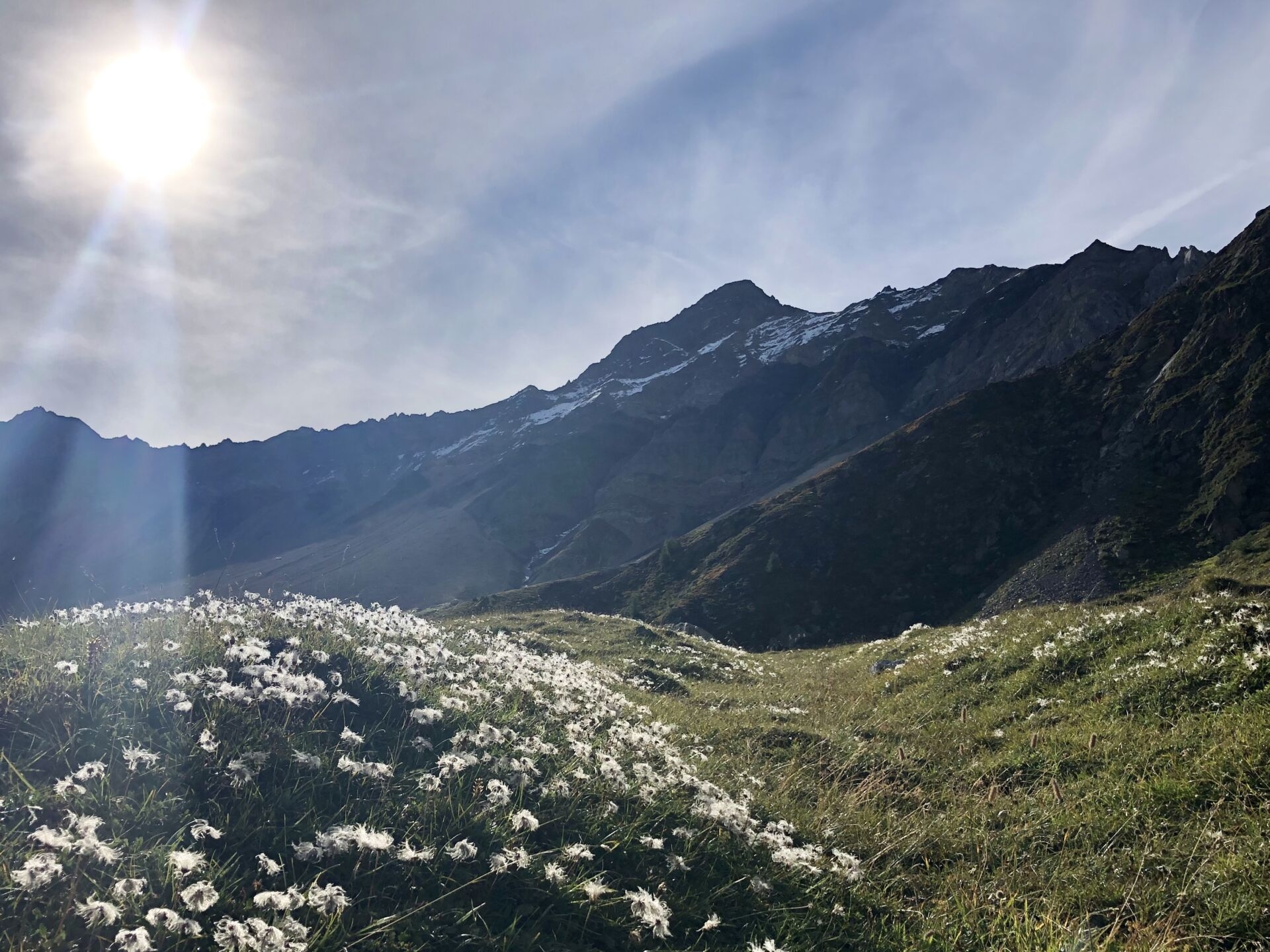 Die Alp ist noch stark belebt von jungen Rindern, die sich nicht stören lassen, als die grosse Wandergruppe auf den nun blauweiss-markierten Pfad zum Lenzerhorn einbiegt. Unzählige Berganemonen (Küchenschellen) säumen den Wegrand. Ihr feinen Häarchen glänzen wundersam im Gegenlicht.