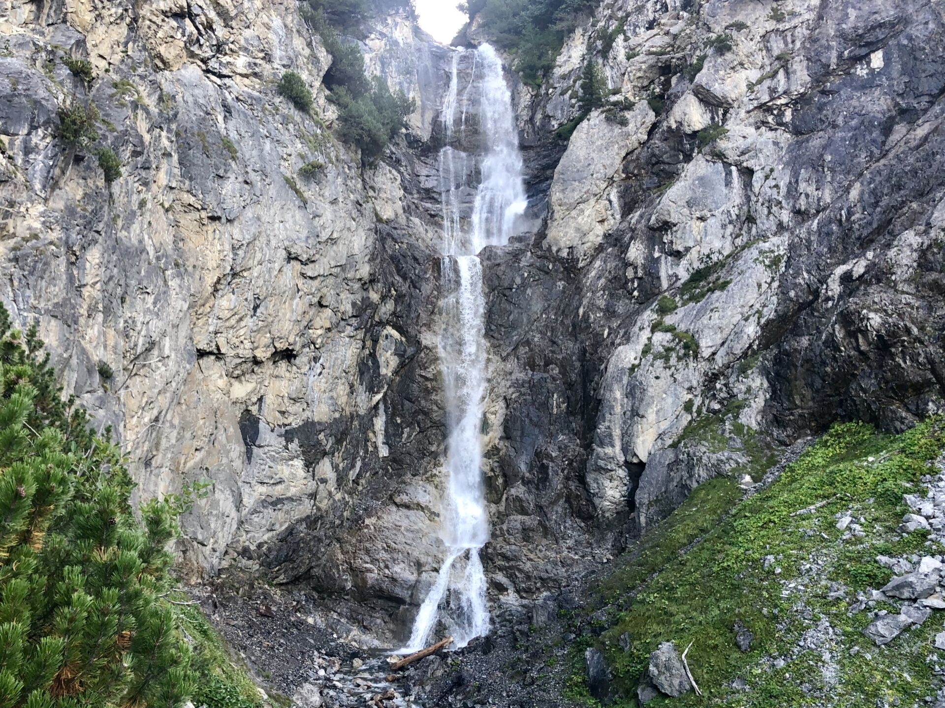 „Wir sehen uns auf der Alp Sanaspans!“, ermutigt Christine ihre Truppe und setzt sich in Bewegung. Wir durchlaufen zunächst das von zahlreichen Mountain Bikern eingenommene Dorf und spuren bei Crapera auf den Pfad zum Wasserfall ein. Der Aufstieg durch den Lärchenwald ist kurzweilig, es wird viel geplaudert und nach Pilzen Ausschau gehalten. Der Steigwinkel nimmt zu und es wird steiniger, bald stehen wir am Fuss des Wasserfalls. Ein paar Fotos, ein Schluck Wasser, danach wird die „Mauer“ überwunden und knapp 90 Minuten nach dem Start erreichen wir die bewartete Alp Sanaspans, wo wir bei einem Schorle und einem Schoggiriegel auf den Rest des Teams warten.