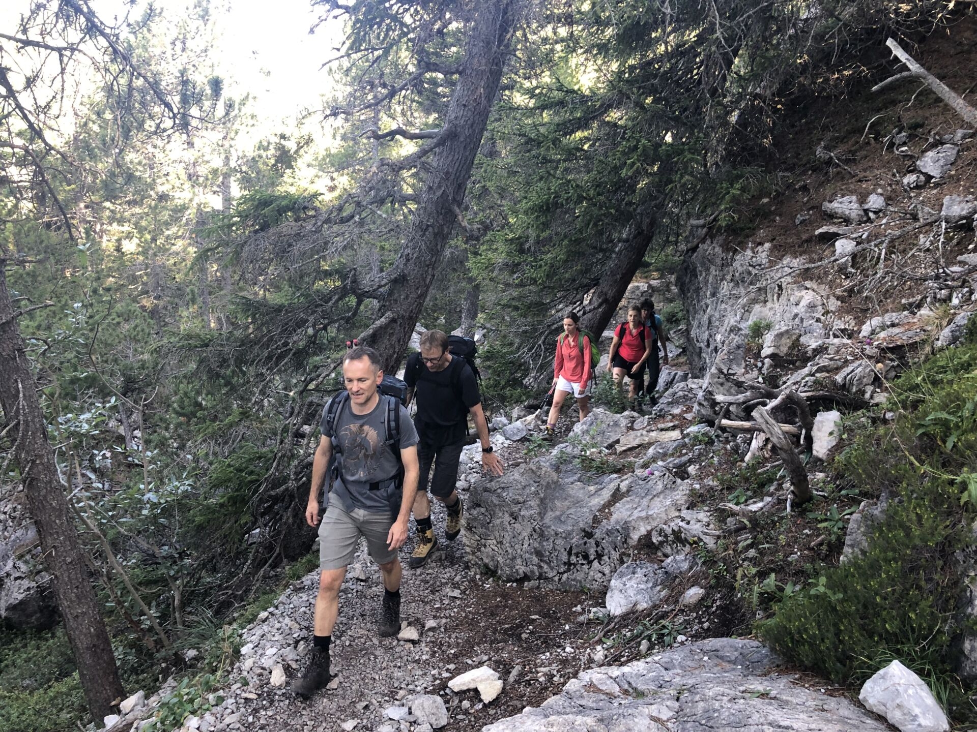Hinunter geht es über denselben Weg – mit kleinen Varianten. Und statt Schorle mit Schoggi gibt es auf der Alp Sanaspans nun ein Bier und ein Plättli. Aber der lange Abstieg durch das anspruchsvolle Gelände ist ein Challenge. Bei einigen leiden die Knie oder die Zehen, andere brauchen in den Steilpassagen etwas Überwindung und gutes Zureden. Am Schluss sind alle gesund und munter unten, Martins Schuhe sind der einzige Kollateralschaden.