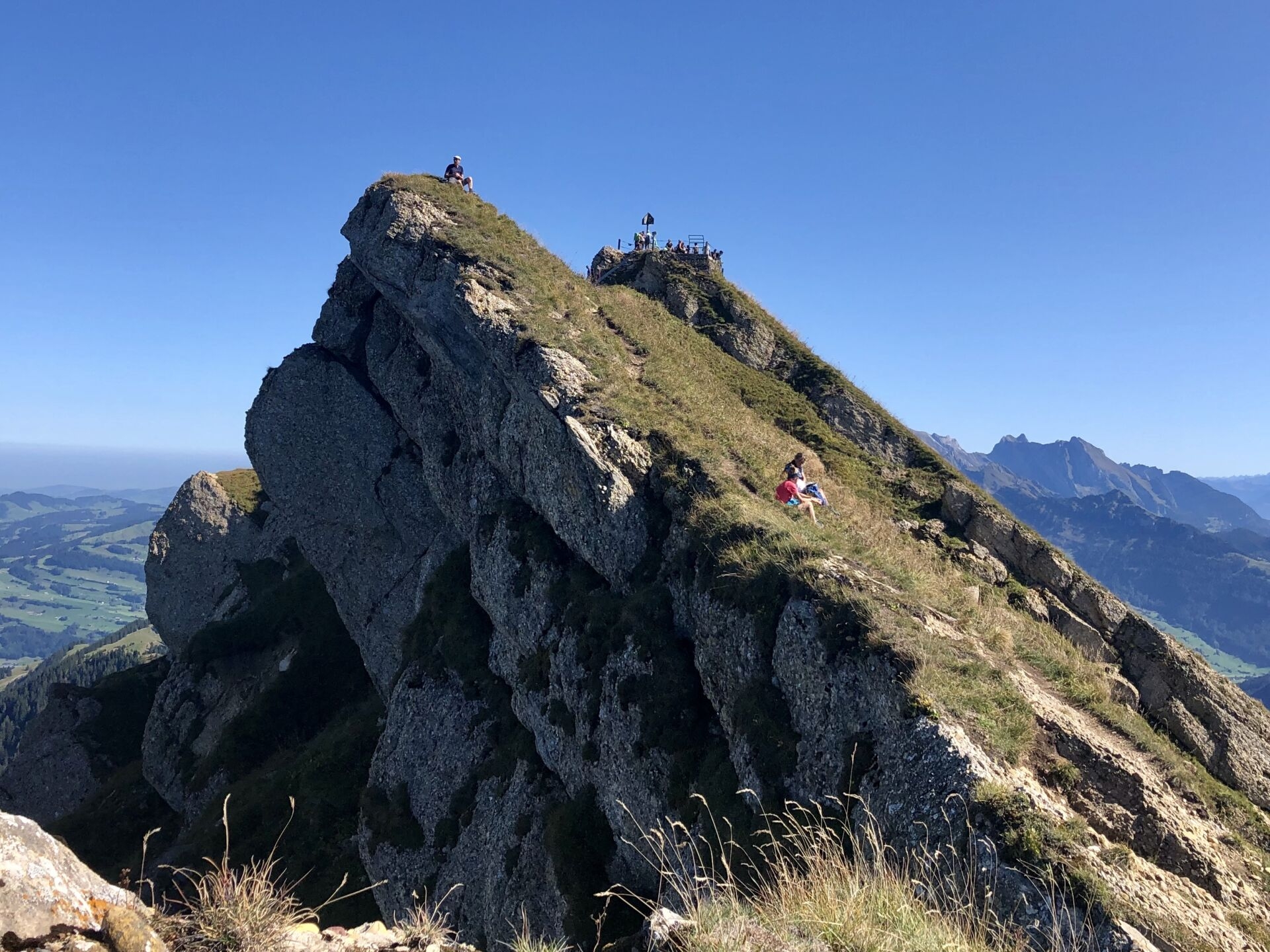 So setzen wir unser Tageswerk über den aufregenden Grat fort. Wir verlassen den Wanderweg und steigen zunächst zum Abahorn ab. Die Pfadspur führt über Gras und Nagelfluh und erfordert vorerst nur gutes Gleichgewicht. Zwei, drei Handgriffe führen auf das Abahorn. Der Abstieg über die scharfe Nagelfluhkante hinunter zur Grappescharte ist schon anspruchsvoller und ausgesetzt und erfordert absolute Trittsicherheit. Höhenangst wäre der falsche Begleiter. Allerdings könnte man hier auch westlich der Gratkante über ein Band mit hochstehendem Gras ausweichen.