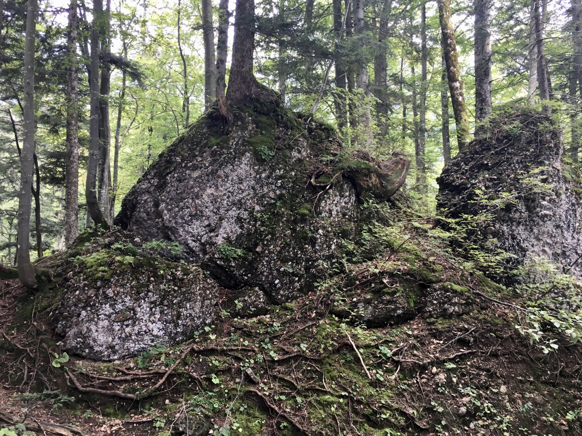 Das bewaldete Talstück ist wunderschön, wie oft habe ich schon den kleinen Wasserfall und den Badeteich fotografiert! Heute tue ich es nochmals. Dann bestaune ich die riesigen Nagelfluhfindlinge und die kleinen Bäume, die darauf ihre bescheidene Existenz aufgebaut haben. Welche Wunder die Natur doch bereit hält!