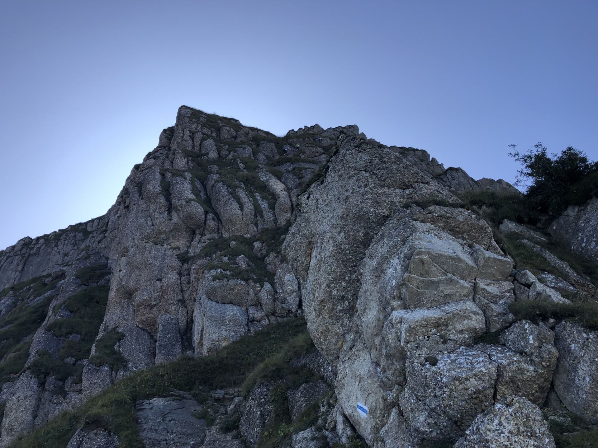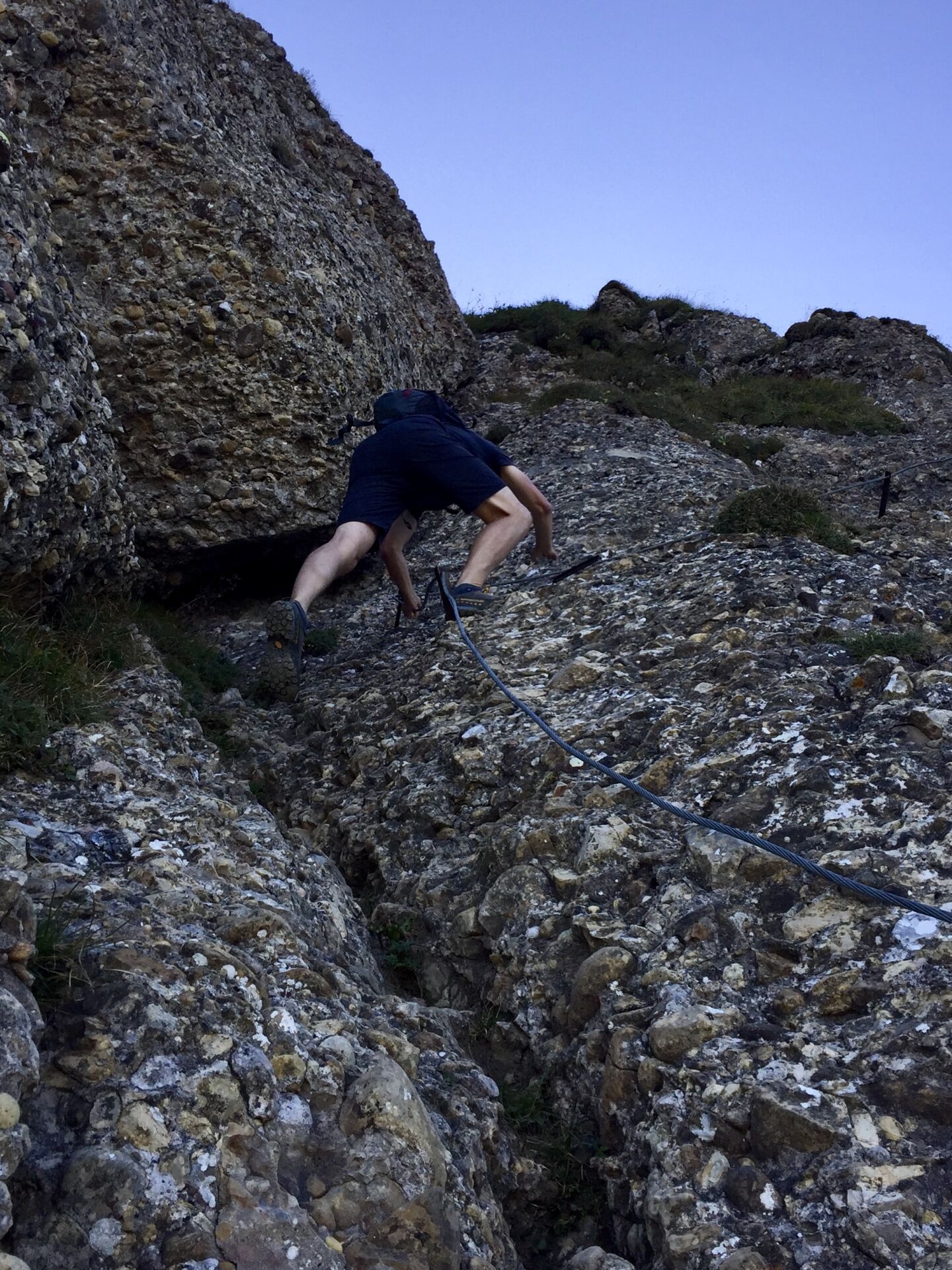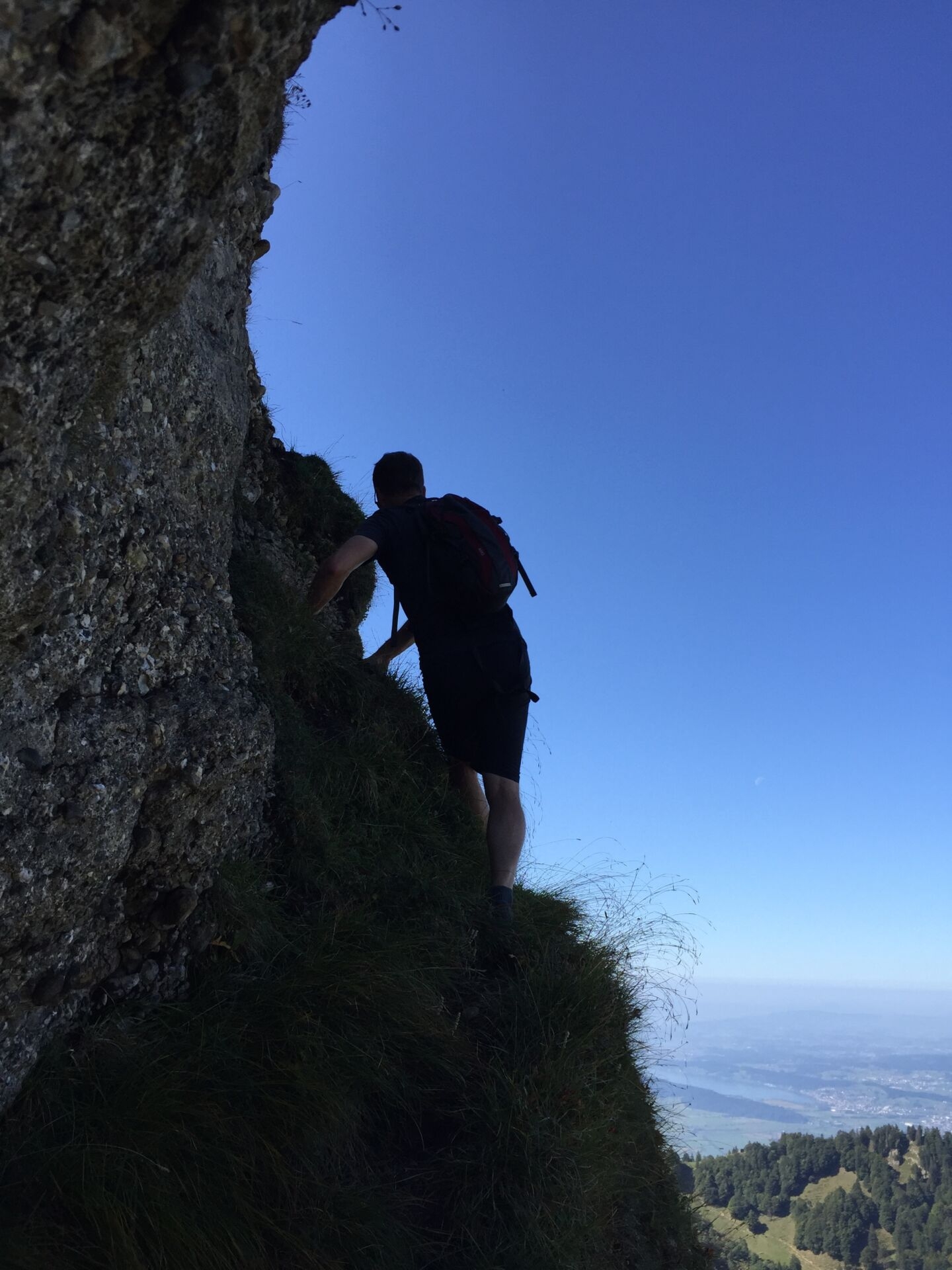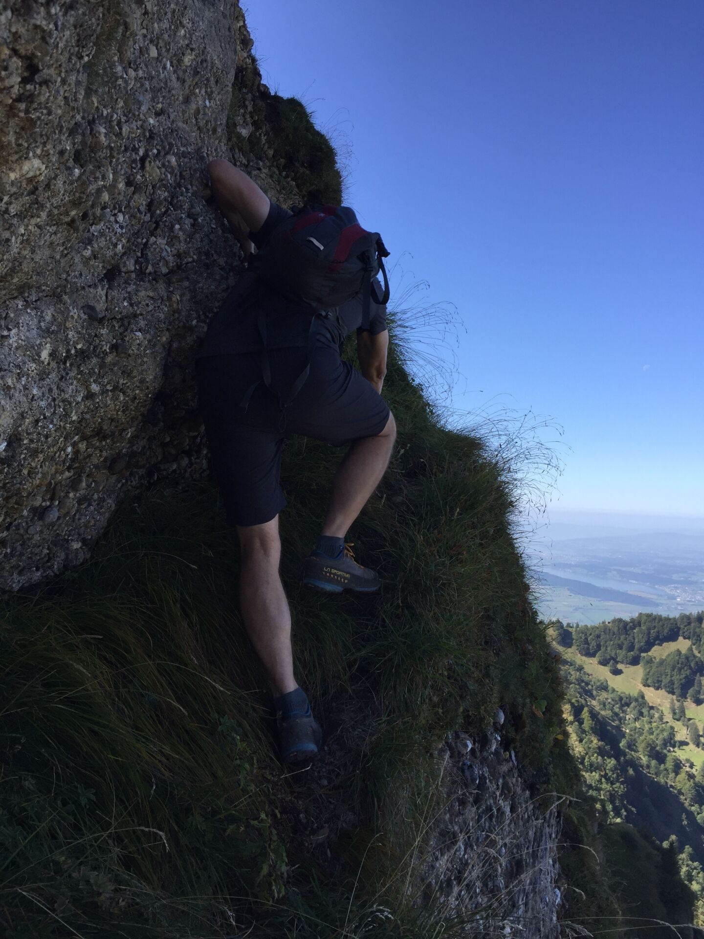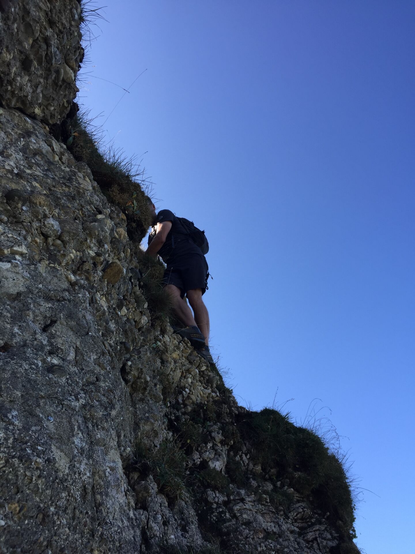 Der Griff ist überall gut, auch wenn manchmal etwas speckig. Die reichlich montierten Stahlseile sind eine willkommene, aber nicht immer zwingend notwendige Hilfe. Stellenweise ist es zwar ausgesetzt, aber für erfahrene Berggänger nie wirklich grenzwertig. Beim letzten Mal traf ich auf halben Weg einen Steinbock, heute ist es zu busy für die Tiere. Ich glaube, die reissen jeweils über das Wochenende aus. Aber wohin?