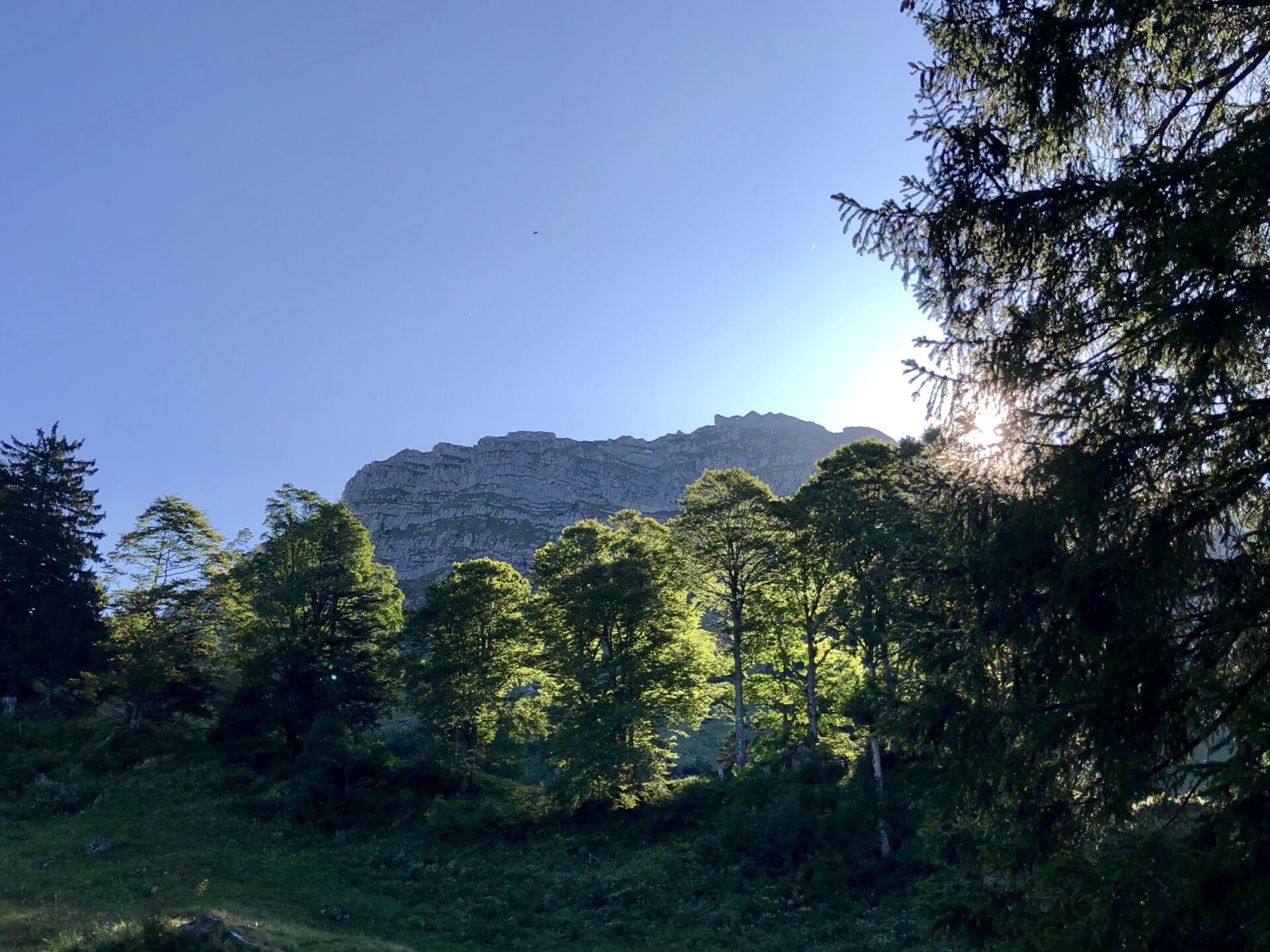Bald darauf verlasse ich das Fahrsträsschen, der Steigmodus wird intensiviert, ich folge dem Pfad über Hinderwägi zur oberen Rossalp. Vor mir baut sich die grimmige Westwand des Speers auf, die im Schatten noch bedrohlicher wirkt. Ich halte den Moment fest, als die Sonne über den Grat hochsteigt. Magisch, wie das Licht die Bäume verzaubert.