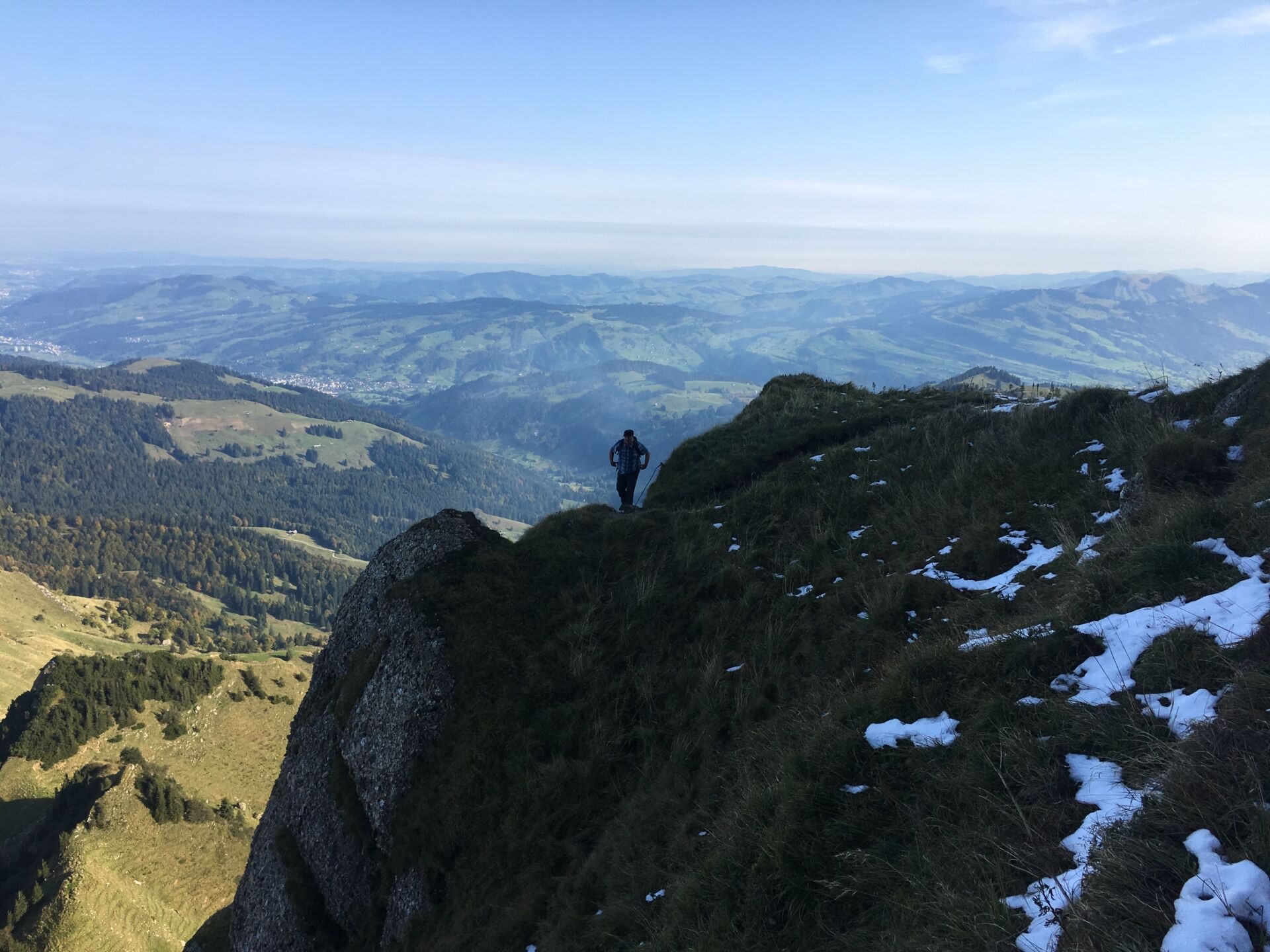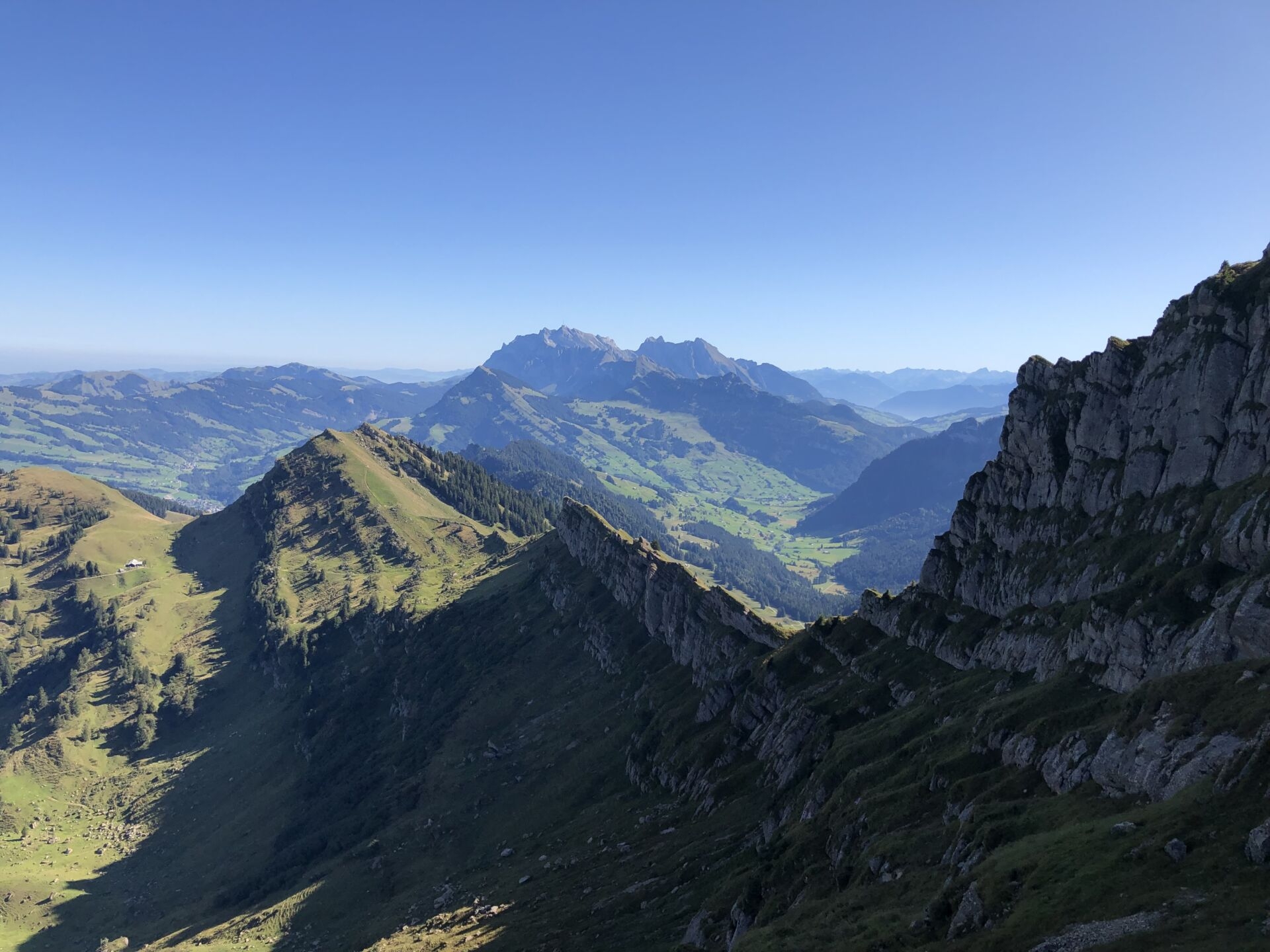 Bald sitzen wir auf dem einsamen Grappehorn und geniessen den wunderbaren Rundblick in dieses Nagelfluh-Paradies mit seinen so prägenden Formen. Was für ein Unterschied zum Betrieb auf dem Speer! Nur ein weiterer Bündner Alpinist gesellt sich zu uns.