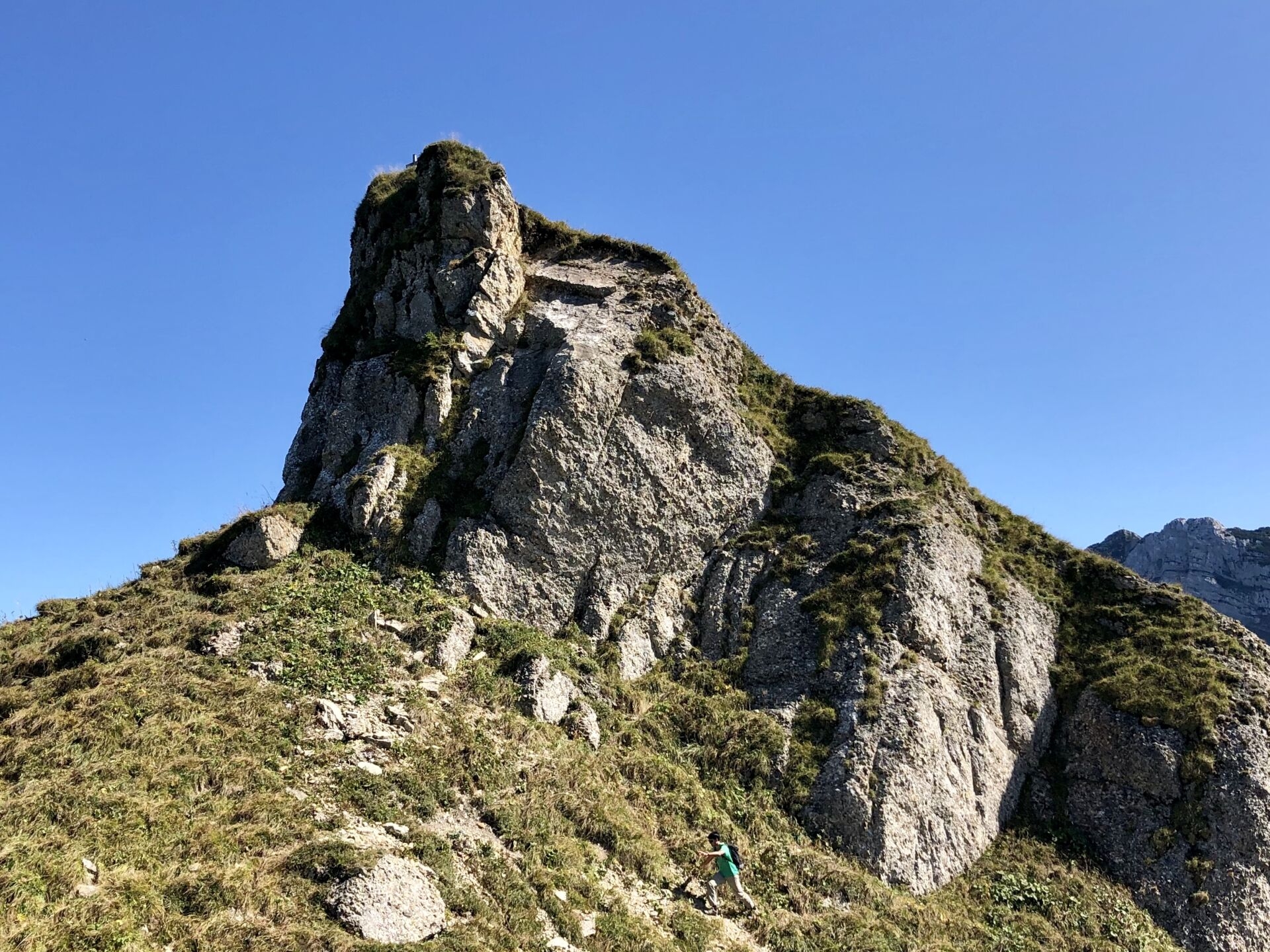 Gleich nach der Scharte folgt die Schlüsselstelle. Ein Felsriegel stellt sich in den Weg, der entweder nördlich über ein schmales Grasband umgangen oder direkt überklettert werden kann. Wir entscheiden uns für Letzteres, weil es so trocken ist. Allerdings erfordert diese ausgesetzte Passage mit ihren lehmigen Tritten robuste Nerven und ein paar Klettergriffe. Meine Toggenburger Begleiterin wirkt so ansteckend relaxt, dass auch ich mich wohl fühle. Ohne sie hätte ich wohl hundert Gründe zur Umkehr gefunden. Ich stelle einmal mehr fest, dass „Teufelchen Mut“ jedes Jahr ein bisschen mehr von „Engelchen Vorsicht“ in die Ecke gedrängt wird.