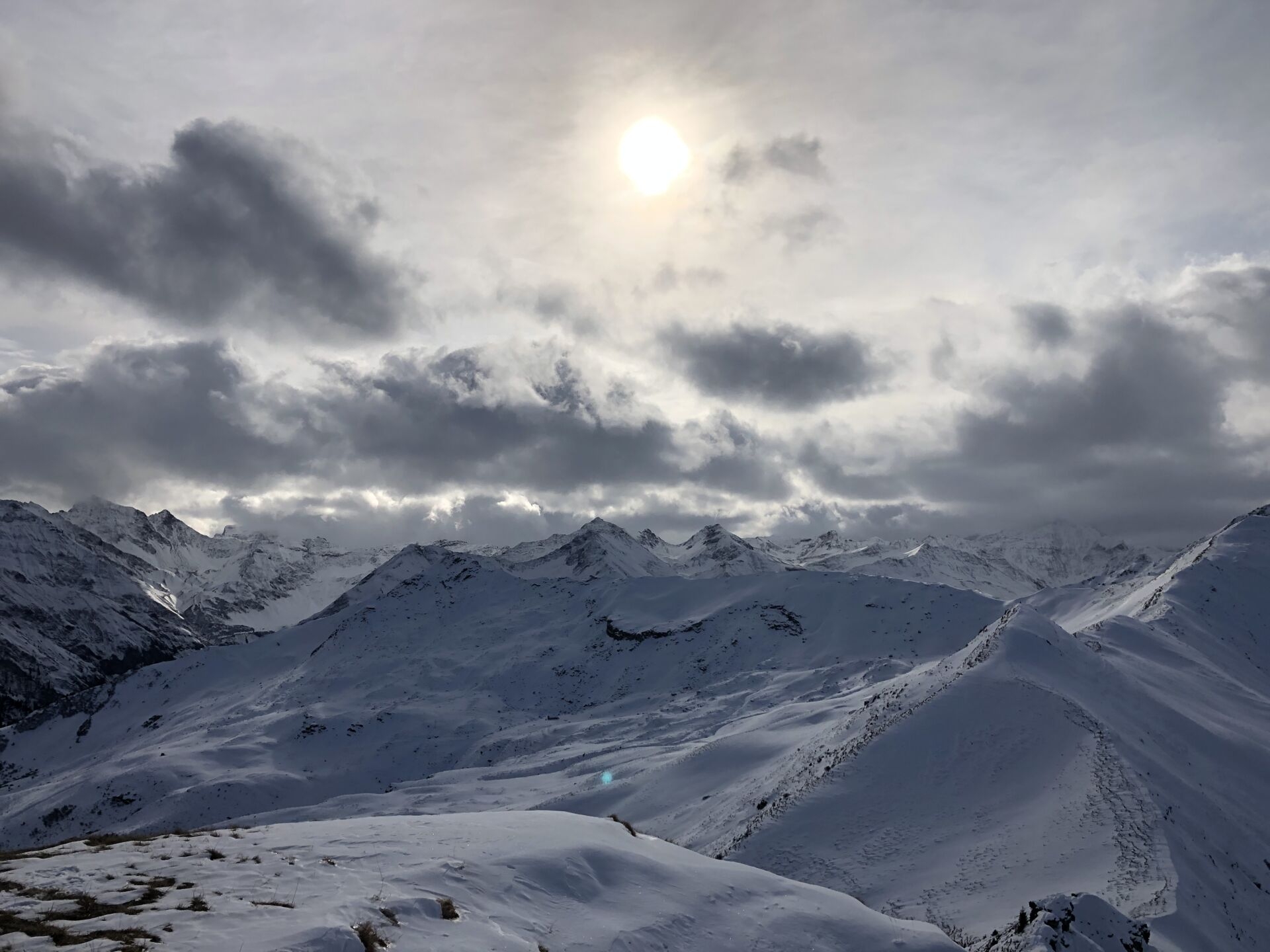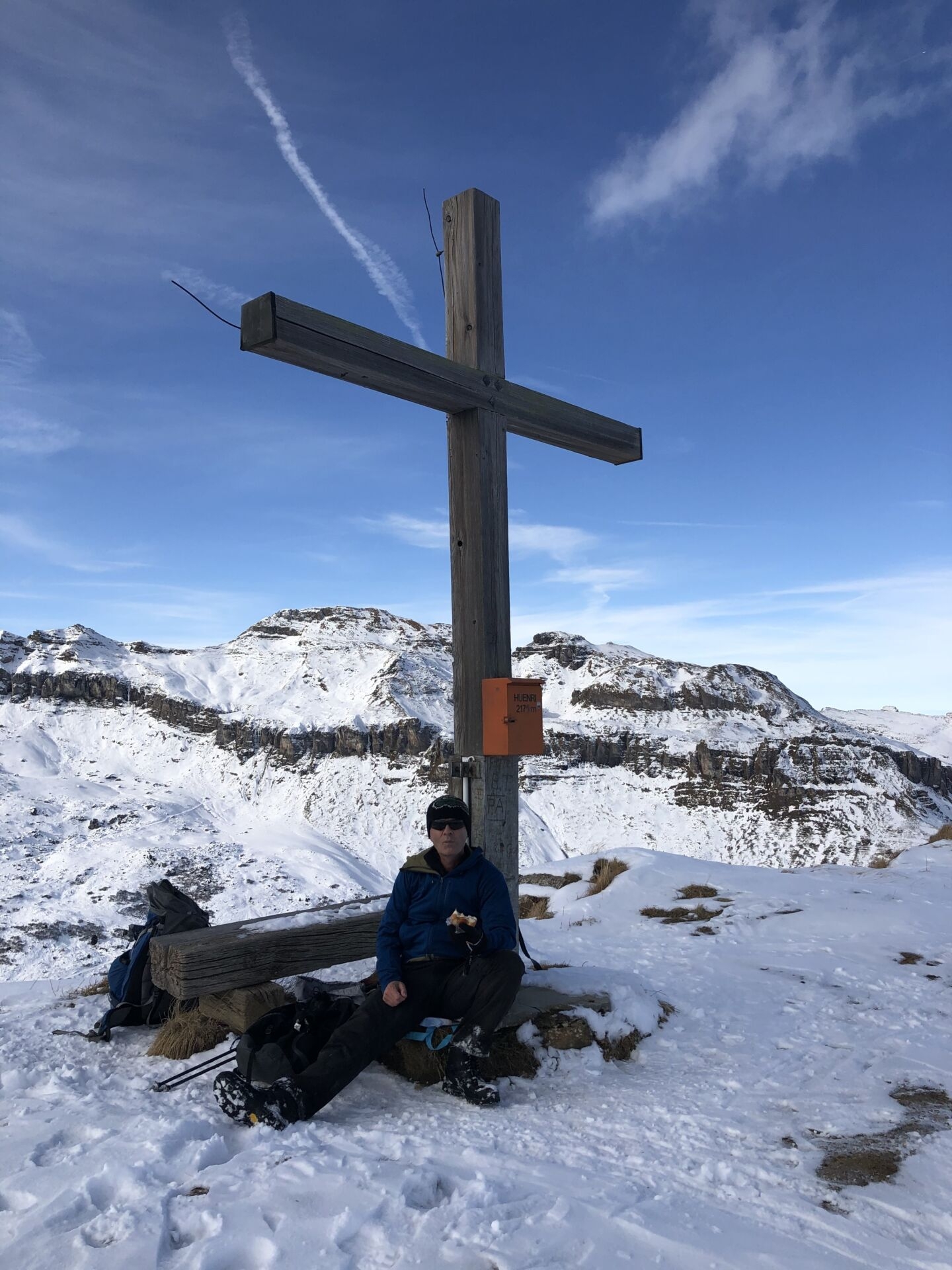 Der Grat wird bald zum gemächlichen Rücken, wir sehen unser Ziel und staunen über die Föhnmauern, die sich um die Gipfel im Süden walzen. Eine ziemlich wilde Wetterküche. Da es sich leicht läuft, geniessen wir den Aufstieg und bald stehen wir auf dem kleinen Türmchen namens Hüeneri, wie er auf dem Gipfelkreuz genannt wird. Ganz einfach – aber mit lohnenswerter Aussicht! Im Sommer wohl weniger spektakulär als jetzt mit dem Schneehut.