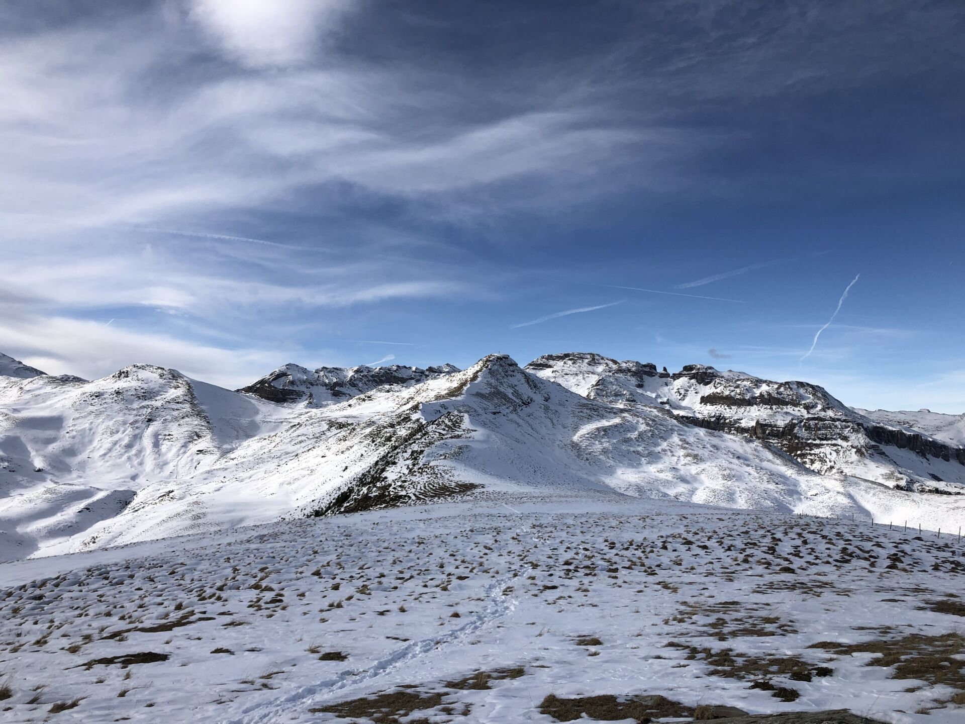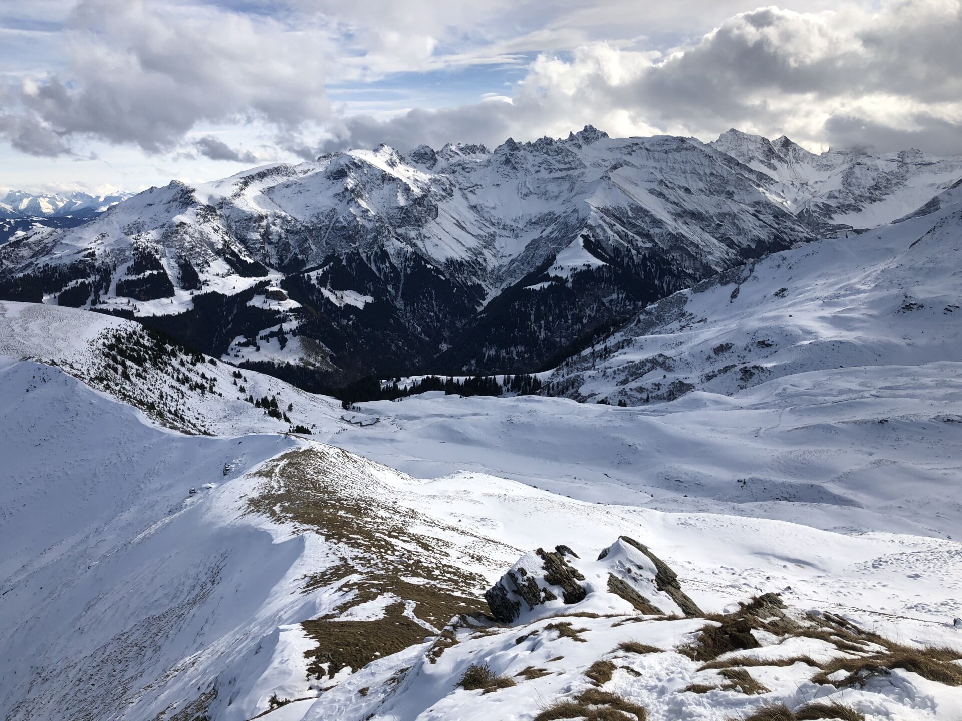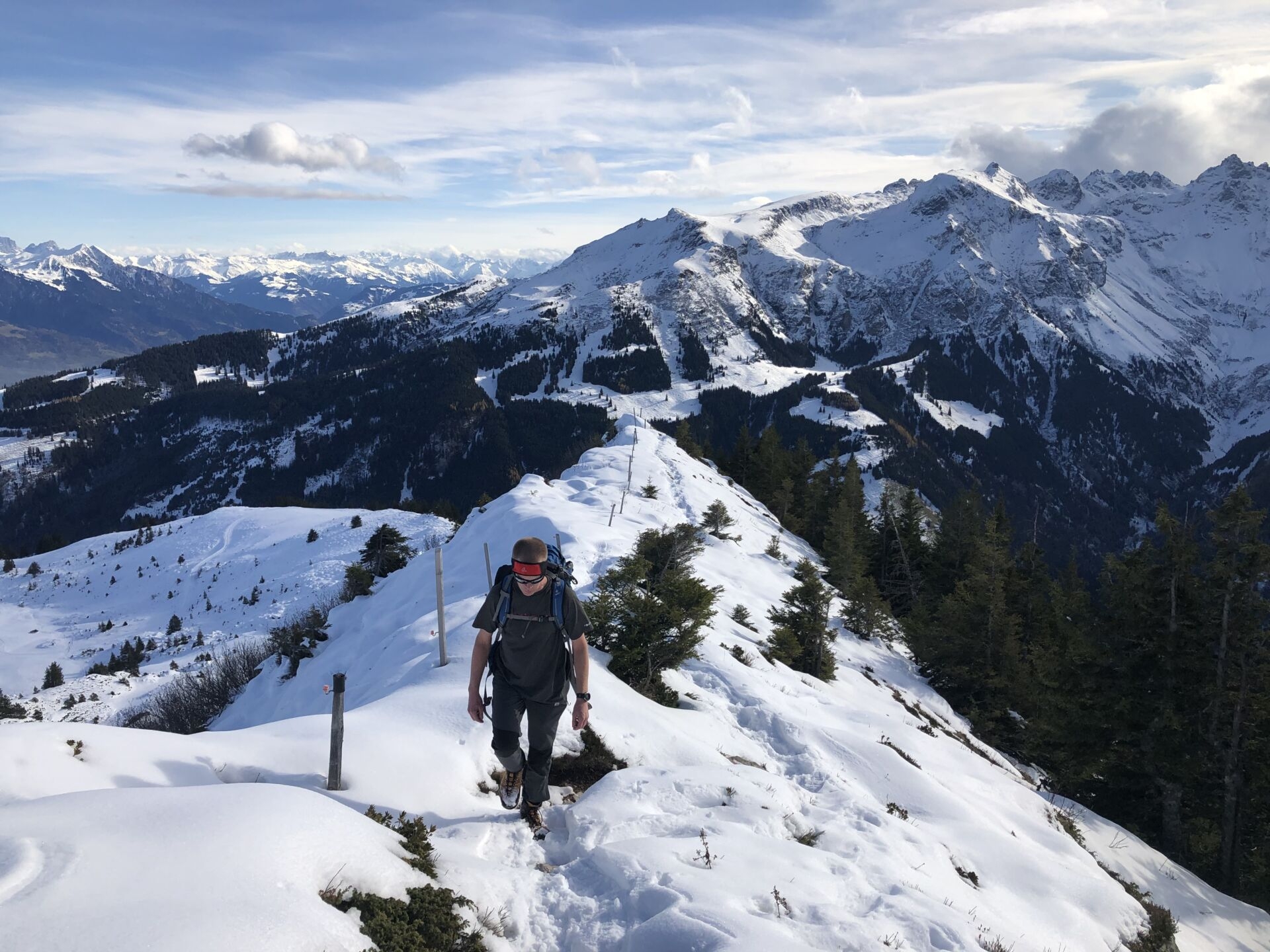 Wir folgen weiterhin dem markierten Wanderweg bis zur Gratkante und steigen dieser entlang hoch bis zu Punkt 1932. Hier lassen wir die Schneeschuhe zurück, denn der Grat ist nun dank Sonne und Wind fast schneefrei. Wind, ja, denn jetzt kommt der Föhn. Und wie! Noch vor Minuten in unseren T-Shirts schwitzend, ändern die Bedingungen abrupt. Bald setzt Bibbern ein und alle vorhandenen Kleider finden rasch den Weg aus dem Rucksack um den Körper.