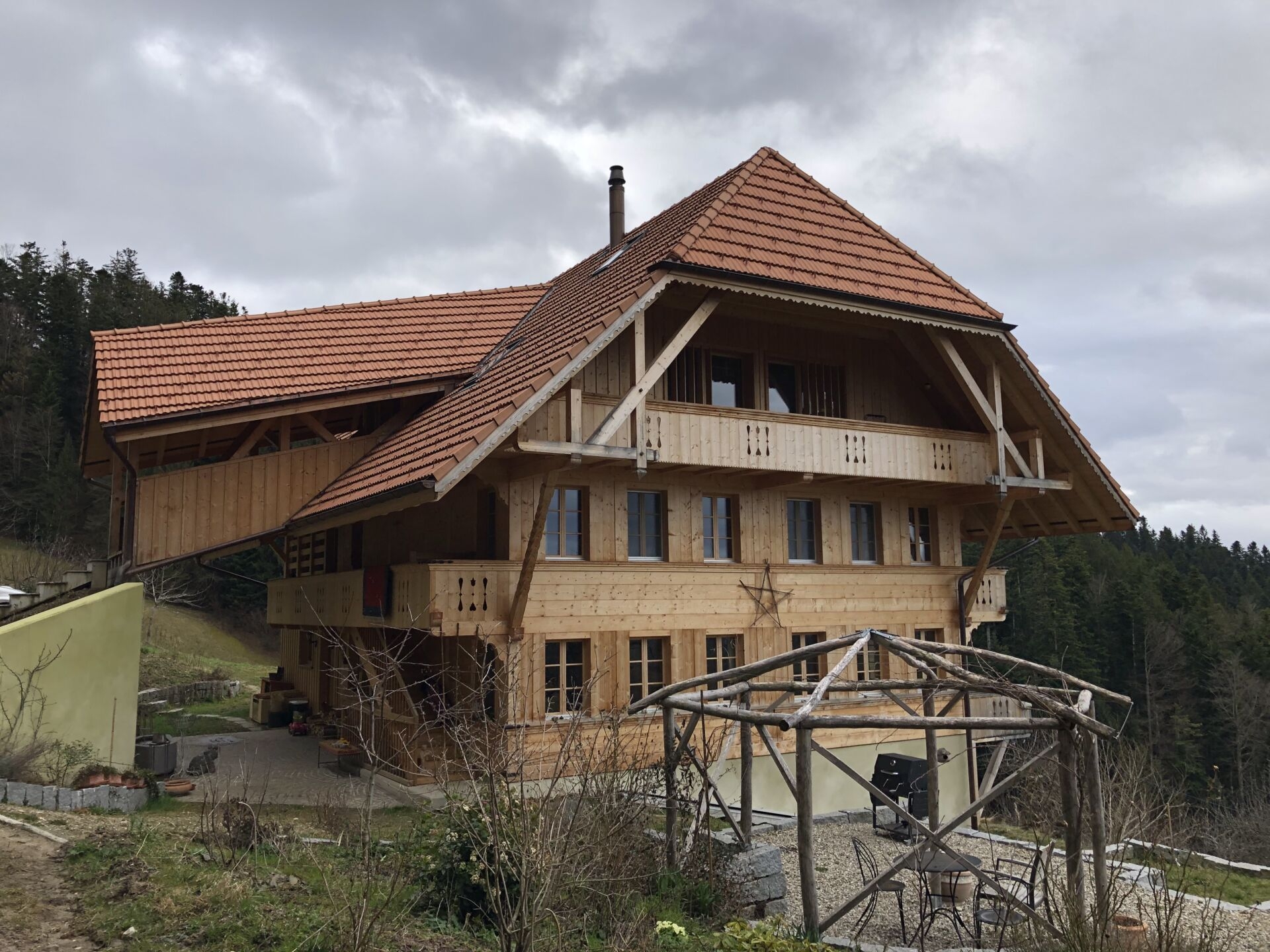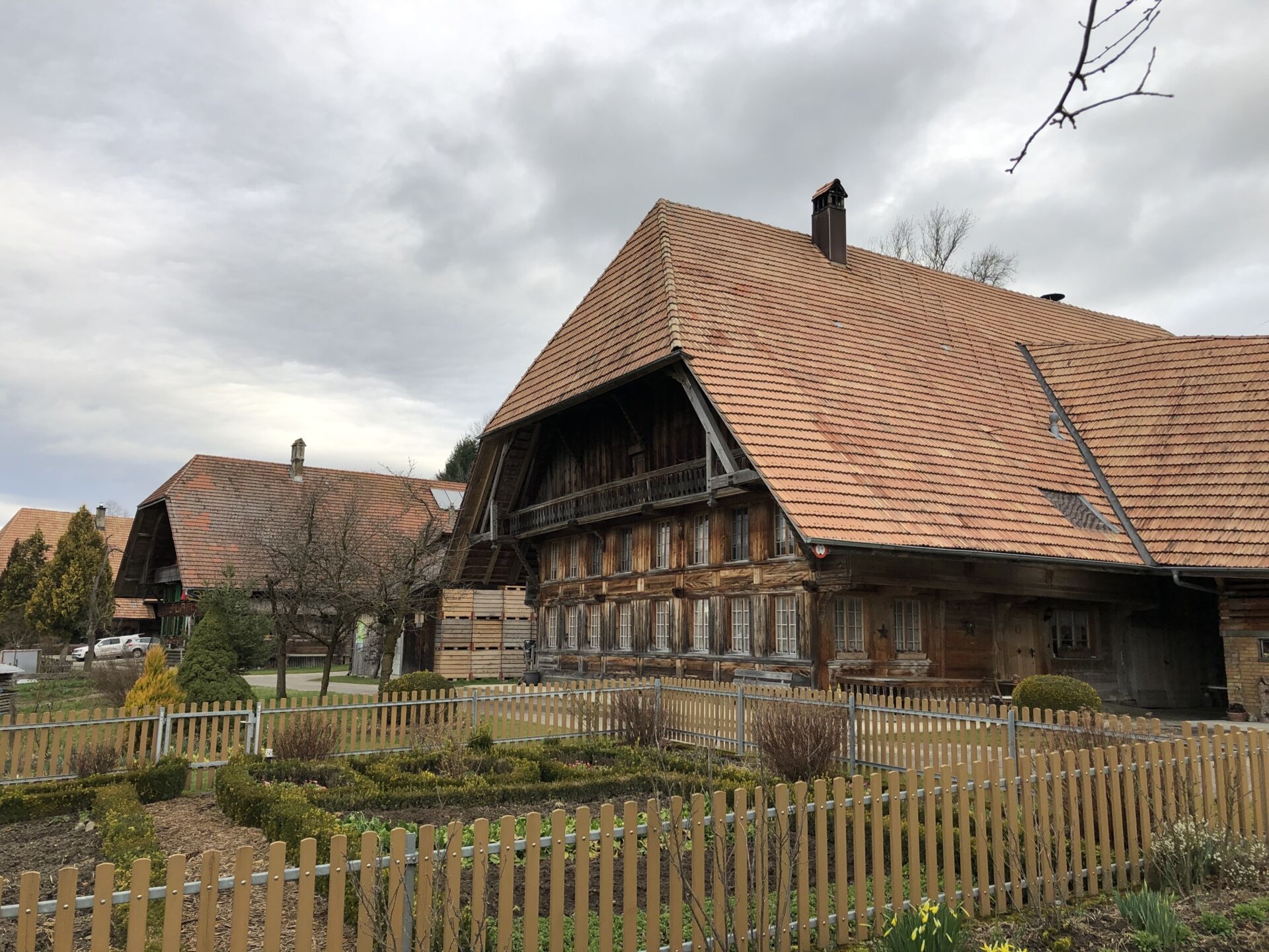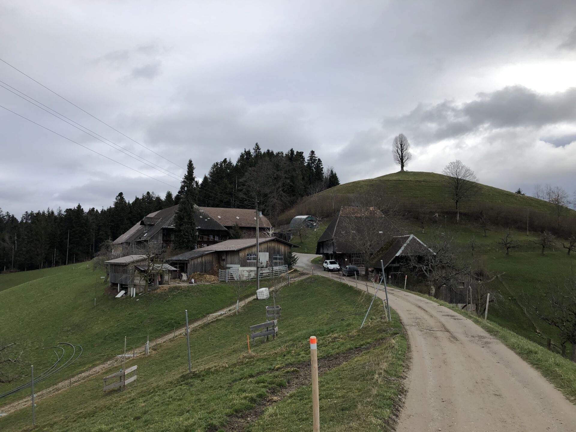Die Wanderung beginnt mit etwas Asphalt, aber gleich nach dem malerischen Zollbrücker Ortsteil Rieden folgen Feldwege. Der Aufstieg zur Lüdernalp ist wenig steil, langgezogen und einfach (T1/2). So bleibt viel Zeit zum Umherschauen. Der Himmel ist noch bedeckt, also liegt der Fokus auf das Nahe. Das sind schrullige Bäume, steile Matten, einsame Bauernhöfe, bellende Hunde, Bänke mit Schnitzereien. Fernsicht ist vorläufig Wunschdenken, nur im flacheren Norden und über dem Jura erspähe ich einen Hauch von blauer Himmel. Hauptsache trocken.