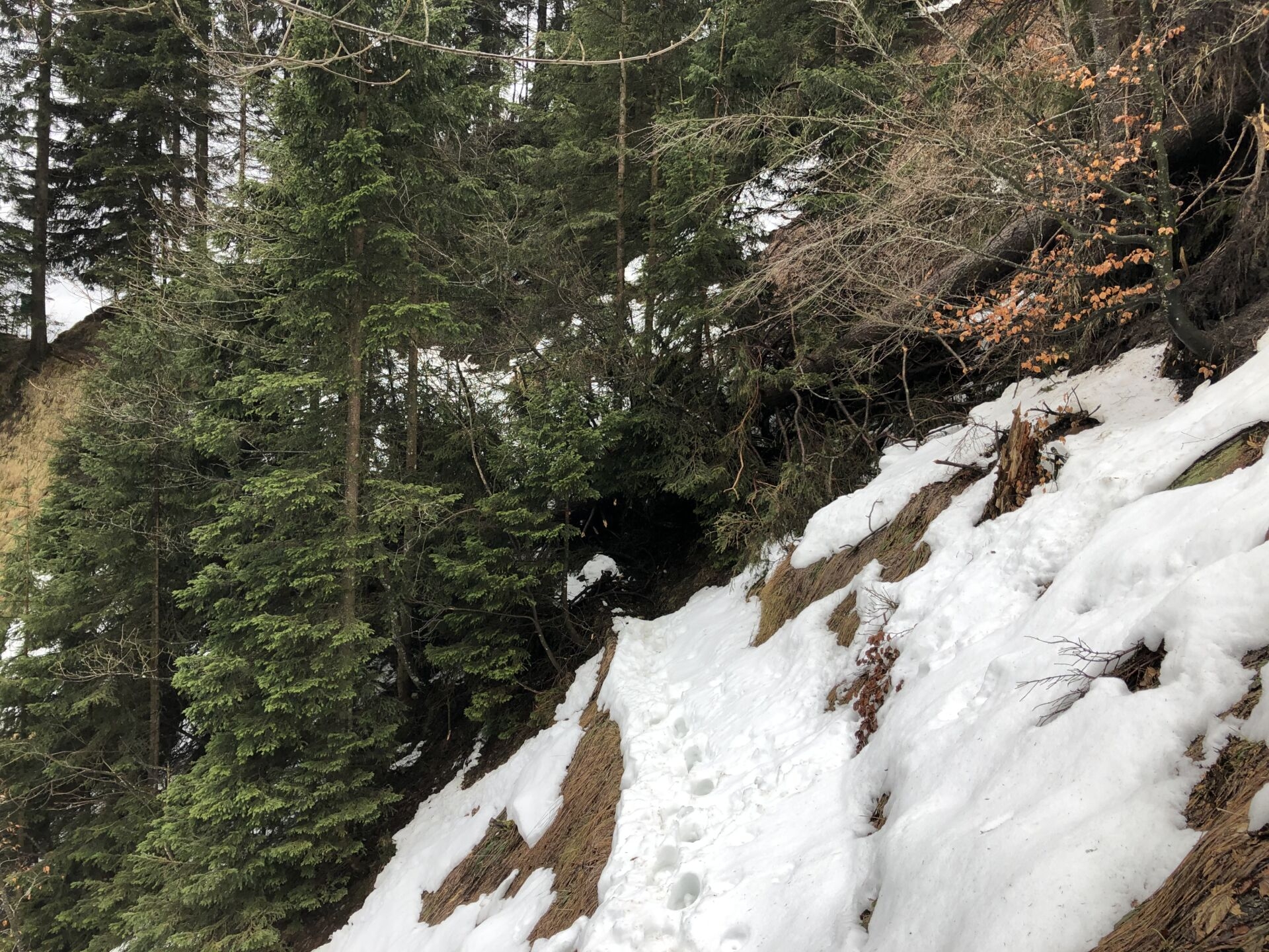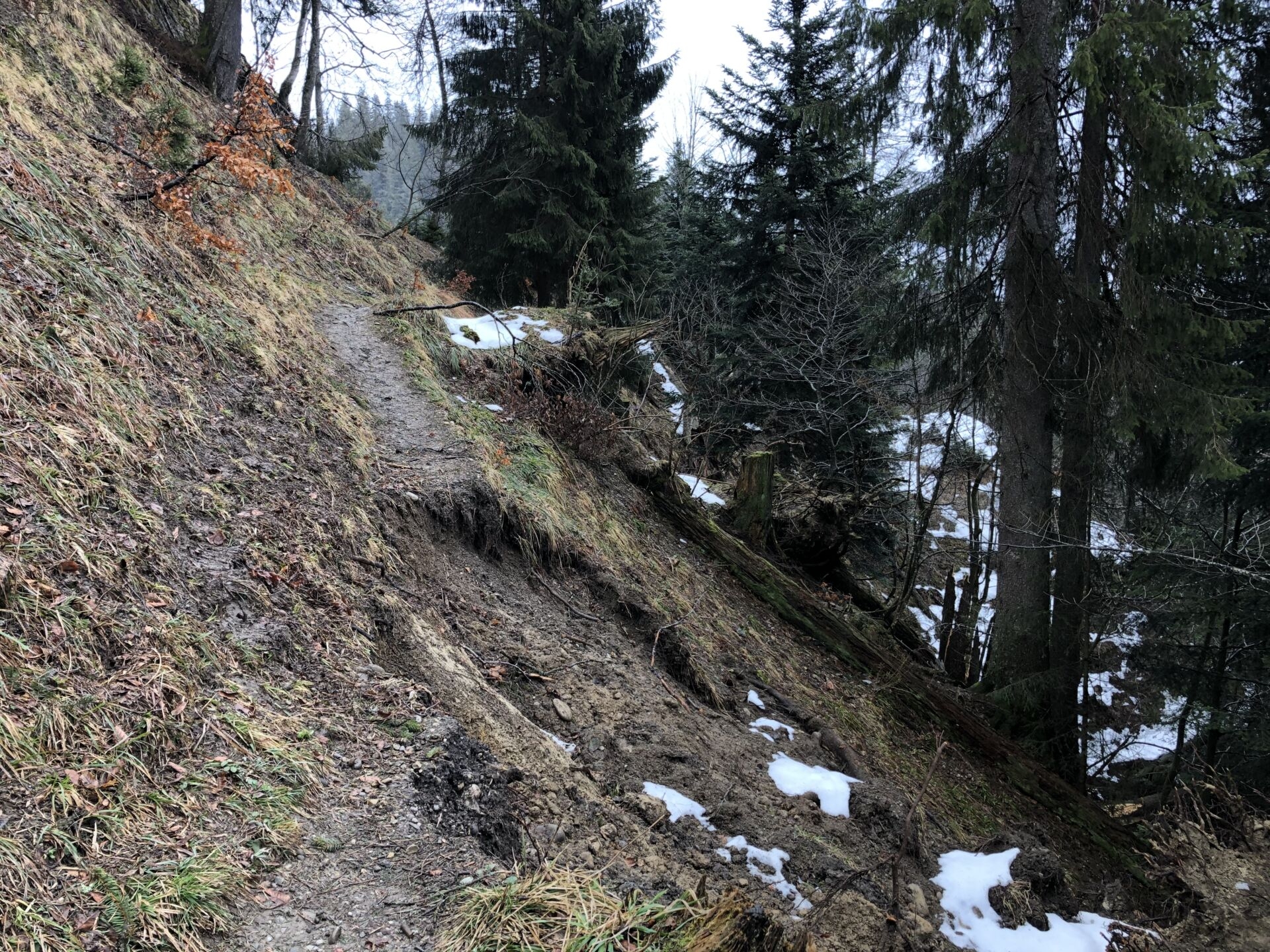 Nur folgt das lange Gratsurfen auf der reizvollen Panorama-Route zum Napf – und bald auch der erste Schnee. Von dem hat es auf der Nordseite noch mehr, als ich befürchtet hatte. Das macht aus dem T2 ein T3, vor allem in den steilen Waldpassagen, die zudem etliche Sturmschäden aufweisen. Viel Schnee betrifft vor allem das Nordstück um den Rotchnubel, die Sturmschäden die Steilhänge östlich der Geissgratflue. Da bin ich für einen Moment sogar froh um meine Spikes und die Stöcke (die danach beide für den Rest des Tages im Rucksack bleiben).