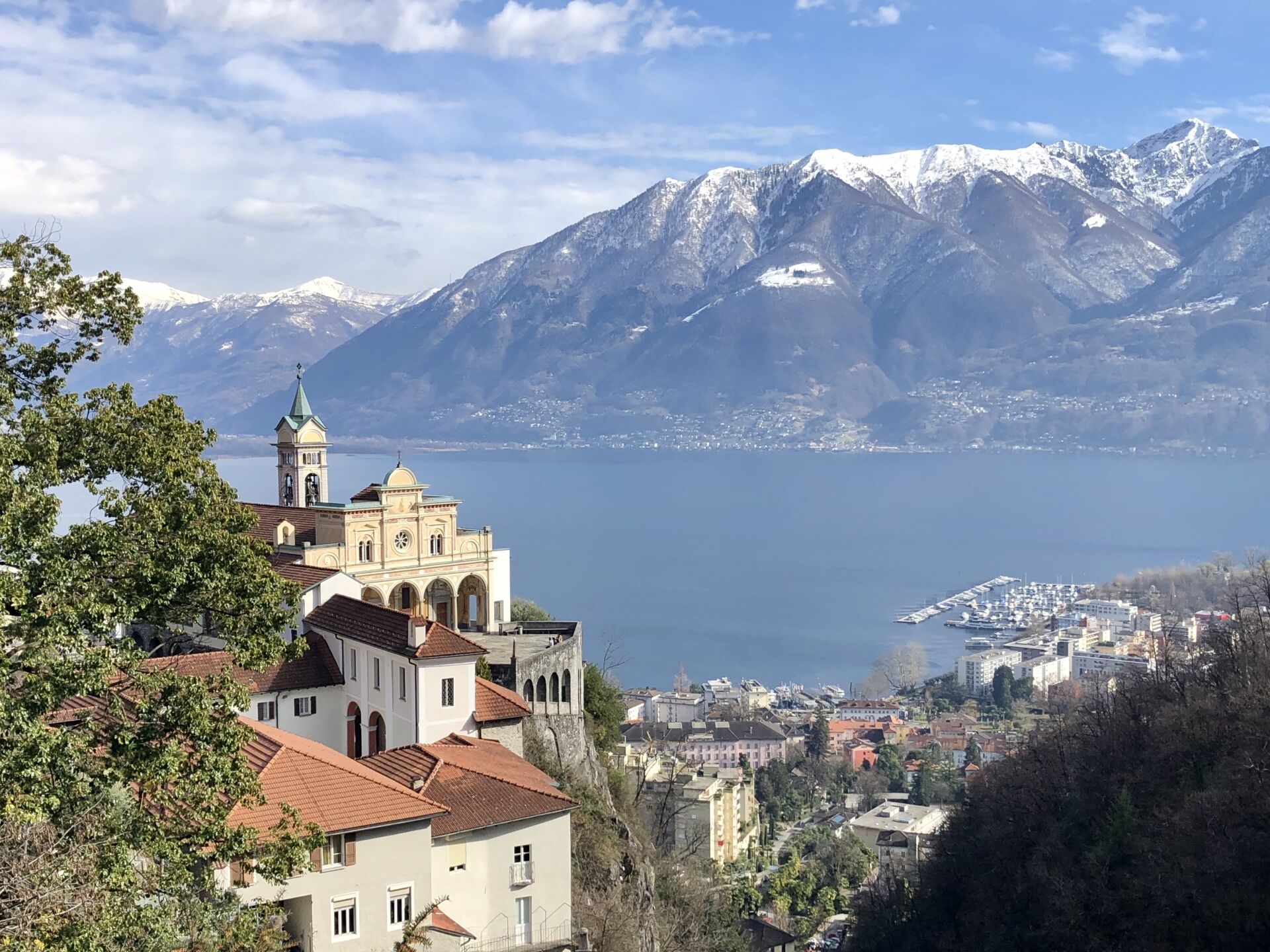 Heute bringt mich die Luftseilbahn nach Orsellina hinunter, von wo ich (anstatt die Standseilbahn zu nehmen) durch die enge Schlucht nach Locarno hinuntermäandre. Unübersehbar ist die Wallfahrtskirche auf dem heiligen Berg der Madonna del Sasso, die auf einem spektakulären Felsvorsprung steht. Ein Besuch würde sich sicher lohnen. Ich begnüge mich für heute mit einem Postkarten-Foto.