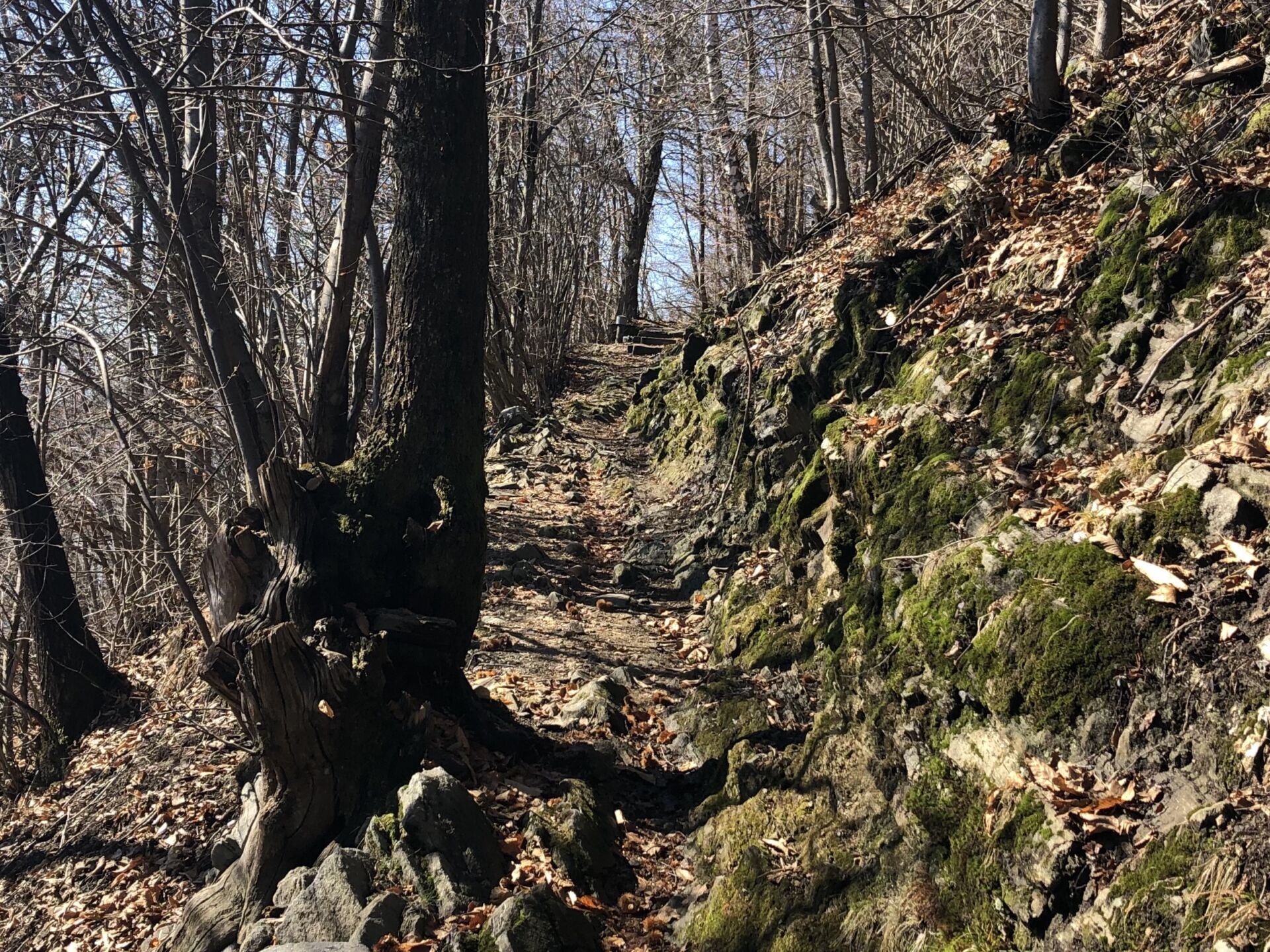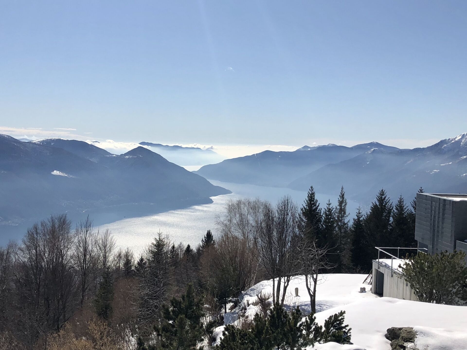 Bald noch mehr Freude macht die Fernsicht, die mit der Höhe kommt. Der frische Schnee der letzten Tage lässt die Gipfel rund um den Ceneri und den Lago Maggiore betörend aussehen. Das grelle Weiss überkompensiert das kahle Grau der entlaubten Kastanienwälder.