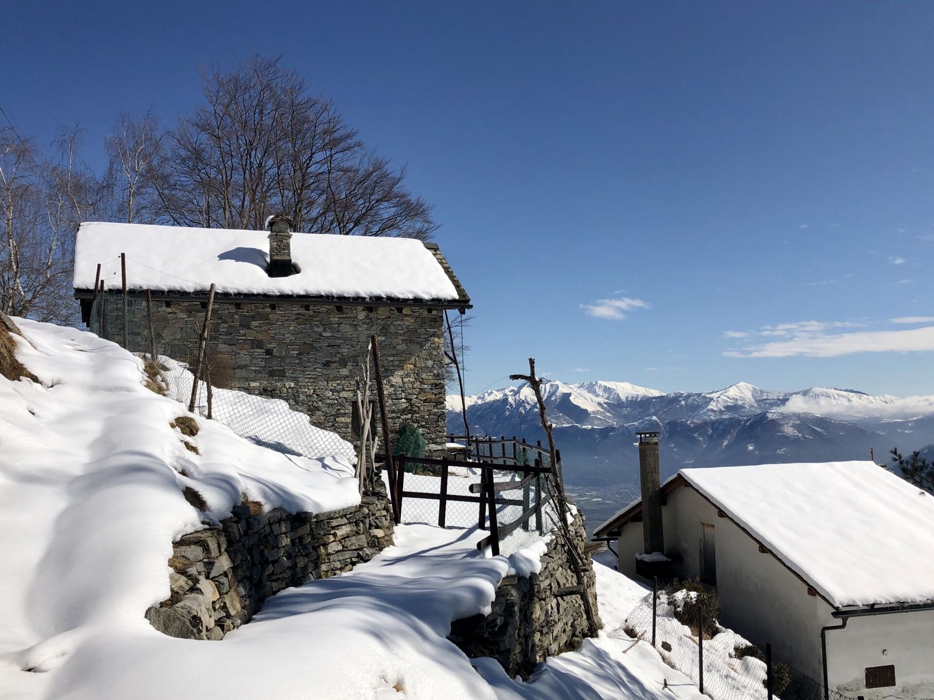 Ab der 1000m-Höhenlinie liegt noch etwas frischer Schnee auf dem Pfad. Der warme Föhn macht ihm zwar den Garaus, aber nicht schnell genug. Beim Pausenhalt in Cordonico – eine traumhaft gelegene Siedlung – überlege ich kurz, ob ich das Steigen fortsetzen oder lieber der Höhenlinie folgend nach San Bernardo wandern soll. Die bequemen Trailrunner an meinen Füssen sind wahrlich ungeeignet für langes Schneestapfen.