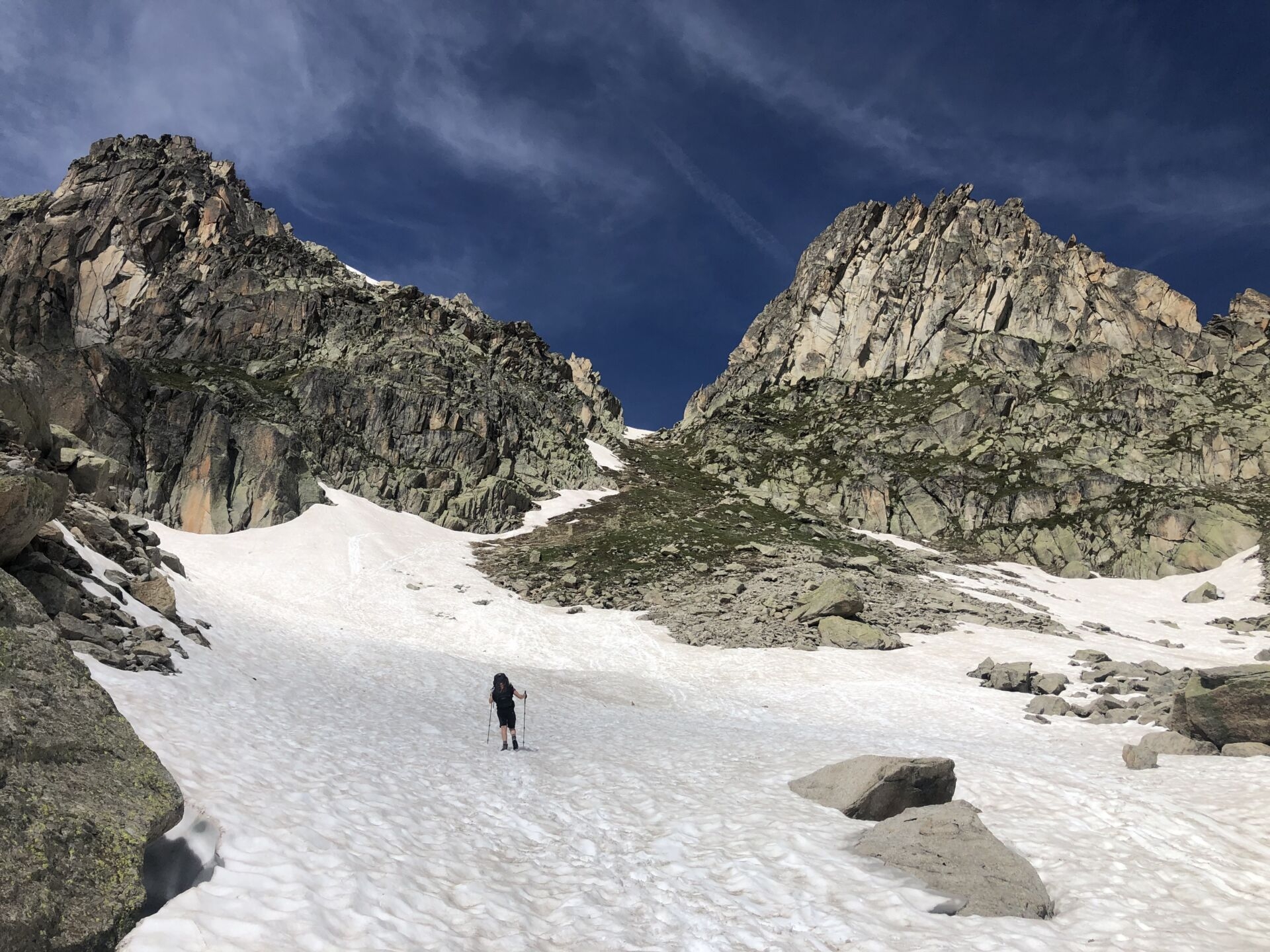 Auf dem Pass atme ich zuerst einmal auf. Nicht aus Erschöpfung, sondern weil das steile Couloir gegen Osten firnfrei ist. Damit steht einem sicheren Abstieg nichts entgegen. Denn auch mit Steigeisen hätte die Steilheit meine Komfortgrenze wohl überschritten. Das haben andere schon mit dem Leben bezahlt. Heute werden wir nicht einmal die Spikes brauchen.