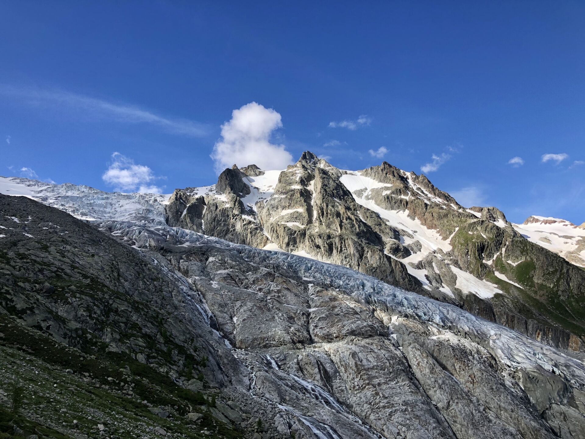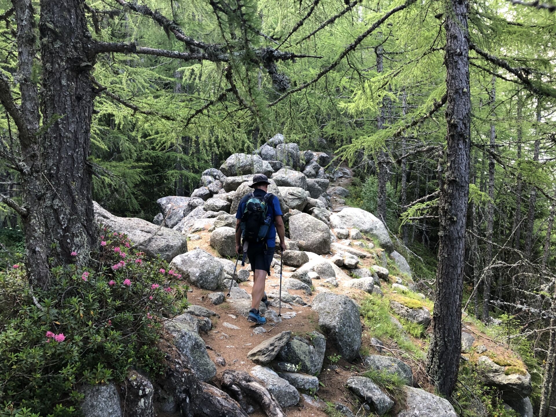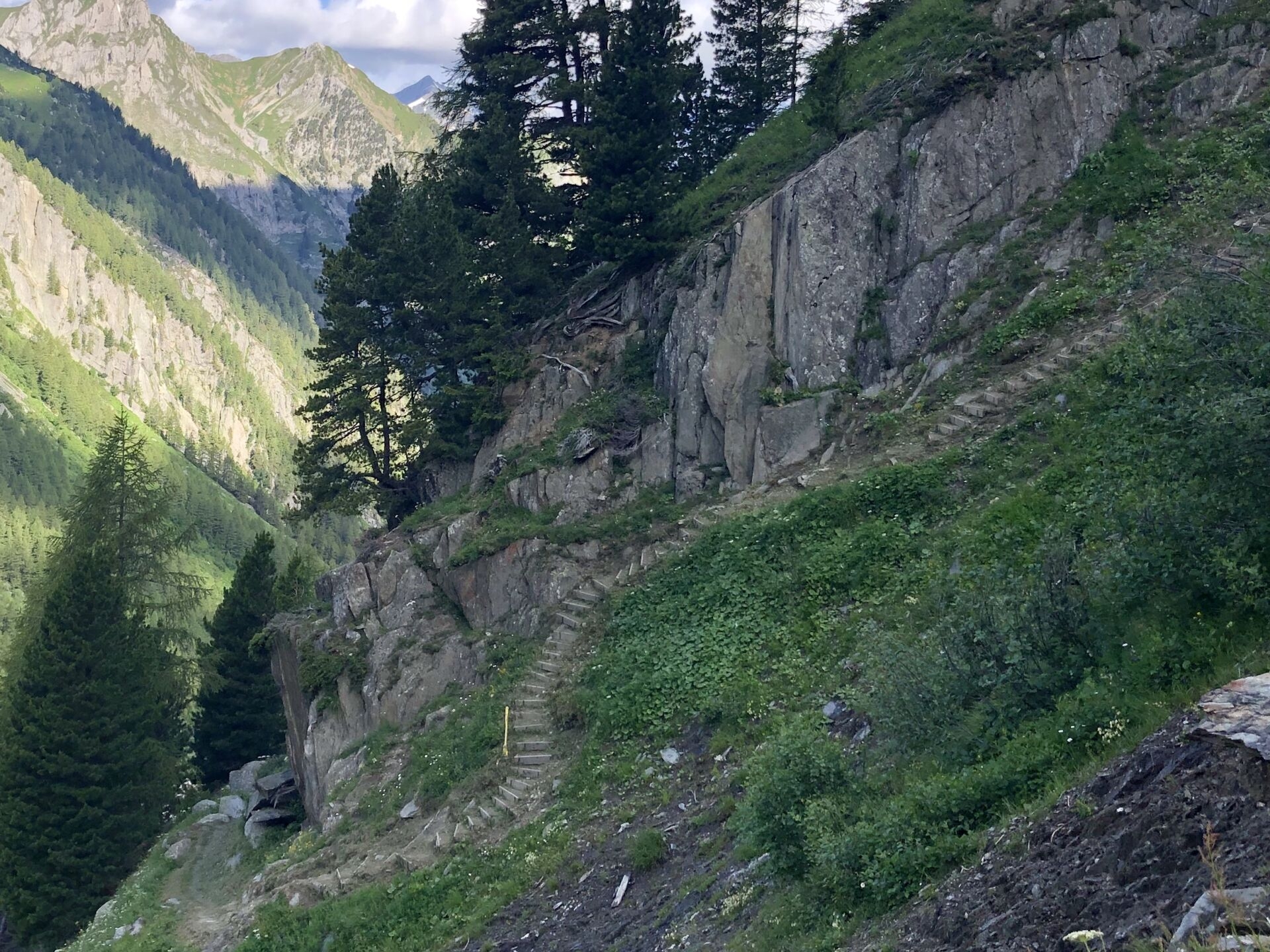 Jetzt beginnt die lange Steigung zur Fenêtre d‘Arpette, die rund 1100 Meter höher liegt. Der Pfad ist gerade säuberlich freigemäht worden. Es ist der 1. Juli, die TMB-Saison ist eröffnet. Darum wohl die gute Pflege. Wir steigen zunächst durch Wiesen hoch, dann passieren wir die Krete einer mit Lärchen bewaldeten, blockigen Moräne. Es folgen steile Flanken, die mit gepflegten Treppenstufen entschärft sind, schliesslich erreichen wir die Geröllhalden. Der Aufstieg entlang des Gletschertals ist wesentlich abwechslungsreicher, als wir gedacht hatten.