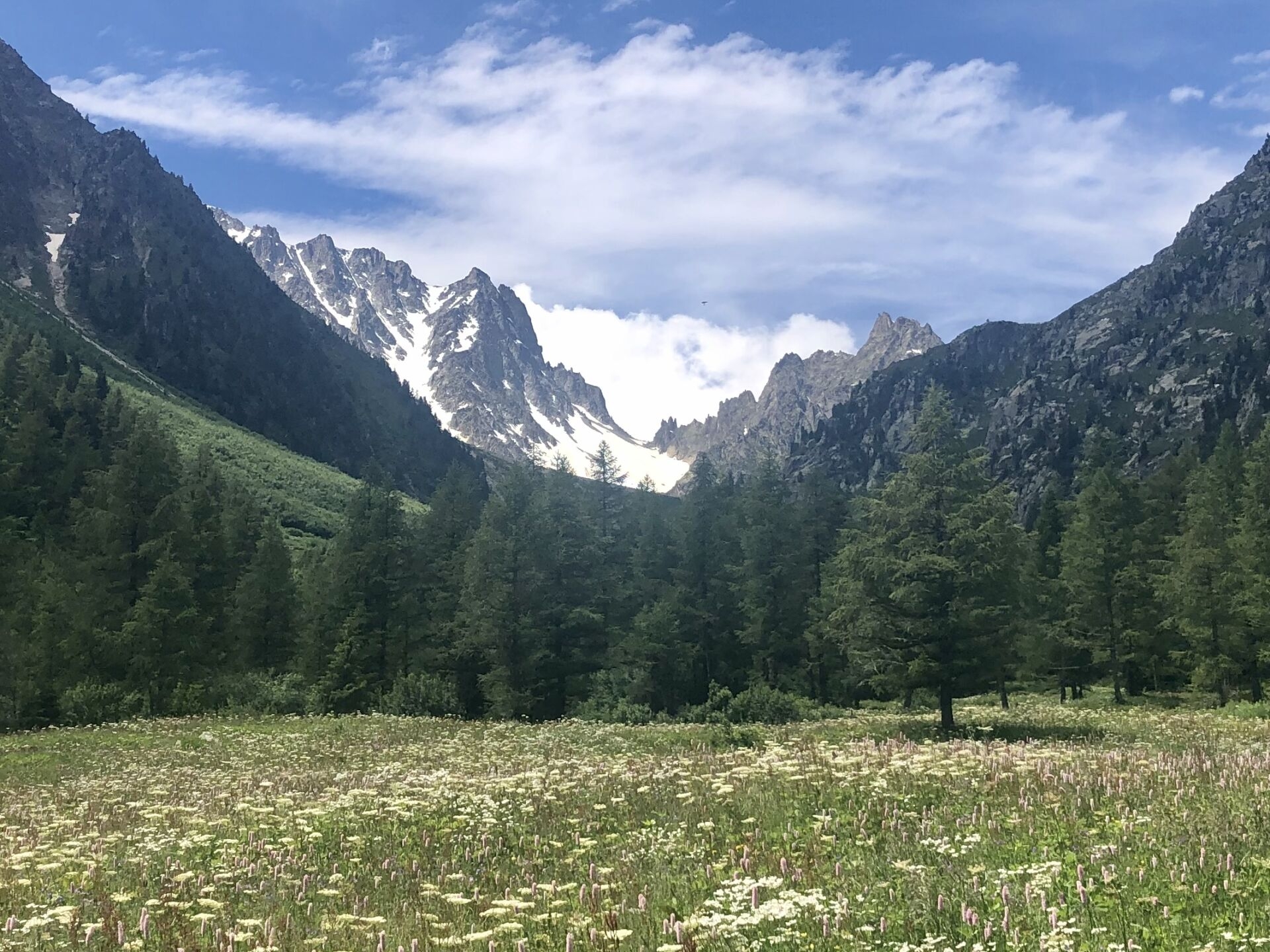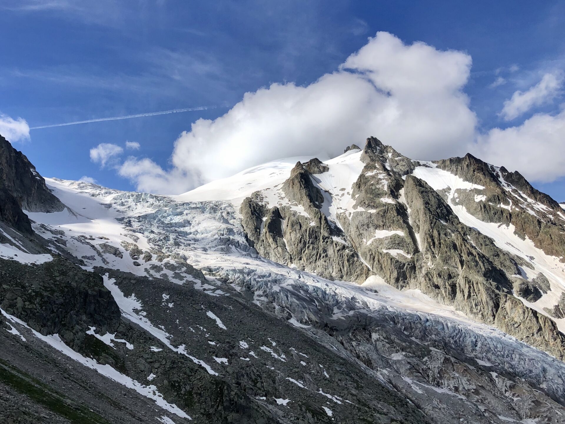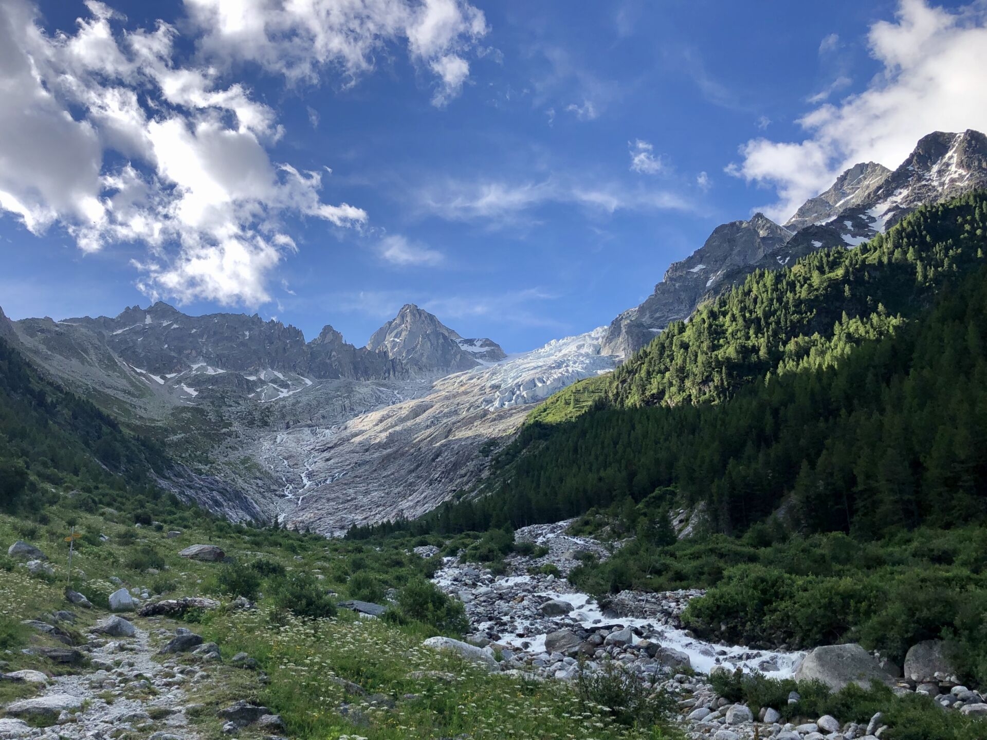 Jetzt beginnt die lange Steigung zur Fenêtre d‘Arpette, die rund 1100 Meter höher liegt. Der Pfad ist gerade säuberlich freigemäht worden. Es ist der 1. Juli, die TMB-Saison ist eröffnet. Darum wohl die gute Pflege. Wir steigen zunächst durch Wiesen hoch, dann passieren wir die Krete einer mit Lärchen bewaldeten, blockigen Moräne. Es folgen steile Flanken, die mit gepflegten Treppenstufen entschärft sind, schliesslich erreichen wir die Geröllhalden. Der Aufstieg entlang des Gletschertals ist wesentlich abwechslungsreicher, als wir gedacht hatten.