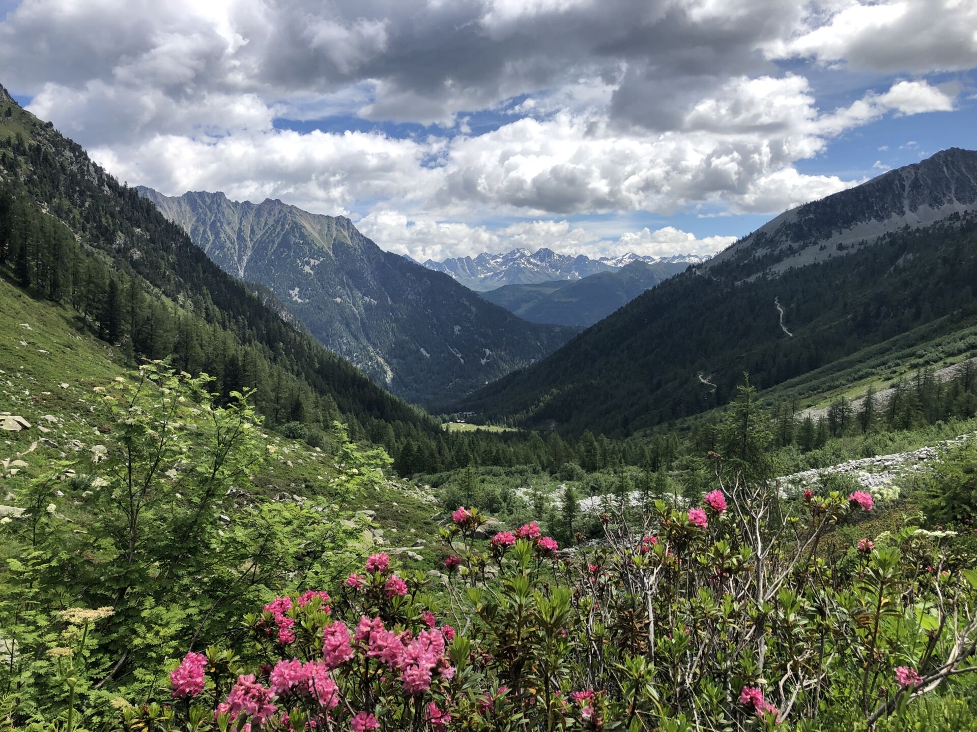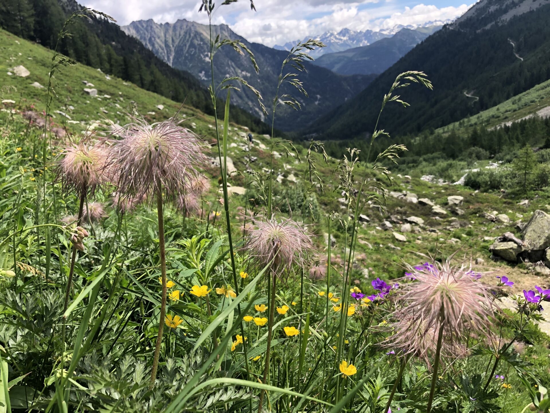 Zunächst sind es einige Alpenrosen, die die Rückkehr zur Biomasse ankündigen, bald sind es unzählige Bergblumen. Könnte ich sie nur alle aufzählen, aber leider sind meine botanischen Kenntnisse nur elementar! Je weiter wir hinunter steigen, je majestätischer wird das Blumenfest, schliesslich waten wir geradezu durch die farbige Pracht.